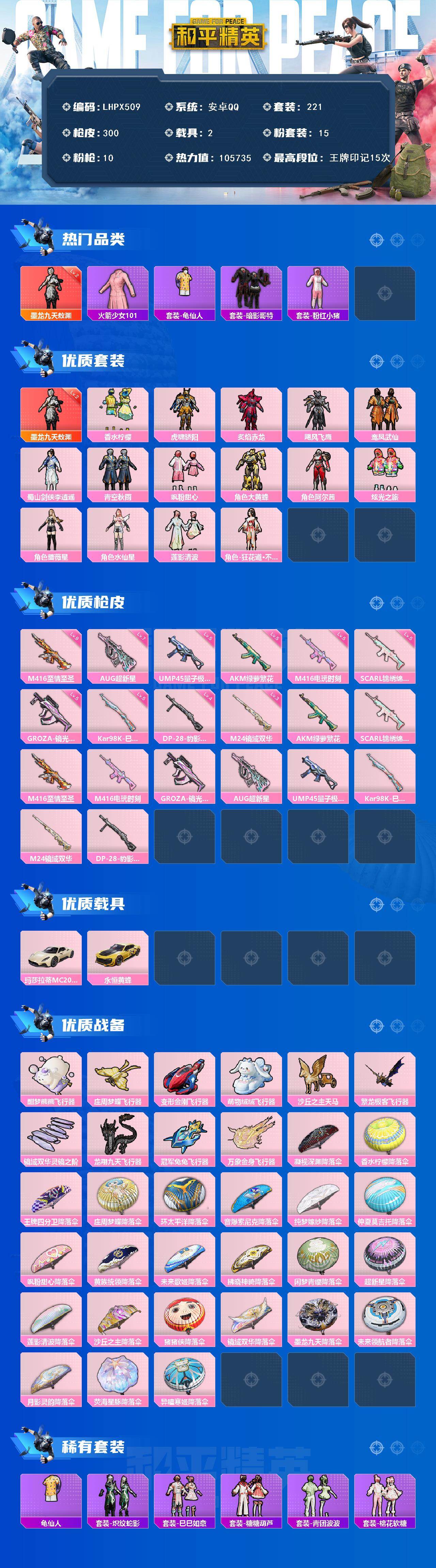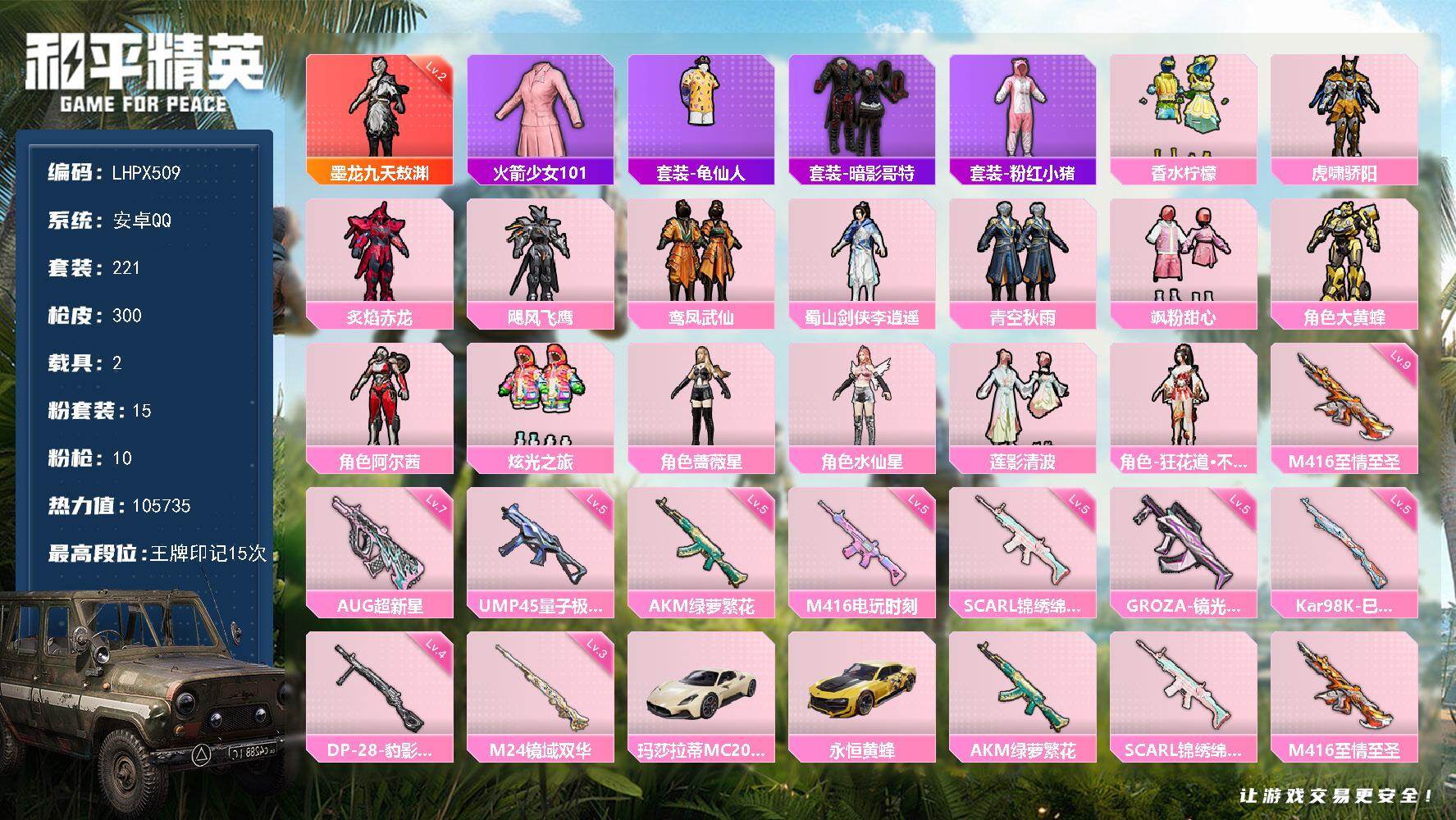 [15649874]老101【店主推荐捡漏号!可直接换绑】安卓 手Q-1神装-15粉装-10特效枪-2载具-11粉色飞行器-105735热力值-15王牌印记-221套装-300枪皮【红色神装等级】:墨龙九天-敖渊(二级)【红色角色神装】:墨龙九天-敖渊【热门品类】:套装-火箭少女101,套装-龟仙人,套装-暗影哥特,套装-粉红小猪【粉色套装】:粉装-香水柠檬,粉装-虎啸骄阳,粉装-炙焰赤龙,粉装-飓风飞鹰,粉装-鸾凤武仙,蜀山剑侠-李逍遥,粉装-青空秋雨,粉装-飒粉甜心,角色-大黄蜂,角色-阿尔茜,粉装-炫光之旅,角色-蔷薇星,角色-水仙星,粉装-莲影清波,角色-狂花道·不知火舞粉色枪皮等级】:AKM-绿萝繁花(五级),SCAR-L-锦绣绵绵(五级),M416-至情至圣(九级),M416-电玩时刻(五级),GROZA-镜光银凌(五级),AUG-超新星(七级),UMP45-量子极限(五级),Kar98K-巳巳如意(五级),M24-镜域双华(三级),DP-28-豹影疾电(四级)【粉色载具】:玛莎拉蒂MC20(星石白),永恒黄蜂【粉色枪皮】:AKM-绿萝繁花,SCAR-L-锦绣绵绵,M416-至情至圣,M416-电玩时刻,GROZA-镜光银凌,AUG-超新星,UMP45-量子极限,Kar98K-巳巳如意,M24-镜域双华,DP-28-豹影疾电【粉色飞行器】:酣梦熊熊飞行器,庄周梦蝶飞行器,变形金刚飞行器,萌物绒绒飞行器,沙丘之主天马,繁龙极客飞行器,镜域双华-灵镜之阶,龙翔九天飞行器,冠军兔兔飞行器,万象金身飞行器
