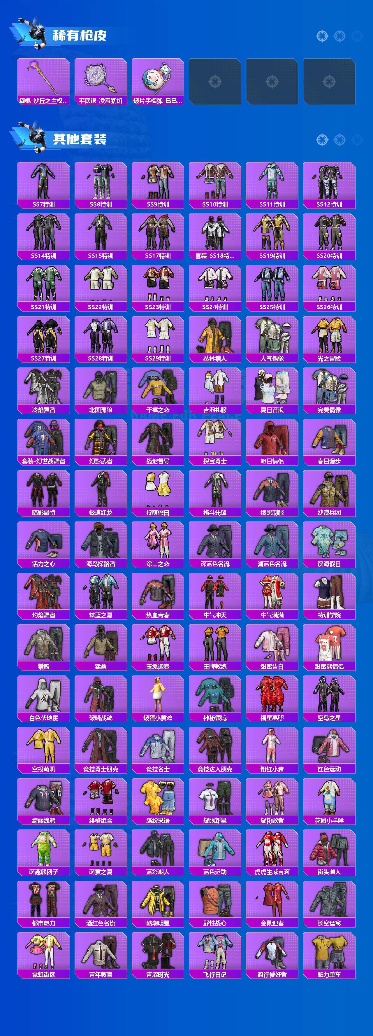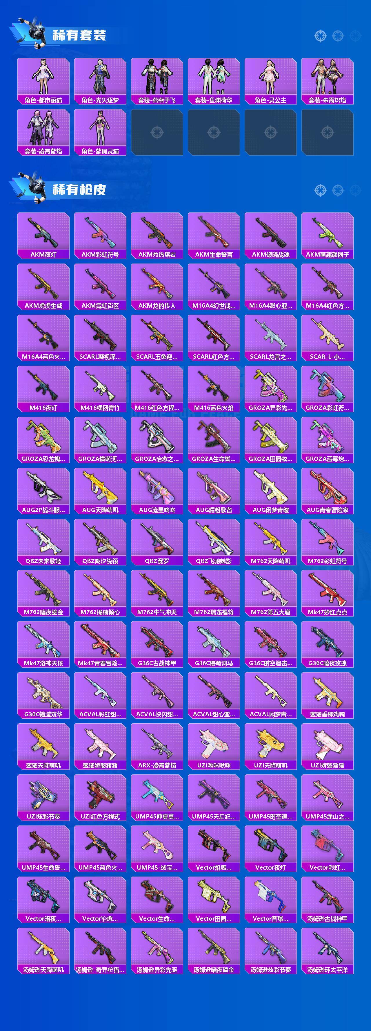- [11868422]总资产:72.1M 1近战传说 12传说枪械 哈夫币:1.271K 可二次 可修改实名 优质装备:近战-北极星 烽火地带段位:铂金 全面战场段位:无段位 传说武器皮肤:AK-12突击步枪-特斯拉线圈,SR-3M紧凑突击步枪-特斯拉线圈,UZI冲锋枪-特斯拉线圈,勇士冲锋枪-能天使-午夜邮差,725双管霰弹枪-送葬人-无题密令,M4A1突击步枪-阿米娅,CAR-15突击步枪-阿米娅,复合弓-黑-天际线,SMG45冲锋枪-骑士,M4A1突击步枪-蚀金玫瑰,AK-12突击步枪-夜鹰 史诗武器皮肤:PKM通用机枪-蝮蛇,SVD狙击步枪-荒野求生,SR-3M紧凑突击步枪-荒野求生,PKM通用机枪-守夜人,M1014霰弹枪-林中猎手,PSG-1射手步枪-无垢,MP7冲锋枪-无垢,腾龙突击步枪-无垢,SV-98狙击步枪-林中猎手,PTR-32突击步枪-英雄,M250通用机枪-囚徒,PKM通用机枪-荒野求生,M700狙击步枪-守夜人,AS Val突击步枪-尖端治疗,SG552突击步枪-尖端治疗,S12K霰弹枪-曙光,SVD狙击步枪-阿萨拉工艺,Ash-12战斗步枪-守夜人,SR-25射手步枪-尖端治疗,MP5冲锋枪-深海恐惧,勇士冲锋枪-深海恐惧,SG552突击步枪-深海恐惧