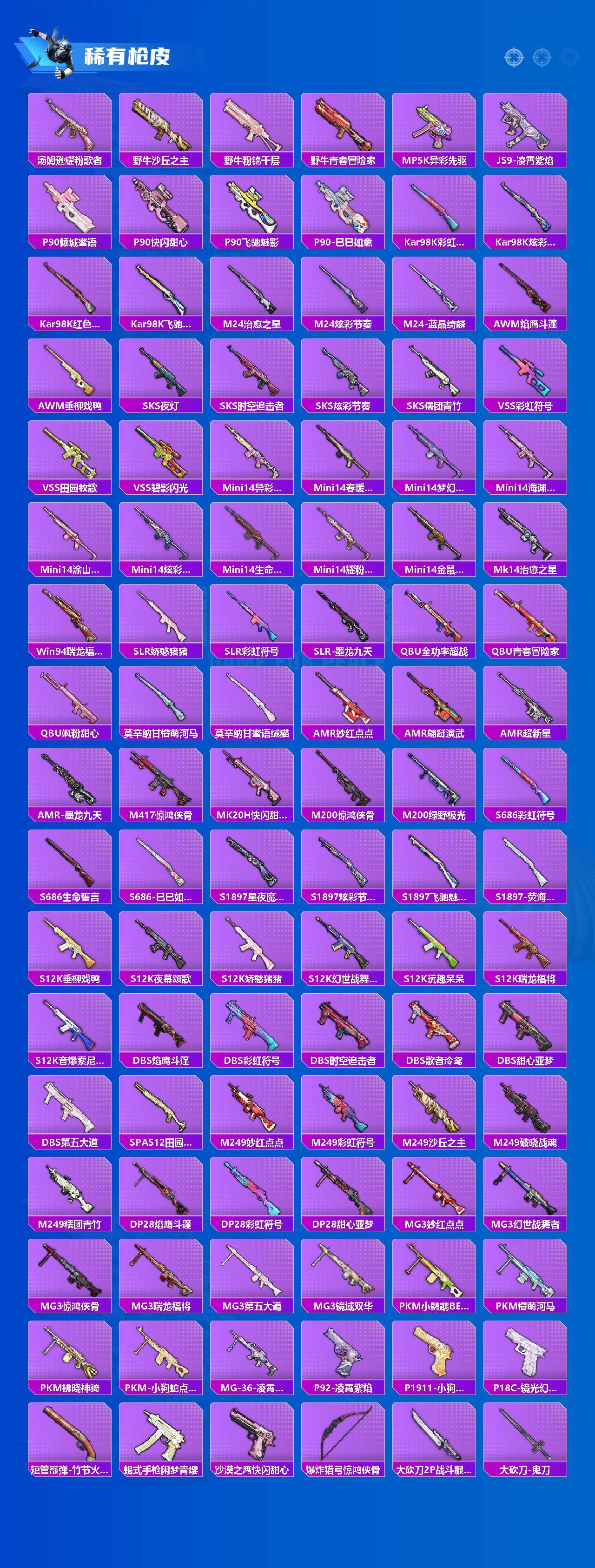 AKM-绿萝繁花,SCAR-L-锦绣绵绵,M416-至情至圣,M416-电玩时刻,GROZA-镜光银凌,AUG-超新星,UMP45-量子极限,Kar98K-巳巳如意,M24-镜域双华