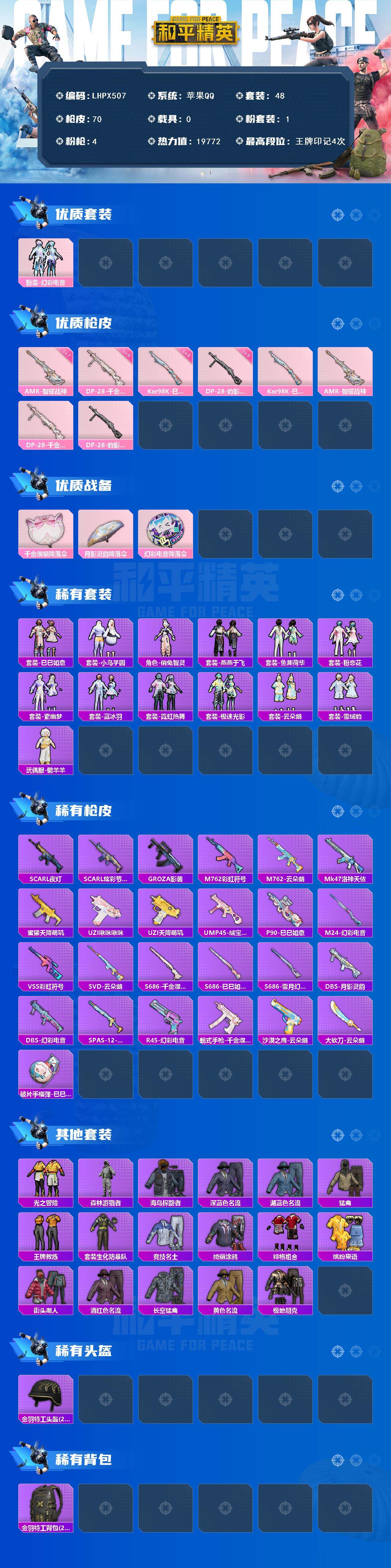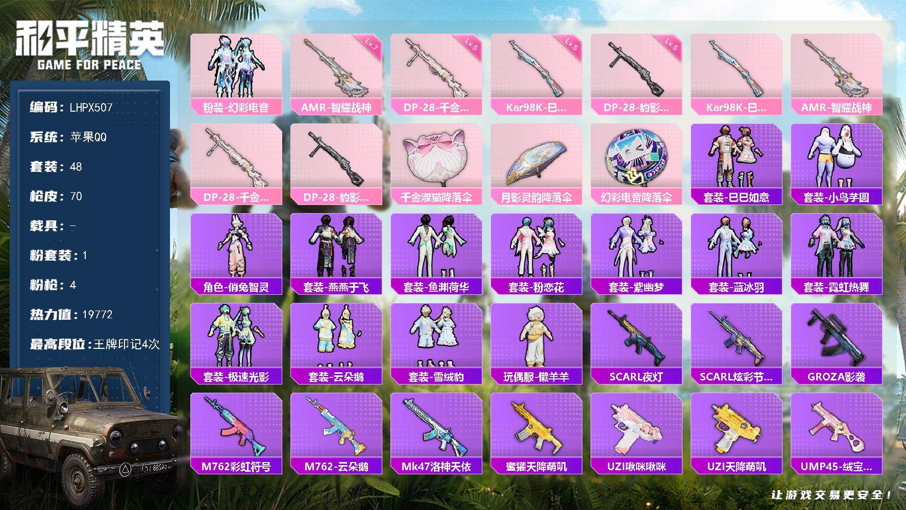 [15649878]【店主推荐捡漏号!可直接换绑】苹果 手Q-1粉装-4特效枪-0载具-0粉色飞行器-19772热力值-4王牌印记-48套装-70枪皮【粉色套装】:粉装-幻彩电音【粉色枪皮等级】:Kar98K-巳巳如意(五级),AMR-智耀战神(七级),DP-28-千金淑猫(五级),DP-28-豹影疾电(五级)【粉色枪皮】Kar98K-巳巳如意,AMR-智耀战神,DP-28-千金淑猫,DP-28-豹影疾电
