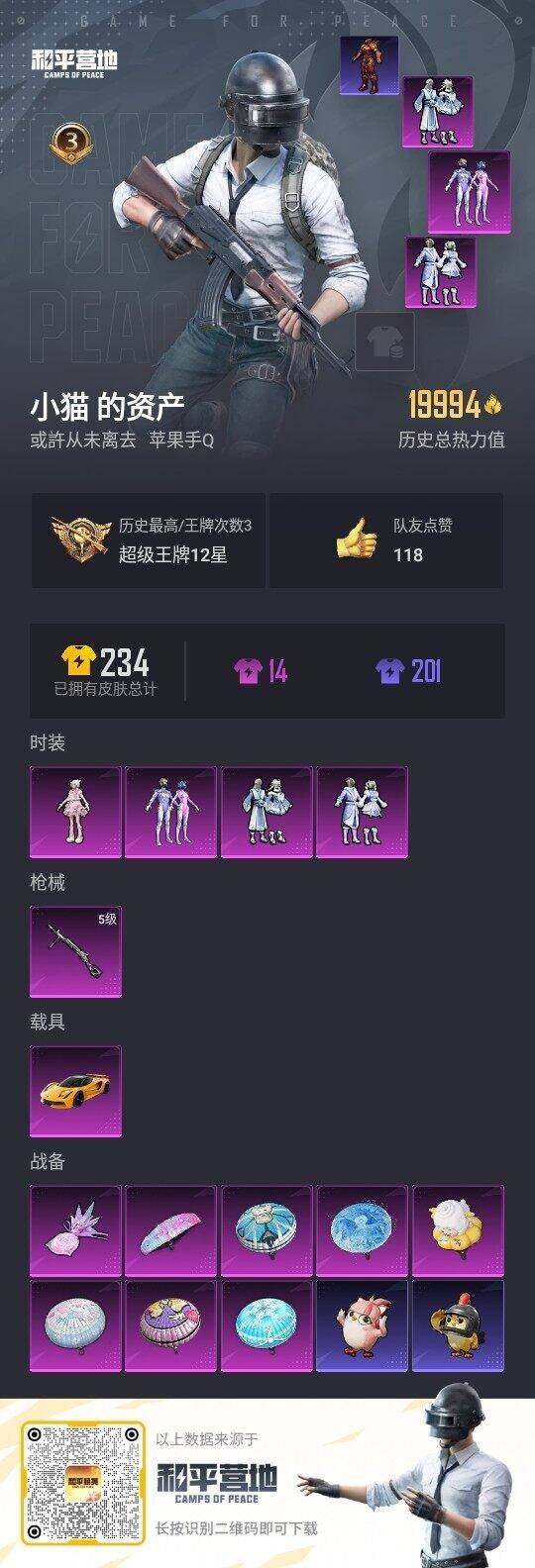 - PX_2095562- 苹果手Q-4王牌印记-有战神框-3粉装-2特效枪-1载具-22213热力值-56套装-69枪皮-1卓越印记-0传奇印记 【3粉装】,雪国幻梦,梦幻火箭,绚金战神 【2特效枪】AKM-炫紫旋律-5级 M416-风花雪月-5级 【4稀有紫装】,萌熊伴侣背包(3级),暗影哥特,浪漫天命,萌熊伴侣背包(2级), 【1稀有载具】,特斯拉Roadster(水滴蓝), 【56稀有时装】
