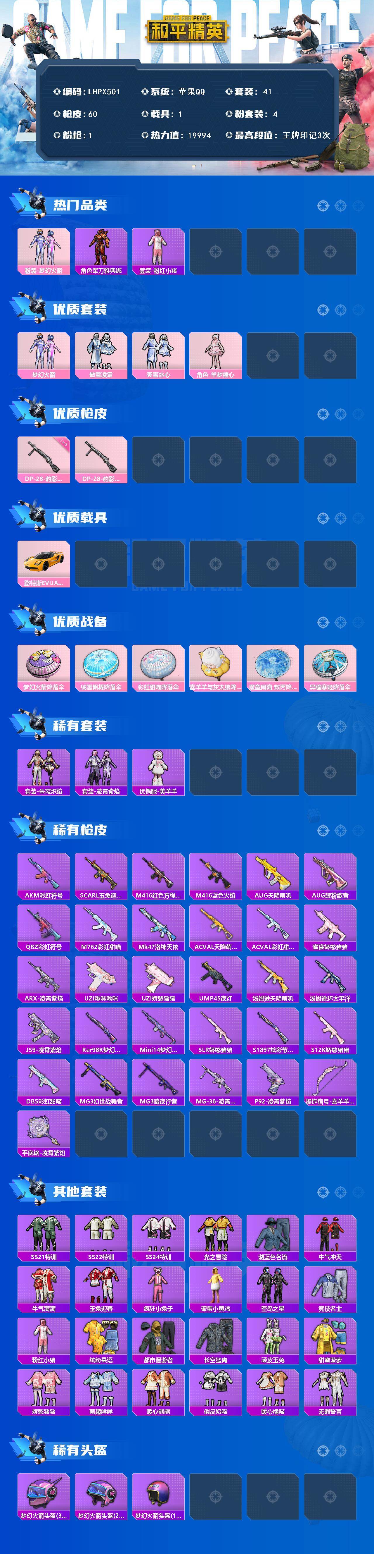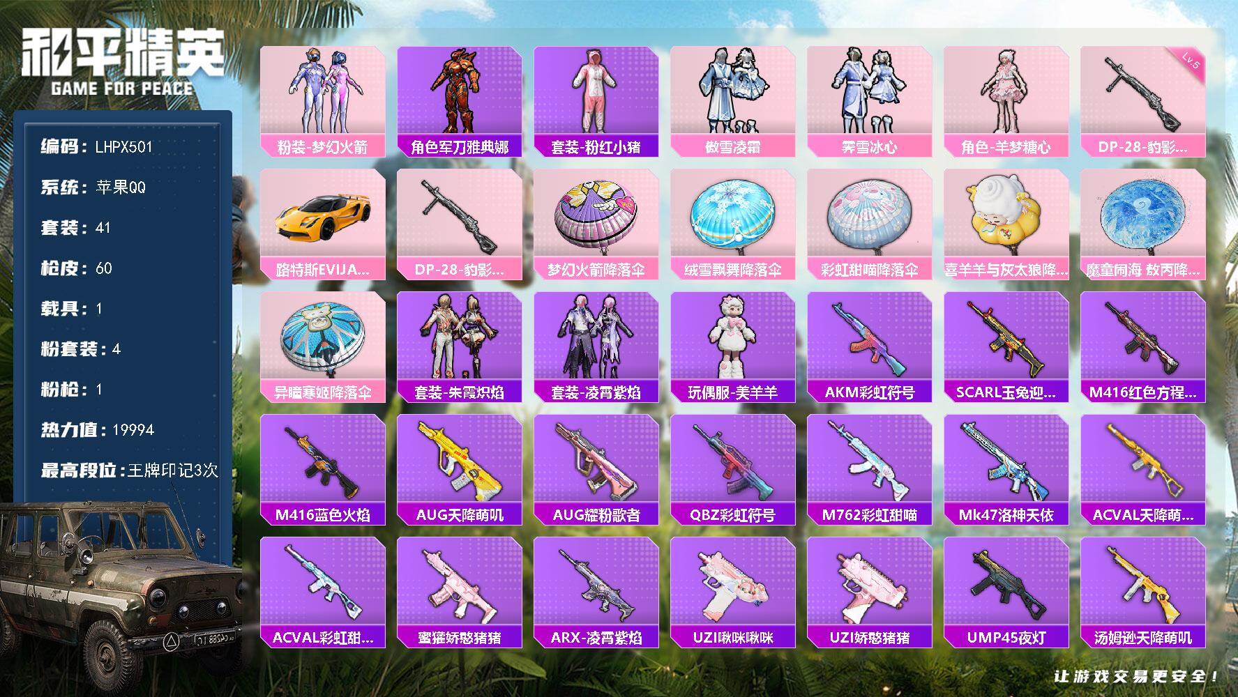 [15649941]【店主推荐捡漏号!可直接换绑】苹果 手Q-4粉装-1特效枪-1载具-1粉色飞行器-19994热力值-3王牌印记-41套装-60枪皮【热门品类】:粉装-梦幻火箭,角色-军刀雅典娜,套装-粉红小猪【粉色套装】:粉装-梦幻火箭,粉装-傲雪凌霜,粉装-霁雪冰心,角色-羊梦糖心【粉色枪皮等级】:DP-28-豹影疾电(五级)【粉色载具】:路特斯EVIJA(星际黄)【粉色枪皮】:DP-28-豹影疾电