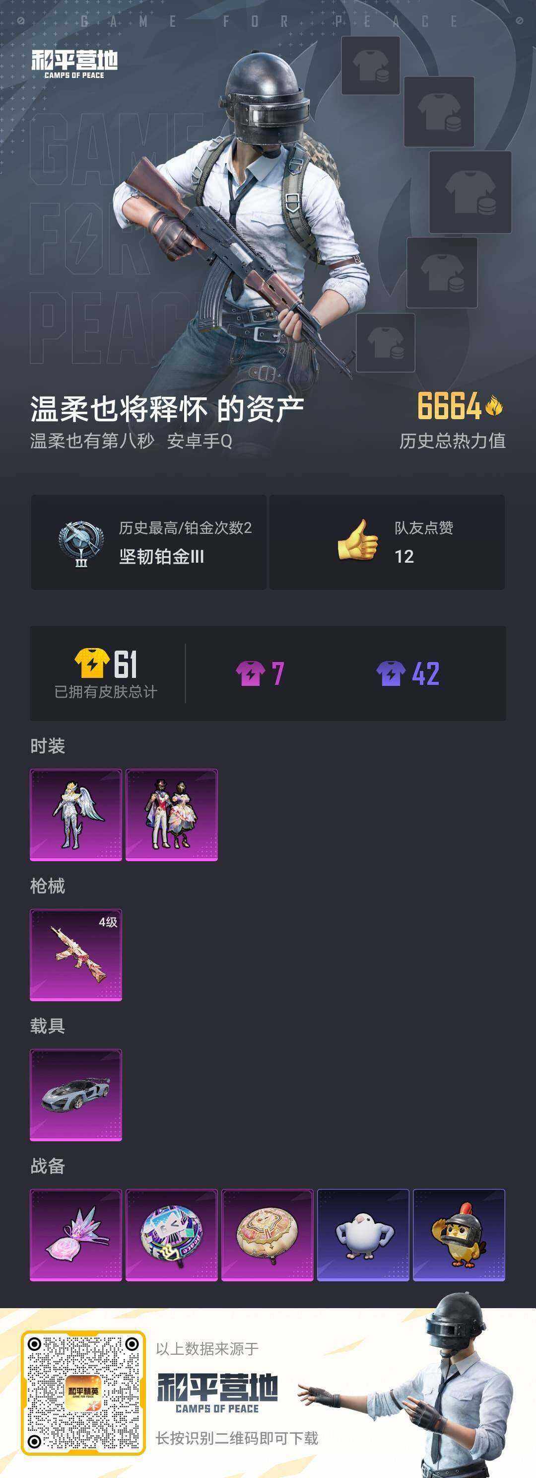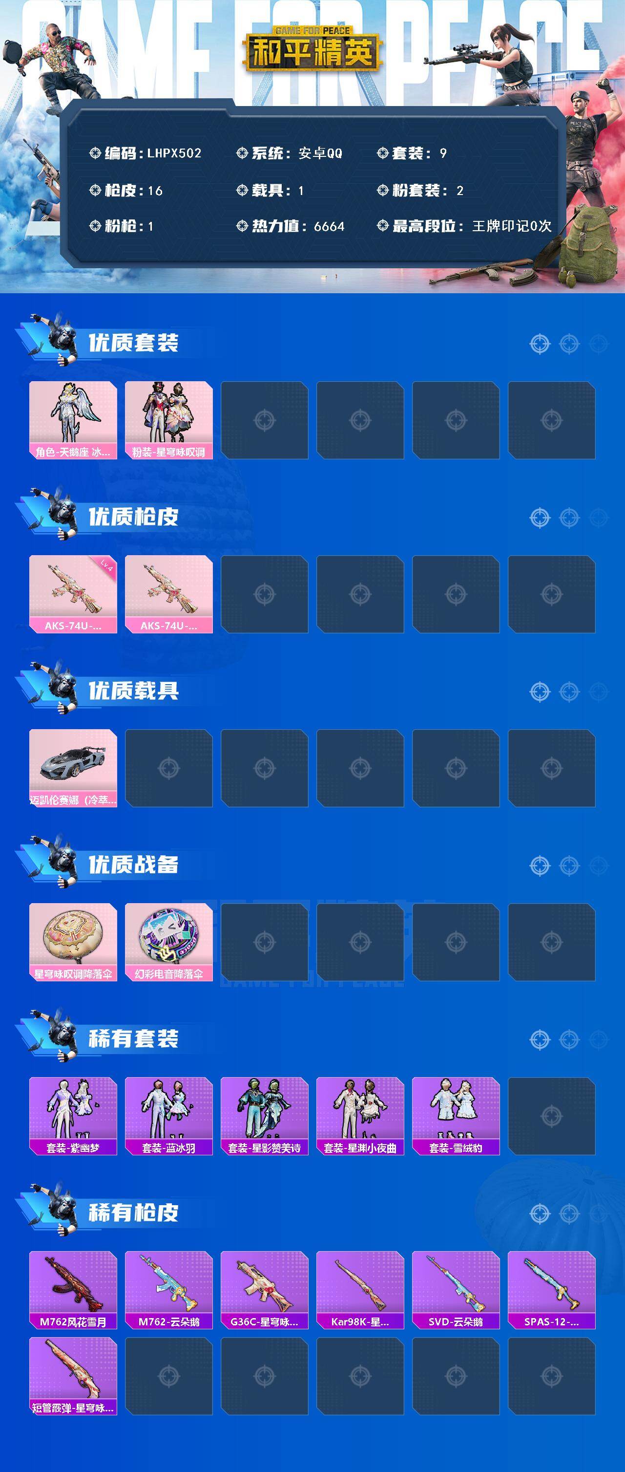 [15649952]安卓 手Q-2粉装-1特效枪-1载具-1粉色飞行器-6664热力值-0王牌印记-9套装-16枪皮 【粉色套装】:角色-天鹅座 冰河,粉装-星穹咏叹调 【粉色枪皮等级】:AKS-74U-星穹咏叹调(四级) 【粉色载具】:迈凯伦塞纳(冷萃蓝) 【粉色枪皮】:AKS-74U-星穹咏叹调 【粉色降落伞】:星穹咏叹调降落伞,幻彩电音降落伞 【稀有套装】:套装-紫幽梦,套装-蓝冰羽,套装-星影赞美诗,套装-星渊小夜曲,套装-雪绒豹 【稀有枪皮】:M762-风花雪月,M762-云朵鹅,G36C-星穹咏叹调,Kar98K-星穹咏叹调,SVD-云朵鹅,SPAS-12-云朵鹅,短管霰弹-星穹咏叹调 【营地ID】:1030996344