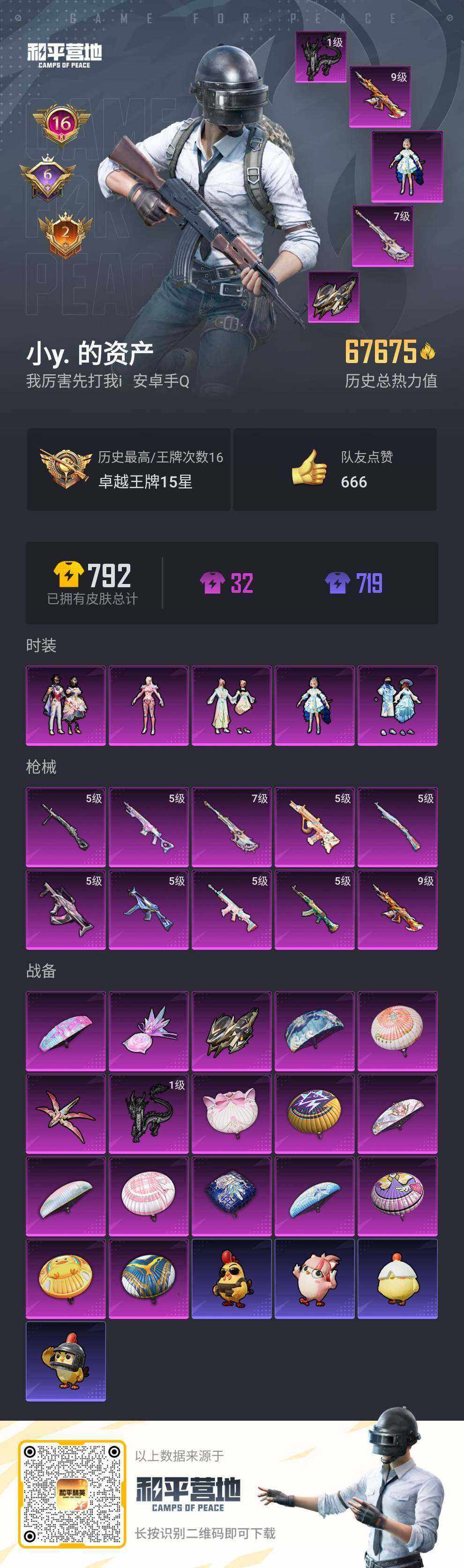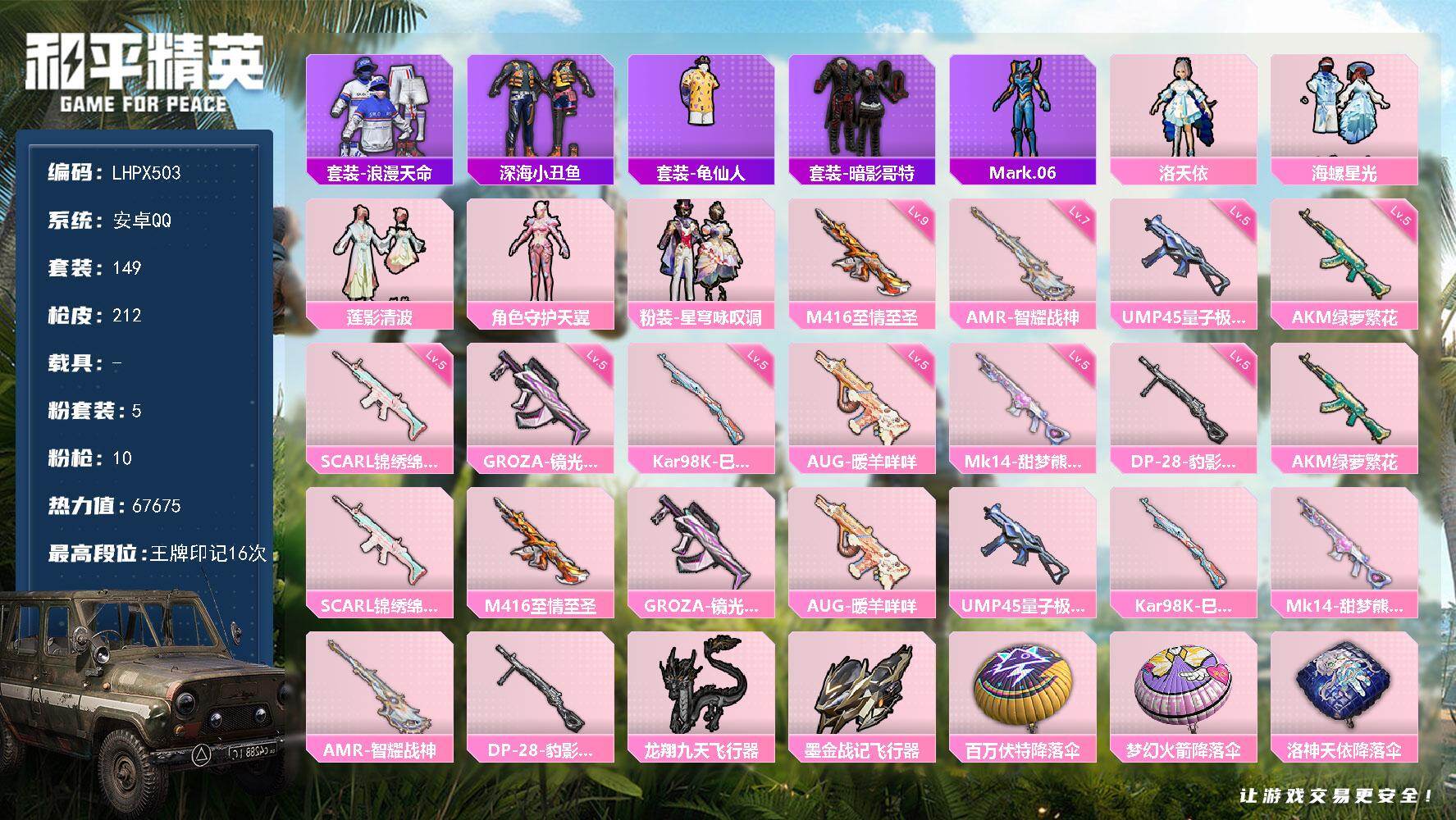 [15649955]安卓 手Q-5粉装-10特效枪-0载具-4粉色飞行器-67675热力值-16王牌印记-149套装-212枪皮