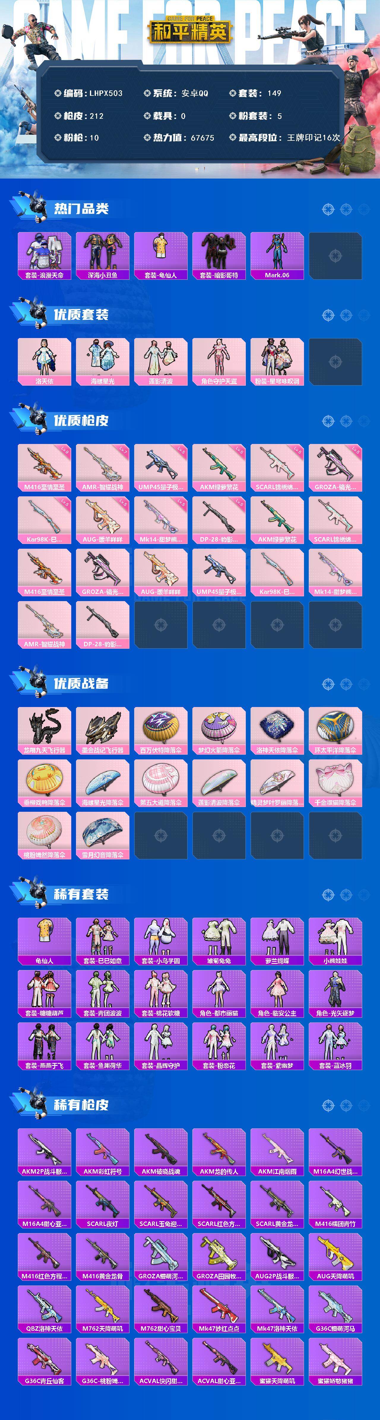 [15649955]安卓 手Q-5粉装-10特效枪-0载具-4粉色飞行器-67675热力值-16王牌印记-149套装-212枪皮 【热门品类】:套装-浪漫天命,套装-深海小丑鱼,套装-龟仙人,套装-暗影哥特,角色-Mark.06 【粉色套装】:角色-洛天依,粉装-海螺星光,粉装-莲影清波,角色-守护天翼,粉装-星穹咏叹调 【粉色枪皮等级】:AKM-绿萝繁花(五级),SCAR-L-锦绣绵绵(五级),M416-至情至圣(九级),GROZA-镜光银凌(五级),AUG-暖羊咩咩(五级),UMP45-量子极限(五级),Kar98K-巳巳如意(五级),Mk14-甜梦熊击(五级),AMR-智耀战神(七级),DP-28-豹影疾电(五级) 【粉色枪皮】:AKM-绿萝繁花,SCAR-L-锦绣绵绵,M416-至情至圣,GROZA-镜光银凌,AUG-暖羊咩咩,UMP45-量子极限,Kar98K-巳巳如意,Mk14-甜梦熊击,AMR-智耀战神,DP-28-豹影疾电 【粉色飞行器】:龙翔九天飞行器,墨金战记飞行器 【粉色降落伞】:百万伏特降落伞,梦幻火箭降落伞,洛神天依降落伞,环太平洋降落伞,垂柳戏鸭降落伞,海螺星光降落伞,第五大道降落伞,莲影清波降落伞,精灵梦叶罗丽降落伞,千金淑猫降落伞,桃粉嫣然降落伞,雪月幻音降落伞,炫彩糖果降落伞 【稀有套装】:套装-龟仙人,套装-巳巳如意,套装-小鸟芋圆,套装-雏菊兔兔,套装-萝兰蝴蝶,套装-小熊娃娃,套装-糖糖葫芦,套装-青团波波,套装-棉花软糖,角色-都市丽猫,角色-临安公主,角色-光矢逐梦,套装-燕燕于飞,套装-鱼渊荷华,套装-晶辉守护,套装-粉恋花,套装-紫幽梦,套装-蓝冰羽,套装-炫彩糖果 【稀有枪皮】:AUG-冰晶雪宝,AKM-2P战斗服款,AKM-彩虹符号,AKM-江南烟雨,AKM-破晓战魂,AKM-龙的传人,M16A4-幻世战舞者,M16A4-甜心亚梦,SCAR-L-夜灯,SCAR-L-玉兔迎春,SCAR-L-红色方程式,SCAR-L-黄金龙骨,M416-糯团青竹,M416-红色方程式,M416-黄金龙骨,GROZA-懵萌河马,GROZA-田园牧歌,AUG-2P战斗服款,AUG-天降萌叽,QBZ-洛神天依,M762-天降萌叽,M762-甜心宝贝,Mk47-妙红点点,Mk47-洛神天依,G36C-懵萌河马,G36C-青丘仙客,G36C-桃粉嫣然,AC-VA