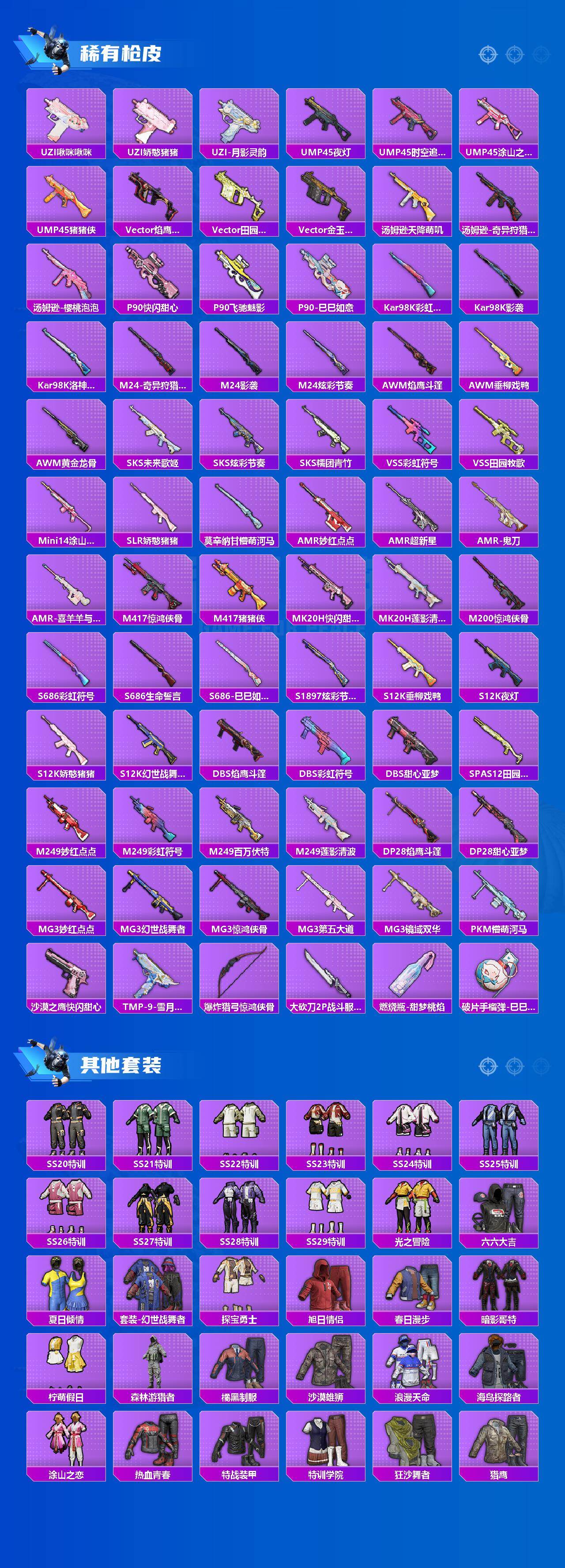 【稀有枪皮】:AUG-冰晶雪宝,AKM-2P战斗服款,AKM-彩虹符号,AKM-江南烟雨,AKM-破晓战魂,AKM-龙的传人,M16A4-幻世战舞者,M16A4-甜心亚梦,SCAR-L-夜灯,SCAR-L-玉兔迎春,SCAR-L-红色方程式,SCAR-L-黄金龙骨,M416-糯团青竹,M416-红色方程式,M416-黄金龙骨,GROZA-懵萌河马,GROZA-田园牧歌,AUG-2P战斗服款,AUG-天降萌叽,QBZ-洛神天依,M762-天降萌叽,M762-甜心宝贝,Mk47-妙红点点,Mk47-洛神天依,G36C-懵萌河马,G36C-青丘仙客,G36C-桃粉嫣然,AC-VA
