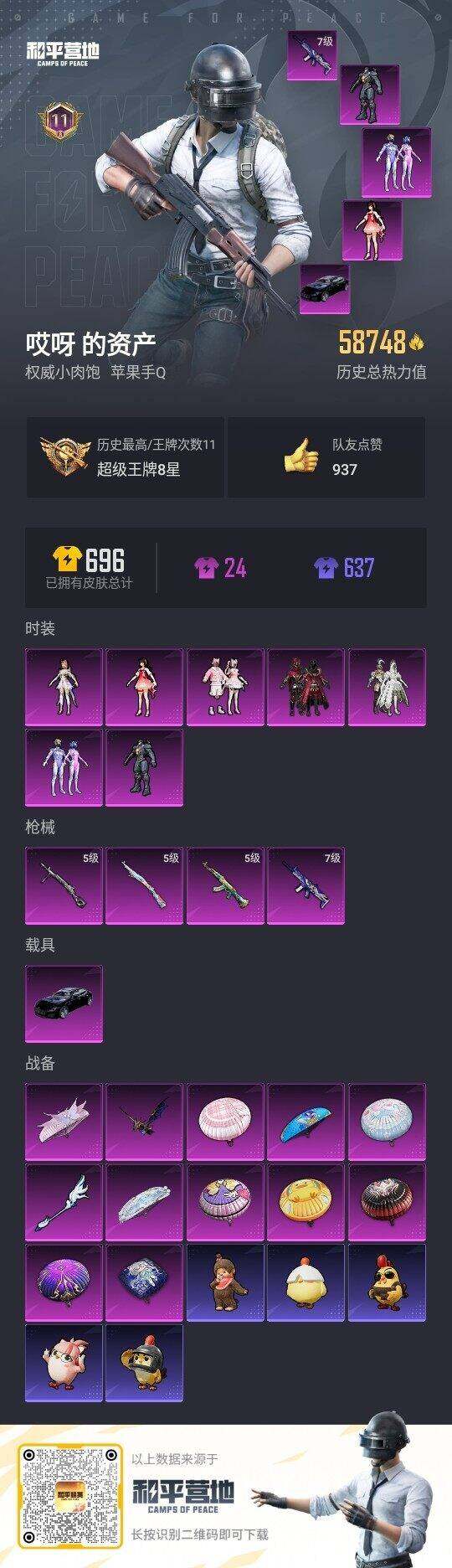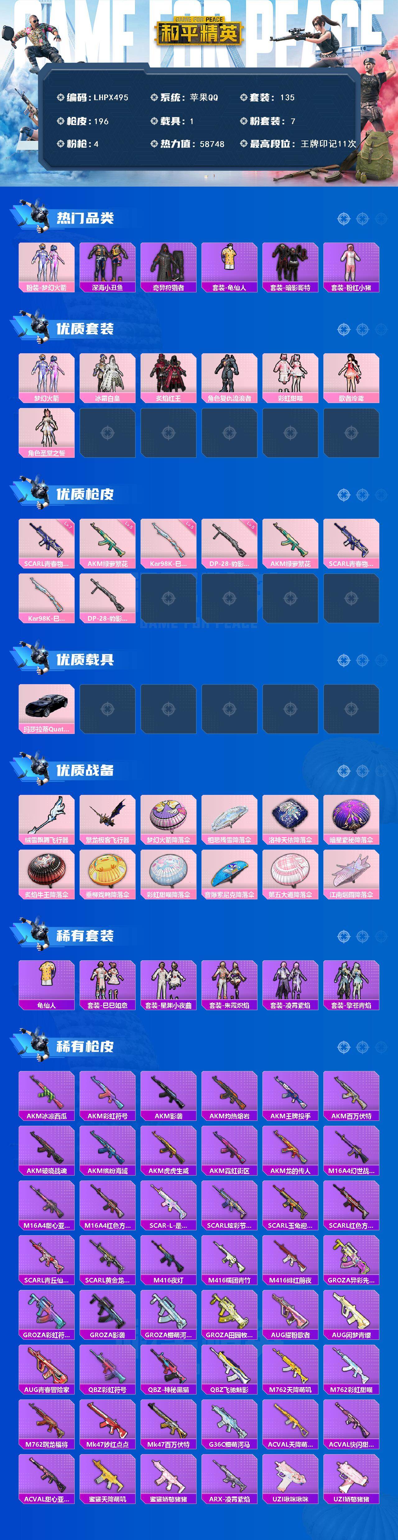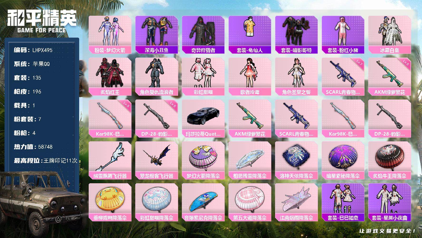 [15649977]【店主推荐捡漏号!可直接换绑】苹果 手Q-7粉装-4特效枪-1载具-2粉色飞行器-58748热力值-11王牌印记-135套装-196枪皮【热门品类】:粉装-梦幻火箭,套装-深海小丑鱼,套装-奇异狩猎者,套装-龟仙人,套装-暗影哥特,套装-粉红小猪【粉色套装】:粉装-梦幻火箭,粉装-冰霜白皇,粉装-炙焰红王,角色-复仇流浪者,粉装-彩虹甜喵,角色-歌者泠鸢,角色-圣堂之誓【粉色枪皮等级】:AKM-绿萝繁花(五级),SCAR-L-青春物语(七级),Kar98K-巳巳如意(五级),DP-28-豹影疾电(五级)【粉色载具】:玛莎拉蒂Quattroporte(夜幕蓝)【粉色枪皮】:AKM-绿萝繁花,SCAR-L-青春物语,Kar98K-巳巳如意,DP-28-豹影疾电【粉色飞行器】:绒雪飘舞飞行器,繁龙极客飞行器