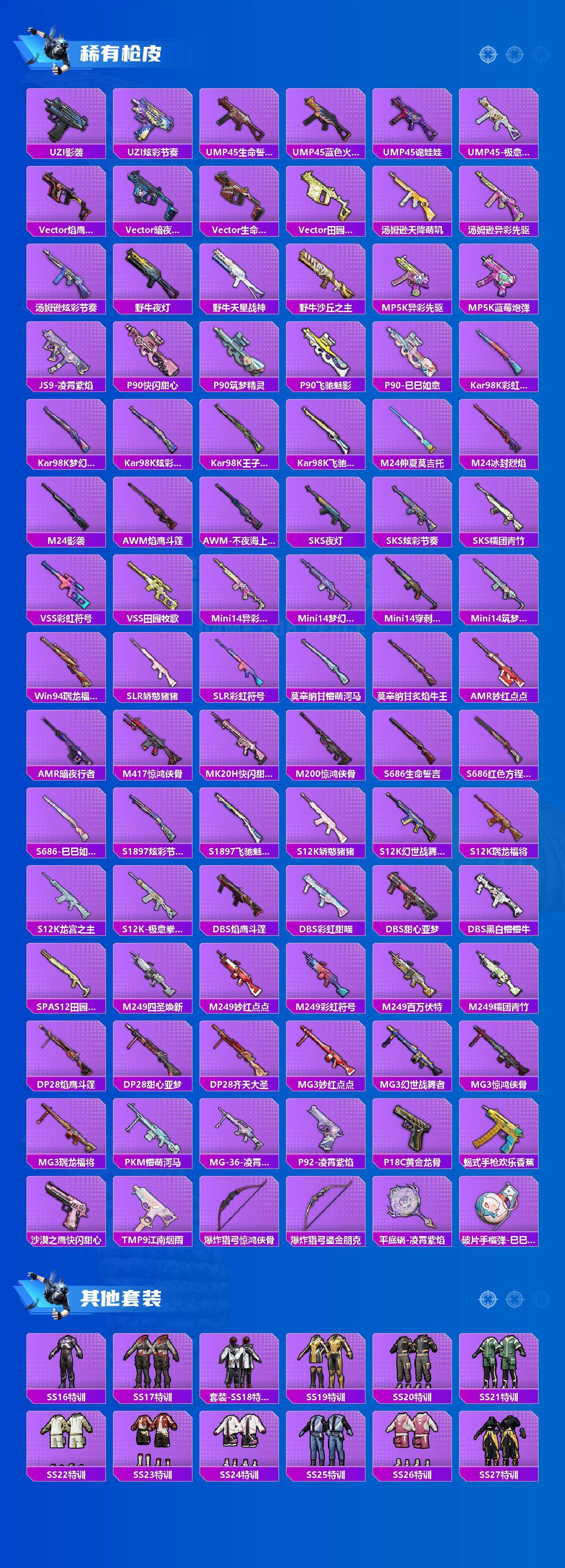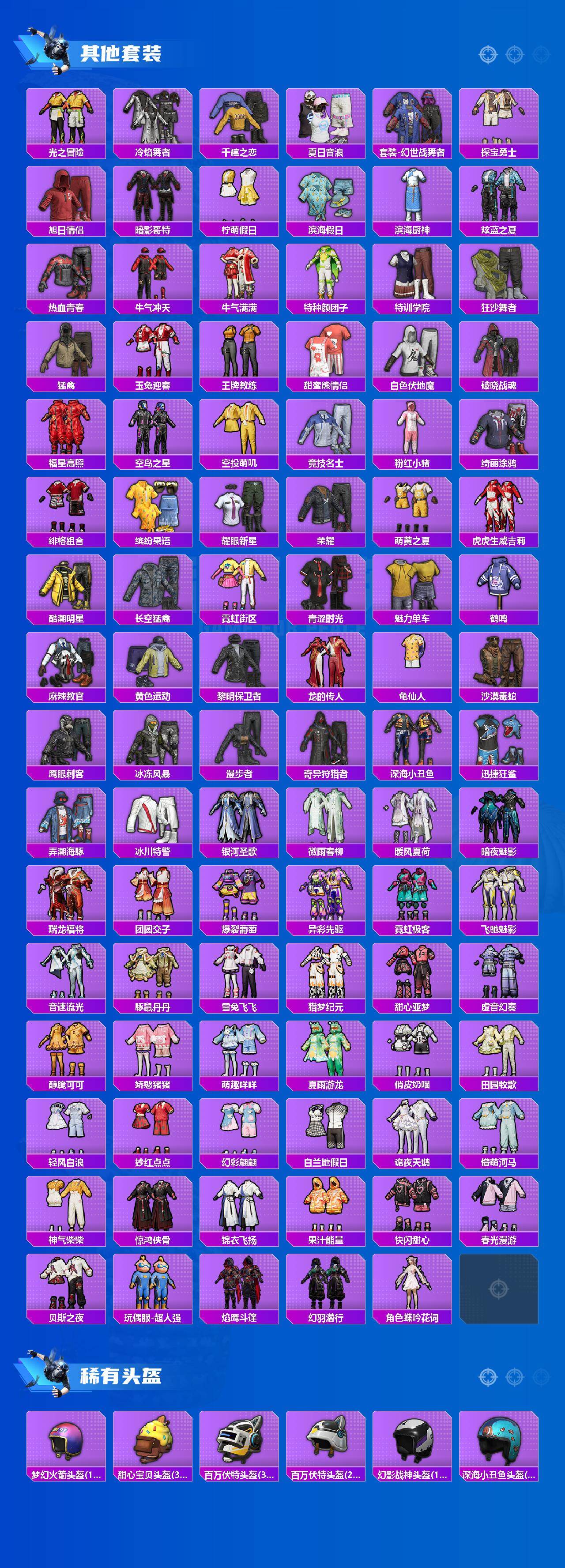 套装-梦幻火箭,套装-深海小丑鱼,套装-奇异狩猎者,套装-炙焰红王,角色-复仇流浪者,套装-彩虹甜喵,角色-歌者泠鸢,角色-圣堂之誓,套装-鹰眼刺客,套装-迅捷狂鲨