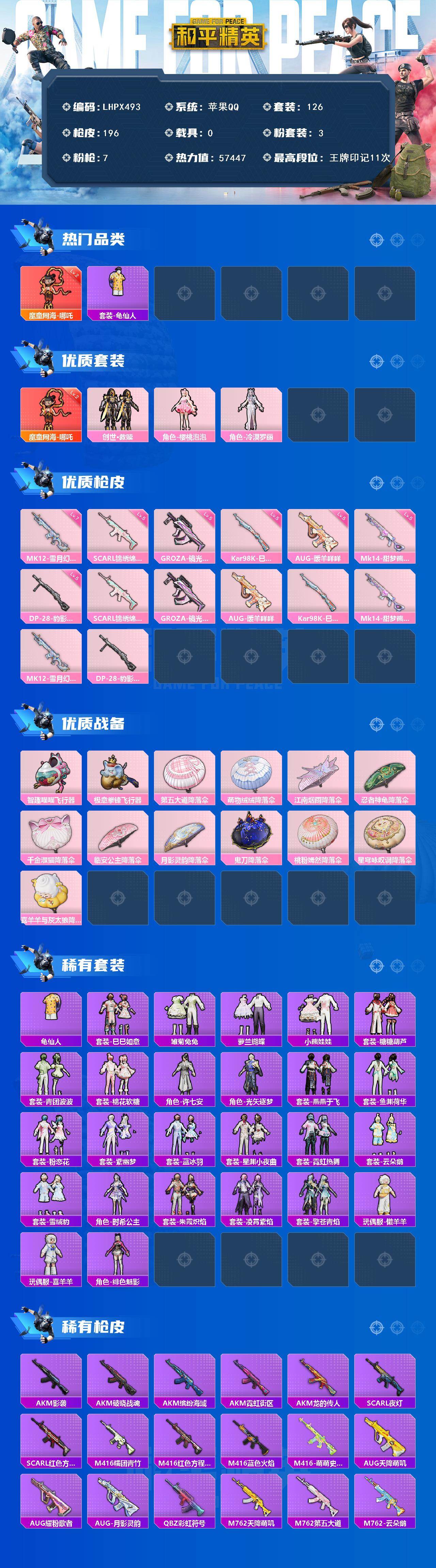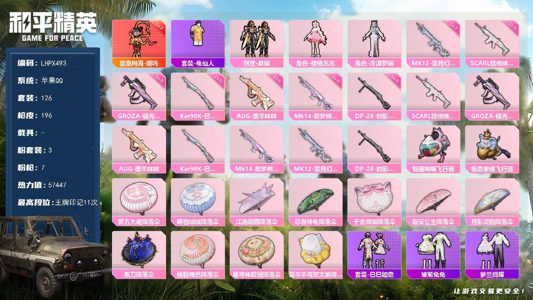 [15649996]【店主推荐捡漏号!可直接换绑】苹果 手Q-1神装-3粉装-7特效枪-0载具-3粉色飞行器-57447热力值-11王牌印记-126套装-196枪皮【红色神装等级】:魔童闹海-哪吒(二级)【红色角色神装】:魔童闹海-哪吒【热门品类】:套装-龟仙人【粉色套装】:套装-创世·救赎,角色-樱桃泡泡,角色-冷漠罗丽【粉色枪皮等级】:SCAR-L-锦绣绵绵(五级),GROZA-镜光银凌(五级),AUG-暖羊咩咩(五级),Kar98K-巳巳如意(五级),Mk14-甜梦熊击(五级),MK12-雪月幻音(七级),DP-28-豹影疾电(五级)【粉色枪皮】:SCAR-L-锦绣绵绵,GROZA-镜光银凌,AUG-暖羊咩咩,Kar98K-巳巳如意,Mk14-甜梦熊击,MK12-雪月幻音,DP-28-豹影疾电【粉色飞行器】:智趣喵喵飞行器,极意拳锋飞行器