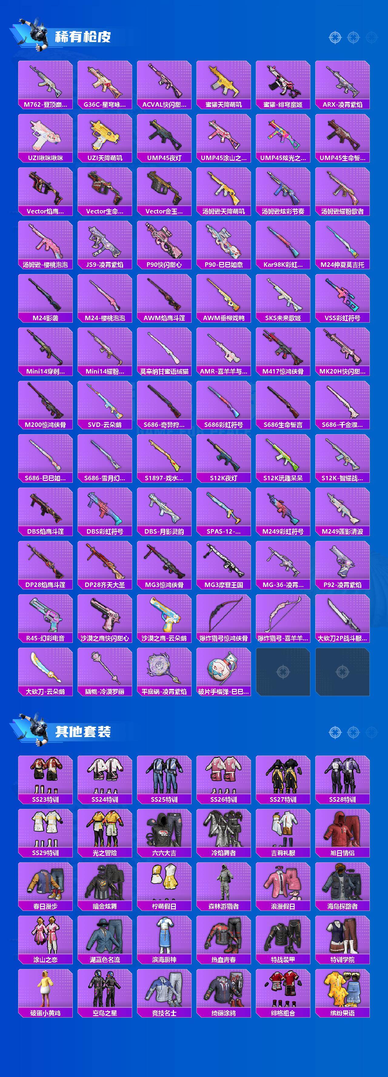 - [15423647]湖北一区-315V-42王者-9炫金 【传说武器】:传说暗裔,传说夜影 【传说角色】:传说星骇 【热门武器】:传说暗裔,传说夜影,G36C-幻影,QBZ03-金色蔷薇*2,Scar Light-白虎,M200-幻神,M200-竞技荣光,死亡之眼*2,荣耀世冠-火麒麟,荣耀世冠-雷神,柯尔特-冠军之特,荣耀世冠-柯尔特,Kar98K-星神,M4A1-黑骑士*2,汤姆逊-烈龙*7,RPK-盘龙*7,加特林-炼狱*4,斯泰尔-蝴蝶,羊驼玩偶,雷神-小红,裁决-雪莉杨,COP-白鲨,USP-雷暴*2,COP-堕天神,COP 357-幻灵*2,沙鹰-修罗*3,荣耀世冠-龙啸,金刚伞,高爆手雷-幻兽*5 【王者炫金武器】:王者之武,王者之心,王者之怒,王者之力,王者雷怒,Barrett-雷霆王者,炫金火麒麟,炫金骑士*2,炫金无影,炫金黑龙,炫金雷神,炫金武士*2,炫金毁灭,王者之魄高爆手雷*3,王者之魄闪光弹*2,王者之魄烟雾弹*3 【音效卡】:屠龙-动感闪耀 音效卡,烈火-动感闪耀 音效卡,M200-幻神音效卡,M4A1-雷神音效卡,M4A1-黑骑士音效卡,Barrett-毁灭音效卡,AWM-裁决音效卡,Scar Light-白虎音效卡,Kar98K-星神音效卡,Barrett-碧霄极光音效卡 【皮肤】:M200-幻神-黄忠皮肤,幻神-冠军之幻,幻神-AG-CFPL S24冠军 皮肤,ScarLight-白虎-冠军之虎皮肤,QBZ03-AG-CFPLS19冠军,裁决-羽掣 皮肤,裁决-叶芒苍灵 皮肤,星神-璀璨皮肤,雷神-能量核心,雷神-荣耀之魄,雷神-耀金皮肤*2,雷神-宠儿-2019MVP,雷神-烈虎皮肤,雷神-荣耀世冠AG,雷神-机甲刑天皮肤,雷神-宇航兔皮肤,火麒麟-雷神,火麒麟-华夏之心*2,AK47-火麒麟-传奇EVEN,火麒麟-平天大圣,火麒麟-心动糖果,毁灭-荣耀之怒,毁灭-冠军之怒,M4A1-千变-孔明皮肤,黑龙-能量核心,黑龙-暗月,无影-暗月,死神-秘银*2,战神-粉色甜心皮肤*3,战神-紫绶金章皮肤*3,战神-流金岁月皮肤*2,AK47-B-常胜将军-曹操,AK47-B-常胜将军-刘备,天龙-秘银,AWM-天龙-传奇70KG,AWM-天龙-传奇白鲨,修罗-能量核心,屠龙-荣耀之锋*3,屠龙-星耀 皮肤,屠龙-春桃 皮肤 【角色】:葵,樱,蝴蝶,炫,