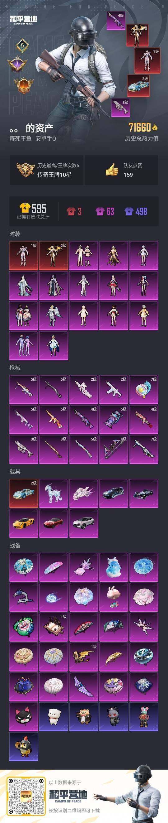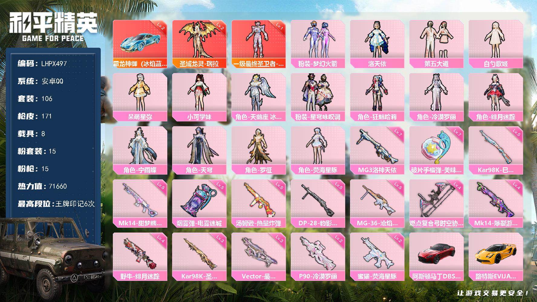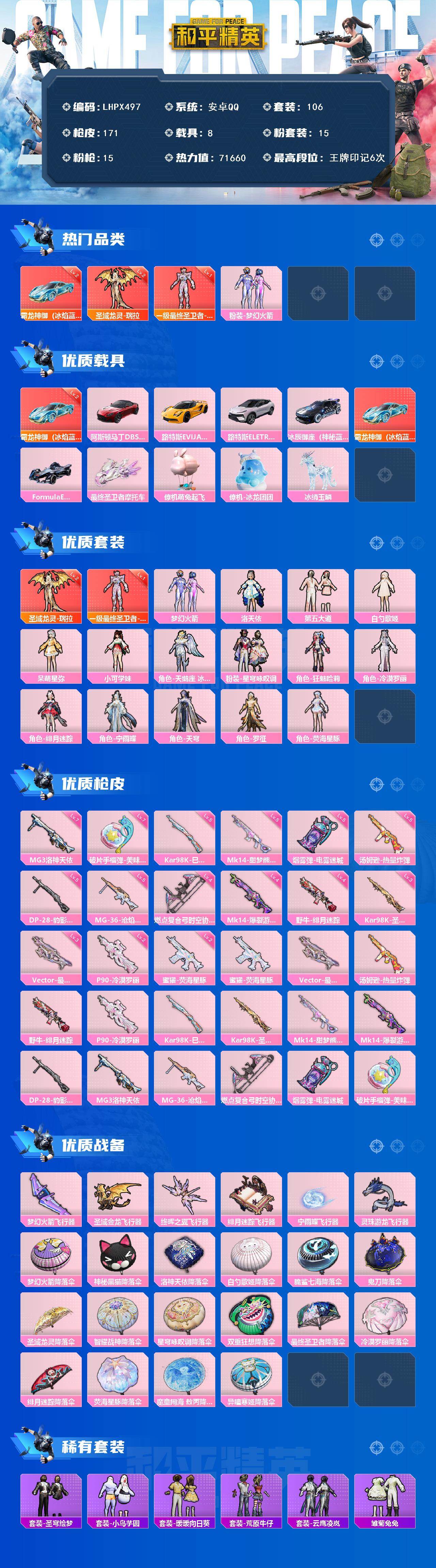 [15649975]【店主推荐捡漏号!可直接换绑】安卓 手Q-2神装-15粉装-15特效枪-8载具-7粉色飞行器-71660热力值-6王牌印记-106套装-171枪皮【红色载具】:霜龙神御(冰焰蓝)(二级)【红色神装等级】:最终圣卫者-帕修斯(一级),圣域龙灵-瑞拉(二级)【红色角色神装】:最终圣卫者-帕修斯,圣域龙灵-瑞拉【热门品类】:粉装-梦幻火箭【粉色套装】:粉装-梦幻火箭,角色-洛天依,粉装-第五大道,角色-白勺歌姬,角色-呆萌星弥,角色-小可学妹,角色-天鹅座 冰河,粉装-星穹咏叹调,角色-狂魅哈莉,角色-冷漠罗丽,角色-绯月迷踪,角色-宁雨蝶,角色-天穹,角色-罗征,角色-荧海星豚【粉色枪皮等级】:蜜獾-荧海星豚(二级),Vector-最终圣卫者(三级),汤姆逊-热量炸弹(五级),野牛-绯月迷踪(四级),P90-冷漠罗丽(二级),Kar98K-巳巳如意(五级),Kar98K-圣域龙灵(三级),Mk14-甜梦熊击(五级),Mk14-爆裂游戏(四级),DP-28-豹影疾电(五级),MG3-洛神天依(七级),MG-36-沧焰双生(五级),燃点复合弓-时空协奏(四级),烟雾弹-电雾迷城(五级),破片手榴弹-美味星星糖(七级)【粉色载具】:阿斯顿马丁DBS(红),路特斯EVIJA(星际黄),路特斯ELETRE(花绽灰),冰辰御座(神秘蓝),霜龙神御(冰焰蓝),Formula E Gen2(幽光蓝),最终圣卫者摩托车,僚机-萌兔起飞,僚机-冰龙团团,冰绡玉鳞【粉色枪皮】:蜜獾-荧海星豚,Vector-最终圣卫者,汤姆逊-热量炸弹,野牛-绯月迷踪,P90-冷漠罗丽,Kar98K-巳巳如意,Kar98K-圣域龙灵,Mk14-甜梦熊击,Mk14-爆裂游戏,DP-28-豹影疾电,MG3-洛神天依,MG-36-沧焰双生,燃点复合弓-时空协奏,烟雾弹-电雾迷城,破片手榴弹-美味星星糖【粉色飞行器】:梦幻火箭飞行器,圣域金龙飞行器,终晖之翼飞行器,绯月迷踪飞行器,宁雨蝶飞行器,灵珠游龙飞行器