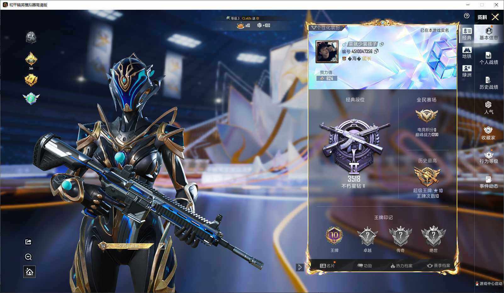 - [14353664]连体王者-350皮肤-5珍品传说-1无双-3荣耀典藏 /全猴皮肤【店主推荐捡漏号!可直接换绑】/素材身法号/扭蛋碎片934/璀璨碎片985/地铁满天赋/M416-墨龙九天(九级) 安卓 手Q-2神装-12粉装-17特效枪-6载具-13粉色飞行器-8.9w热力值-8王牌印记-136套装-211枪皮【红色载具】:霜龙神御(冰焰蓝)(三级)【红色神装等级】:最终圣卫者-帕修斯(一级),幽焰骑士-维塔(一级)【热门品类】:粉装-怪诞乔克,粉装-雪国幻梦,粉装-梦幻火箭,套装-浪漫天命,套装-赤蝎幽灵,套装-都市猎人,套装-派对舞王,套装-奇异狩猎者,套装-AG战队服,套装-龟仙人,套装-暗影哥特,角色-Mark.06,大砍刀-青龙偃月刀,熔岩游骑兵连帽夹克【粉色载具】:炽龙极锋(暗夜黑),霜龙神御(冰焰蓝),合金龙骨(蓝),双人摩托-梦幻火箭,最终圣卫者摩托车,黑曜夜骑【粉色套装】:粉装-怪诞乔克,粉装-雪国幻梦,粉装-梦幻火箭,粉装-放客神游,粉装-绚金战神,角色-烟云彩露,角色-冰域雷影,角色-女娲灵识,粉装-雪月幻音,角色-凤凰座 一辉,角色-罗征,角色-绯穹魔姬【粉色枪皮等级】:AKM-绿萝繁花(四级),AKM-幽焰骑士(三级),SCAR-L-梦幻火箭(一级),SCAR-L-锦绣绵绵(五级),SCAR-L-魔童闹海 哪吒(六级),M416-心之恋语(一级),M416-电玩时刻(五级),M416-墨龙九天(九级),GROZA-镜光银凌(五级),AUG-超新星(七级),UMP45-量子极限(五级),Vector-最终圣卫者(三级),AKS-74U-星穹咏叹调(五级),P90-魔童闹海 敖丙(三级),Kar98K-巳巳如意(五级),Mk14-甜梦熊击(五级),DP-28-豹影疾电(五级)【粉色飞行器】:酣梦熊熊飞行器,梦幻火箭飞行器,冠军兔兔飞行器,深渊漩涡飞行器,英伦信使飞行器,幽焰列车飞行器,圣域金龙飞行器,终晖之翼飞行器,灵猫魔法师飞行器,灵珠游龙飞行器