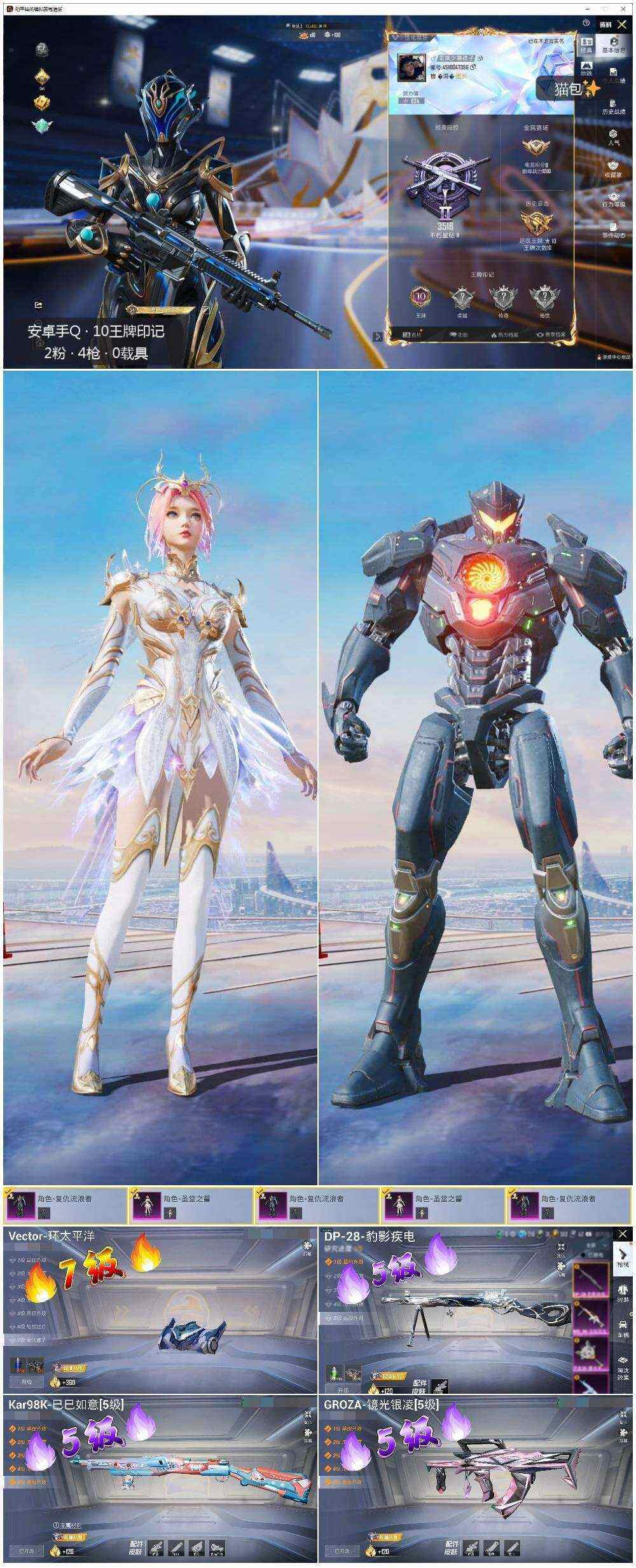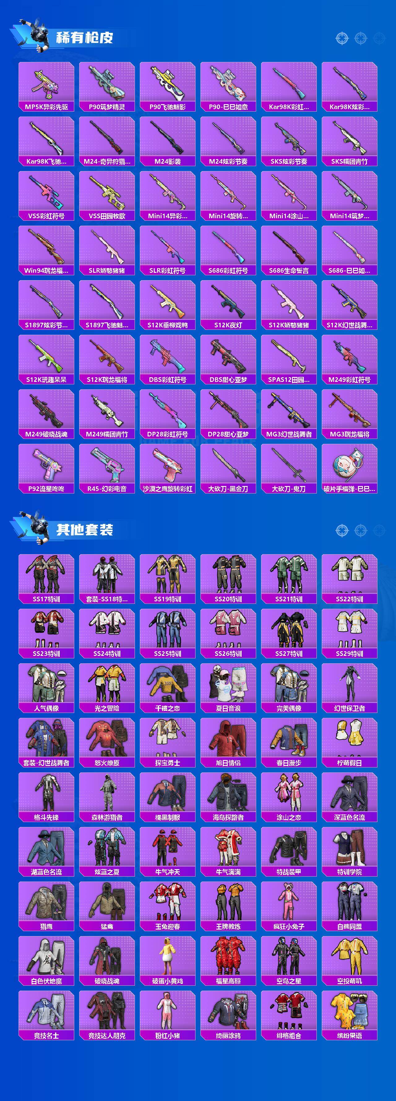 - [15081716]【特价出售/店主推荐】安卓 手Q-4粉装-3特效枪-0载具-3粉色飞行器-41162热力值-9王牌印记-95套装-138枪皮 【热门品类】:粉装-梦幻火箭,套装-龟仙人 【粉色套装】:粉装-天使彩虹糖,粉装-梦幻火箭,粉装-薄荷物语,角色-萨利娅 【粉色枪皮等级】:Kar98K-未来歌姬(五级),Kar98K-巳巳如意(一级),DP-28-豹影疾电(五级) 【粉色枪皮】:Kar98K-未来歌姬,Kar98K-巳巳如意,DP-28-豹影疾电 【粉色飞行器】:梦幻火箭飞行器,庄周梦蝶飞行器 【粉色降落伞】:绝对恒星降落伞,甜心宝贝降落伞,梦幻火箭降落伞,庄周梦蝶降落伞,环太平洋降落伞,彩虹甜喵降落伞,第五大道降落伞 【稀有套装】:套装-龟仙人,套装-巳巳如意,套装-雪国风尚,角色-都市丽猫,套装-燕燕于飞,套装-鱼渊荷华,套装-星渊小夜曲,套装-炫彩糖果 【稀有枪皮】:AUG-冰晶雪宝,AKM-虎虎生威,AKM-龙的传人,M16A4-幻世战舞者,M16A4-红色方程式,SCAR-L-炫彩节奏,SCAR-L-玉兔迎春,SCAR-L-红色方程式,M416-糯团青竹,M416-红色方程式,M416-绯红前夜,M416-蓝色火焰,GROZA-治愈之星,GROZA-田园牧歌,GROZA-荧海星豚,AUG-耀粉歌者,AUG-绝对恒星,QBZ-彩虹符号,QBZ-飞驰魅影,M762-天降萌叽,M762-甜心宝贝,AC-VAL-天降萌叽,蜜獾-天降萌叽,蜜獾-娇憨猪猪,UZI-啾咪啾咪,UZI-天降萌叽,UZI-娇憨猪猪,UZI-红色方程式,UMP45-生命誓言,UMP45-蓝色火焰,UMP45-绒宝小鹅,Vector-暗夜玫瑰,Vector-治愈之星,Vector-生命誓言,Vector-田园牧歌,汤姆逊-天降萌叽,汤姆逊-庄周梦蝶,汤姆逊-耀粉歌者,野牛-王牌四分卫,MP5K-彩虹嘻嘻猴,MP5K-甜蜜誓约,P90-飞驰魅影,P90-巳巳如意,Kar98K-彩虹符号,Kar98K-梦幻火箭,Kar98K-炫彩节奏,Kar98K-飞驰魅影,M24-治愈之星,AWM-庄周梦蝶,SKS-炫彩节奏,VSS-田园牧歌,Mini14-彩虹嘻嘻猴,Mini14-耀粉歌者,Mk14-治愈之星,SLR-娇憨猪猪,AMR-鬼刀,S686-生命誓言,S686-巳巳如意,S686-千金淑猫,S1897-炫