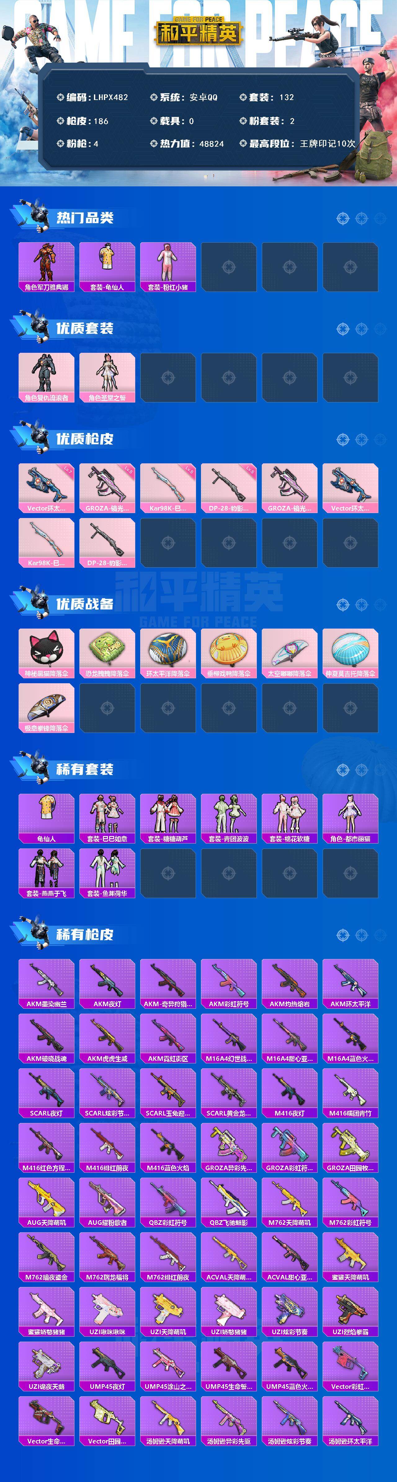 [15650049]【店主推荐捡漏号!可直接换绑】安卓 手Q-2粉装-4特效枪-0载具-1粉色飞行器-48824热力值-10王牌印记-132套装-186枪皮【热门品类】:角色-军刀雅典娜,套装-龟仙人,套装-粉红小猪【粉色套装】:角色-复仇流浪者,角色-圣堂之誓【粉色枪皮等级】:GROZA-镜光银凌(五级),Vector-环太平洋(七级),Kar98K-巳巳如意(五级),DP-28-豹影疾电(五级)【粉色枪皮】:GROZA-镜光银凌,Vector-环太平洋,Kar98K-巳巳如意,DP-28-豹影疾电