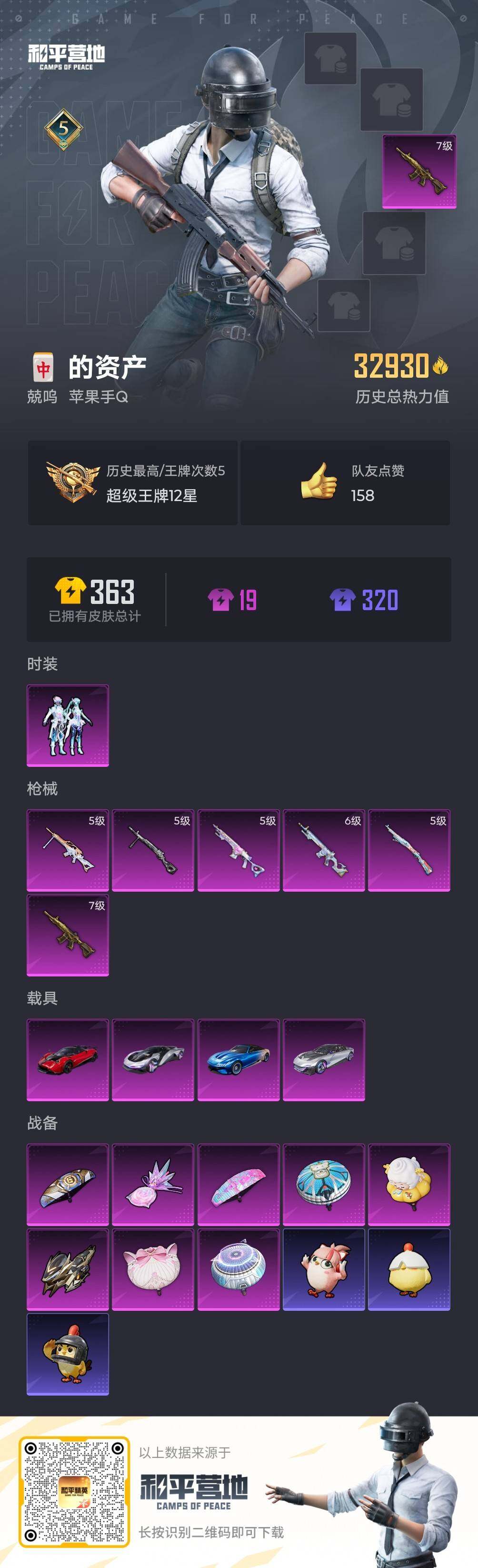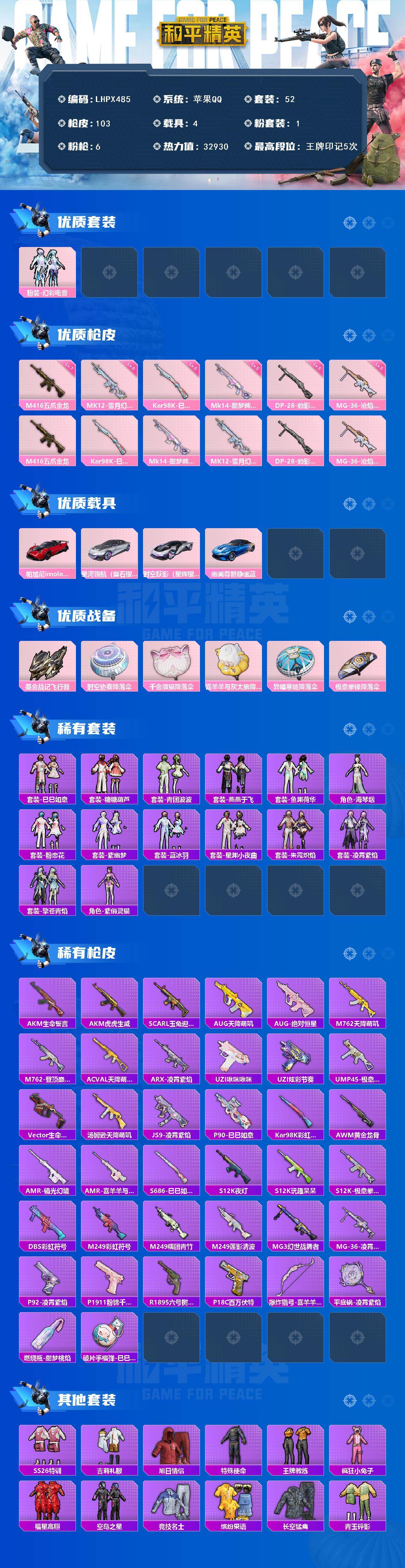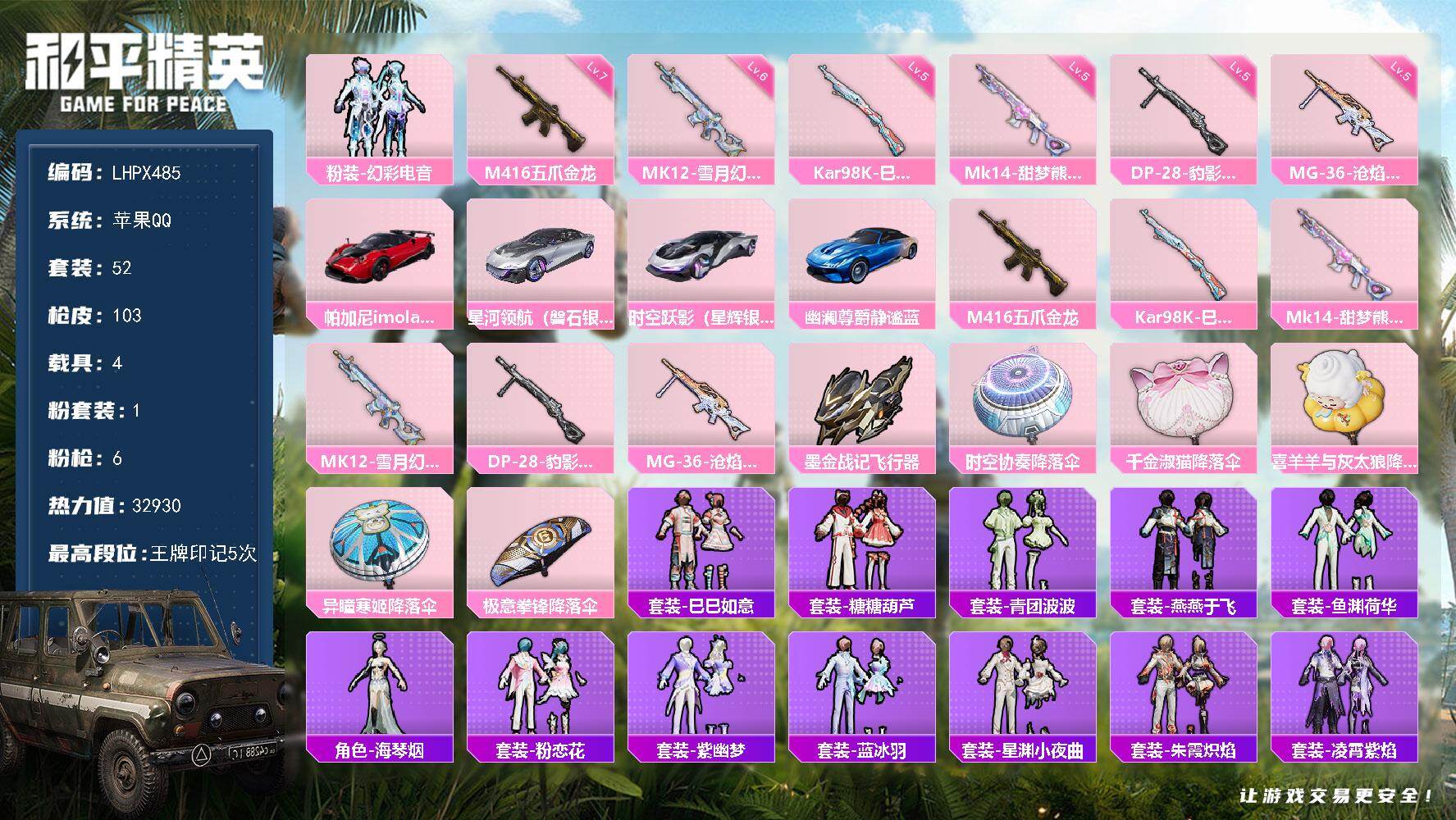 [15650037]【店主推荐捡漏号!可直接换绑】苹果 手Q-1粉装-6特效枪-4载具-2粉色飞行器-32930热力值-5王牌印记-52套装-103枪皮【粉色套装】:粉装-幻彩电音【粉色枪皮等级】:M416-五爪金龙(七级),Kar98K-巳巳如意(五级),Mk14-甜梦熊击(五级),MK12-雪月幻音(六级),DP-28-豹影疾电(五级),MG-36-沧焰双生(五级)【粉色载具】:帕加尼imola(光影红),星河领航(磐石银),时空跃影(星辉银),幽澜尊爵(静谧蓝)【粉色枪皮】:M416-五爪金龙,Kar98K-巳巳如意,Mk14-甜梦熊击,MK12-雪月幻音,DP-28-豹影疾电,MG-36-沧焰双生【粉色飞行器】:墨金战记飞行器