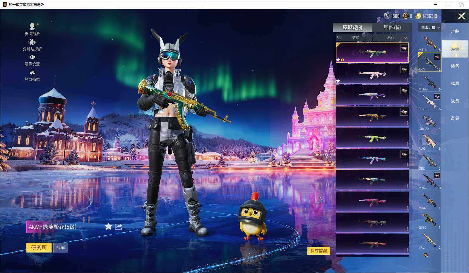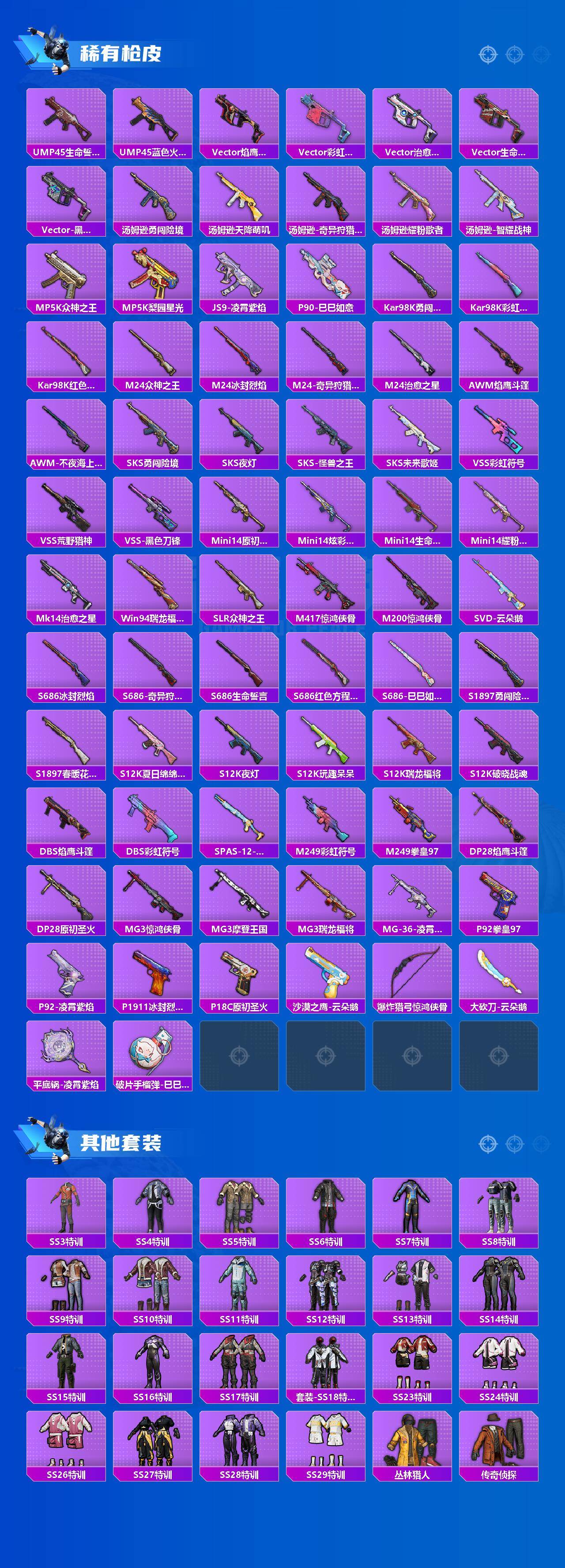 AKM-绿萝繁花,SCAR-L-锦绣绵绵,M416-电玩时刻,GROZA-镜光银凌,AUG-暖羊咩咩,M762-青锋波束,UMP45-恐龙拽拽,UMP45-量子极限,Kar98K-巳巳如意