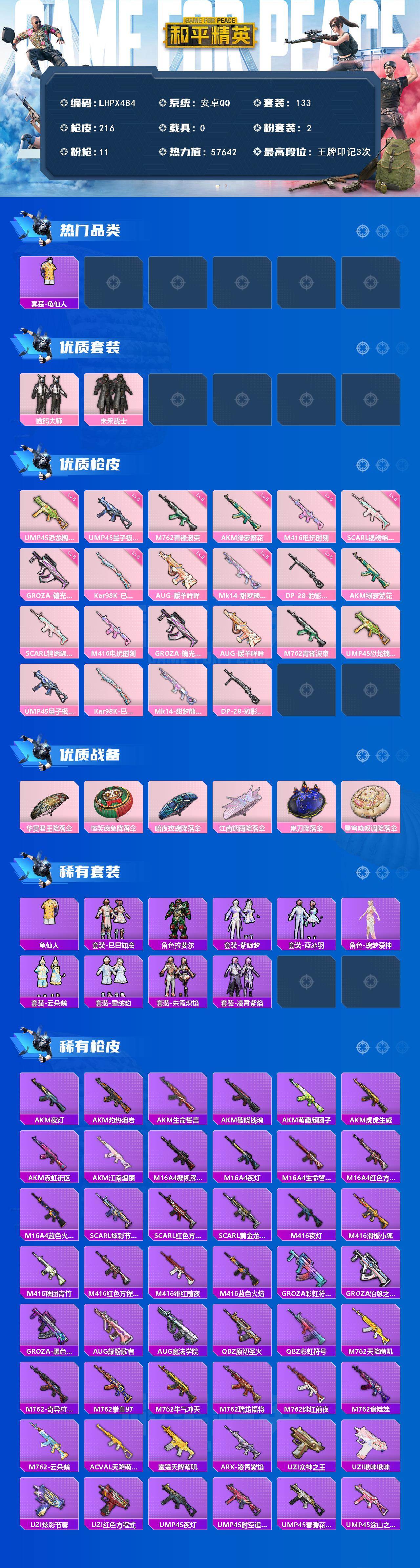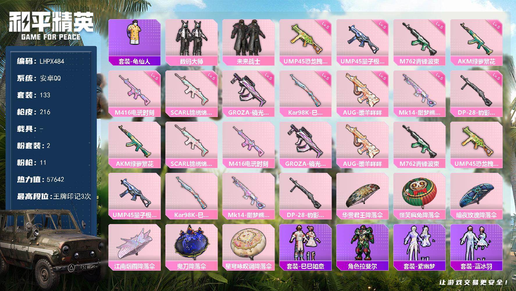 [15650035]【店主推荐捡漏号!可直接换绑】安卓 手Q-2粉装-11特效枪-0载具-0粉色飞行器-57642热力值-3王牌印记-133套装-216枪皮【热门品类】:套装-龟仙人【粉色套装】:粉装-数码大师,粉装-未来战士【粉色枪皮等级】:AKM-绿萝繁花(五级),SCAR-L-锦绣绵绵(五级),M416-电玩时刻(五级),GROZA-镜光银凌(五级),AUG-暖羊咩咩(五级),M762-青锋波束(五级),UMP45-恐龙拽拽(五级),UMP45-量子极限(五级),Kar98K-巳巳如意(五级),Mk14-甜梦熊击(五级),DP-28-豹影疾电(五级)【粉色枪皮】:AKM-绿萝繁花,SCAR-L-锦绣绵绵,M416-电玩时刻,GROZA-镜光银凌,AUG-暖羊咩咩,M762-青锋波束,UMP45-恐龙拽拽,UMP45-量子极限,Kar98K-巳巳如意,Mk14-甜梦熊击,DP-28-豹影疾电
