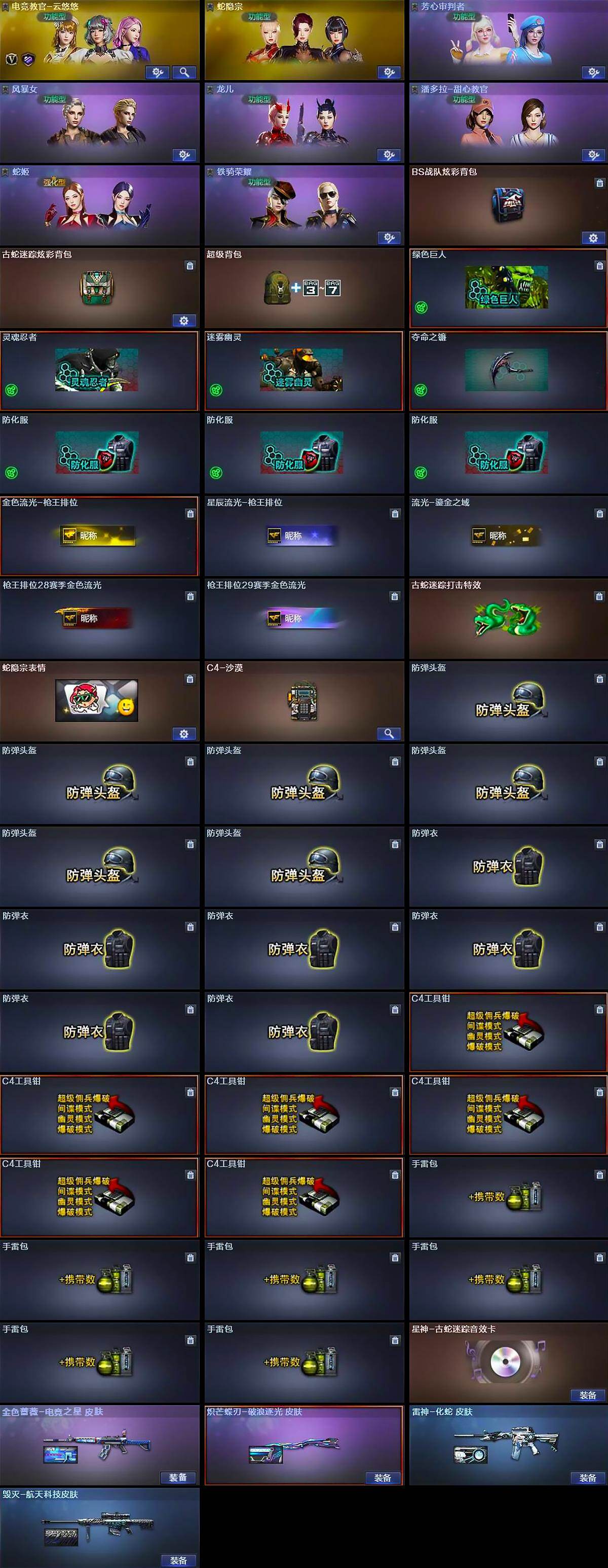 【道具】:BS战队炫彩背包,古蛇迷踪炫彩背包,超级背包,绿色巨人,灵魂忍者,迷雾幽灵,夺命之镰,防化服*3,金色流光-枪王排位,星辰流光-枪王排位,流光-鎏金之域,枪王排位28赛季金色流光,枪王排位29赛季金色流光,古蛇迷踪打击特效,蛇隐宗表情,C4-沙漠,防弹头盔*6,防弹衣*6,C4工具钳*6,手雷包*6