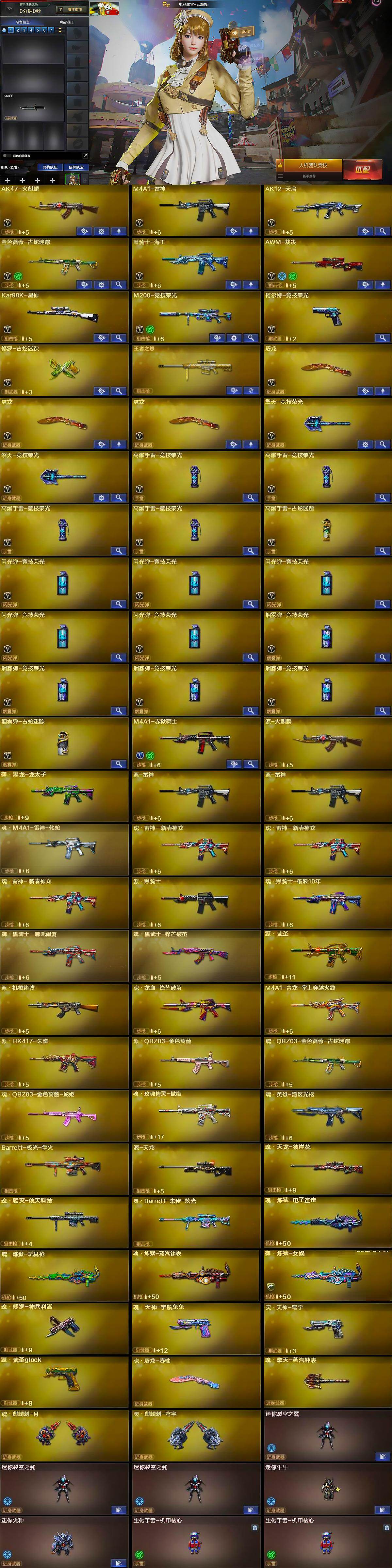 【英雄级武器】:AK47-火麒麟,M4A1-雷神,AK12-天启,金色蔷薇-古蛇迷踪,黑骑士-海王,AWM-裁决,Kar98K-星神,M200-竞技荣光,柯尔特-竞技荣光,修罗-古蛇迷踪,屠龙*3,擎天-竞技荣光*2,高爆手雷-竞技荣光*4,高爆手雷-古蛇迷踪,闪光弹-竞技荣光*5,烟雾弹-竞技荣光*4,烟雾弹-古蛇迷踪,M4A1-赤狱骑士