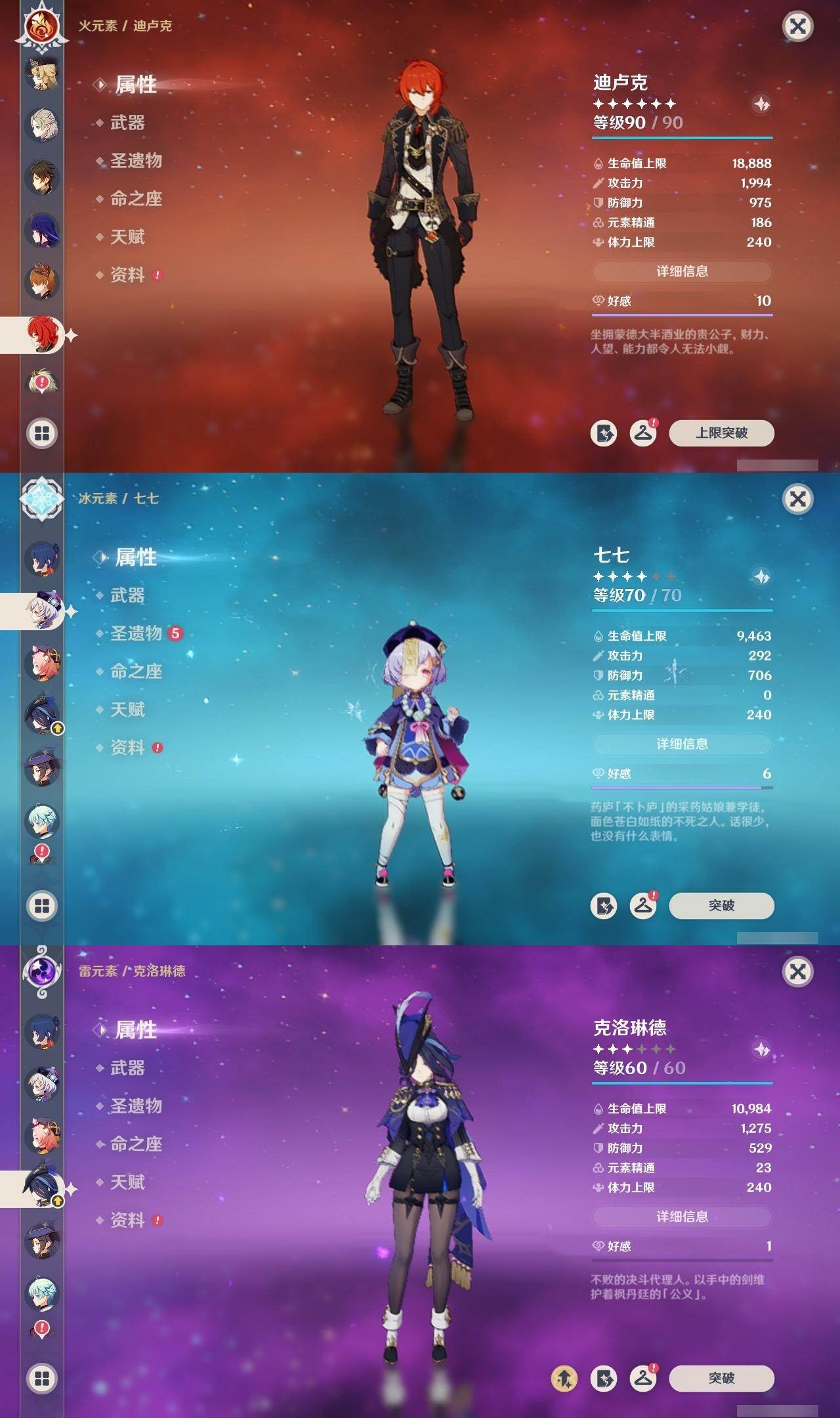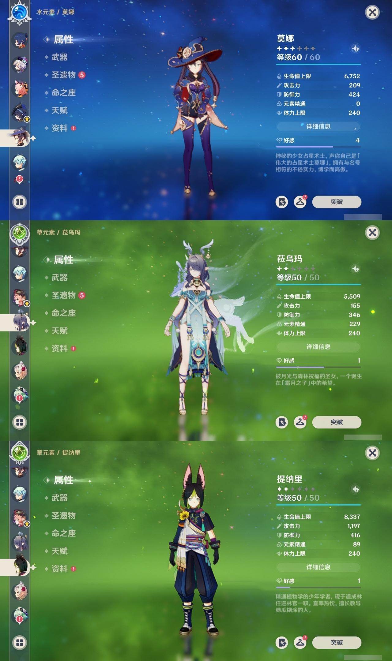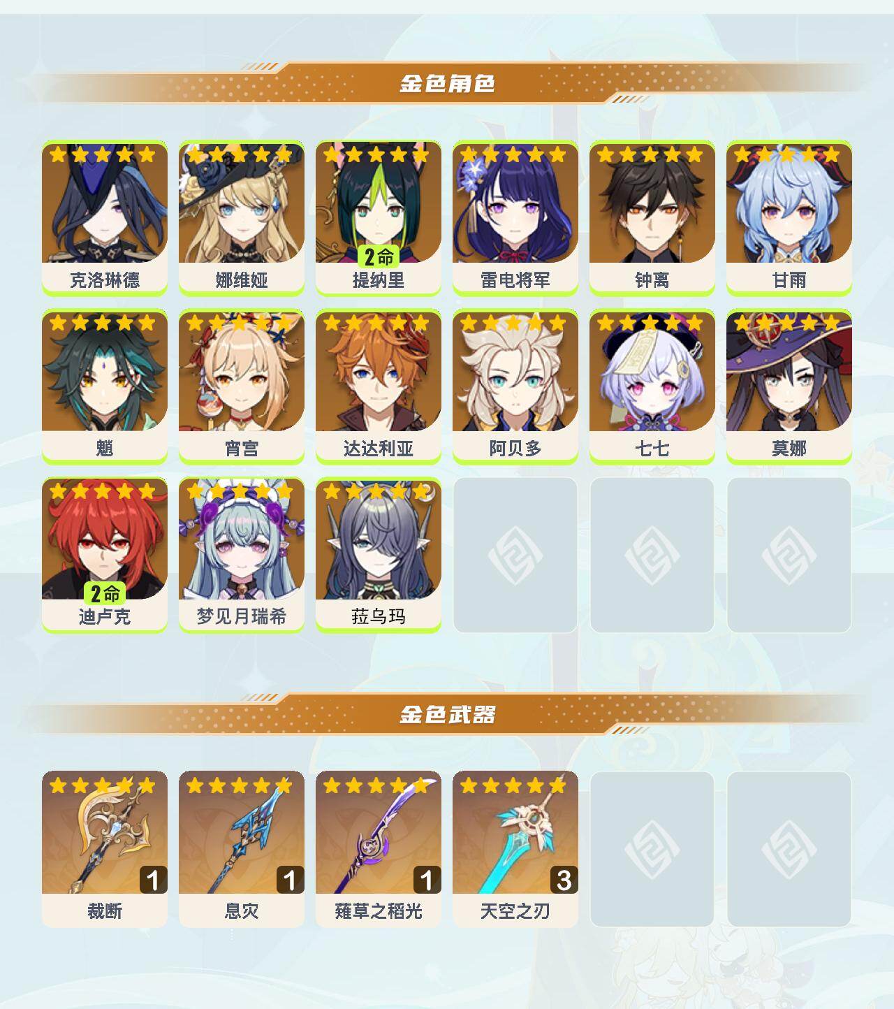 0命克洛琳德,0命娜维娅,2命提纳里,0命雷电将军,0命钟离,0命甘雨,0命魈,0命宵宫,0命达达利亚,0命阿贝多,0命七七,0命莫娜,2命迪卢克,0命梦见月瑞希,0命菈乌玛,精1裁断,精1息灾,精1薙草之稻光,精3天空之刃
