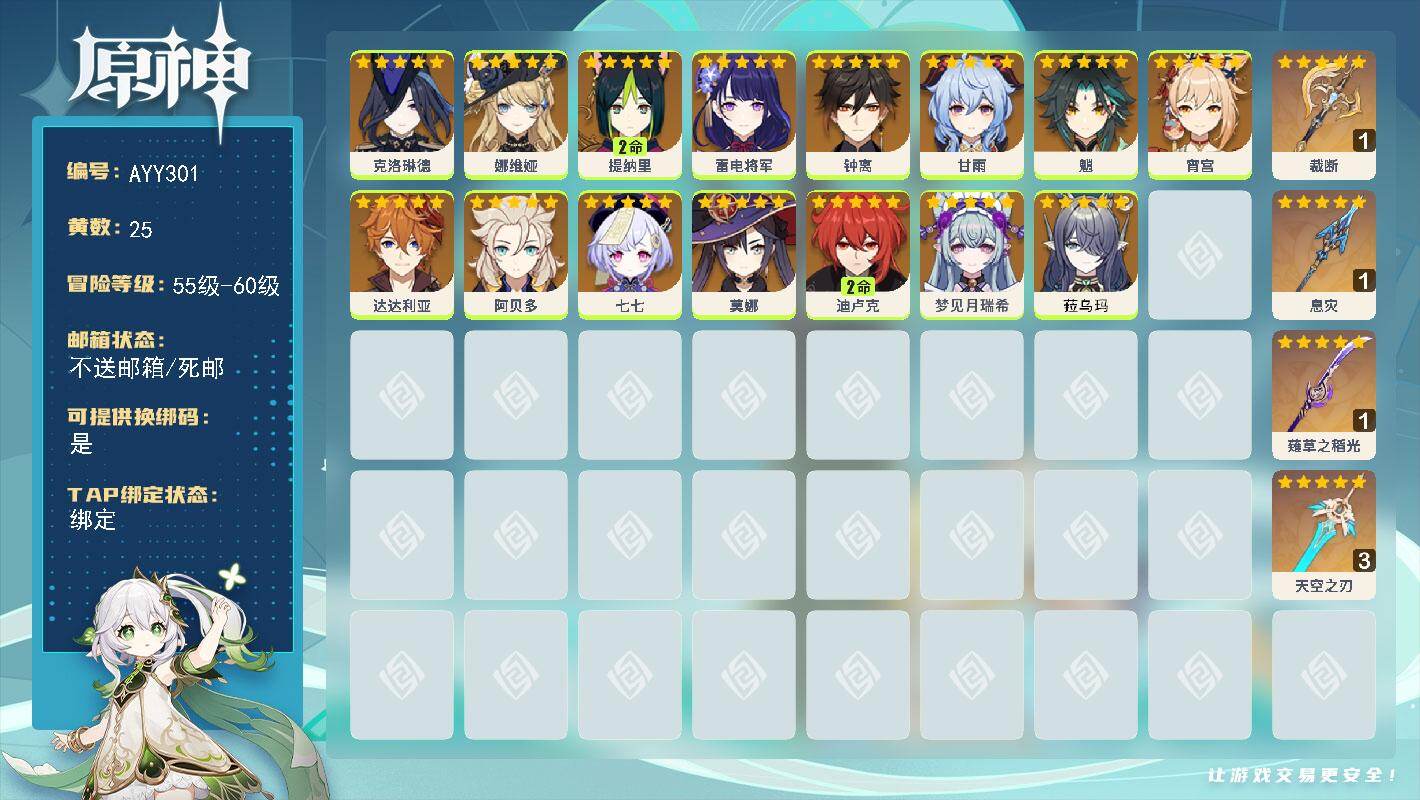 [15653931]57级/25黄/女主/15个五星角色/4个五星武器 0命克洛琳德,0命娜维娅,2命提纳里,0命雷电将军,0命钟离,0命甘雨,0命魈,0命宵宫,0命达达利亚,0命阿贝多,0命七七,0命莫娜,2命迪卢克,0命梦见月瑞希,0命菈乌玛,精1裁断,精1息灾,精1薙草之稻光,精3天空之刃