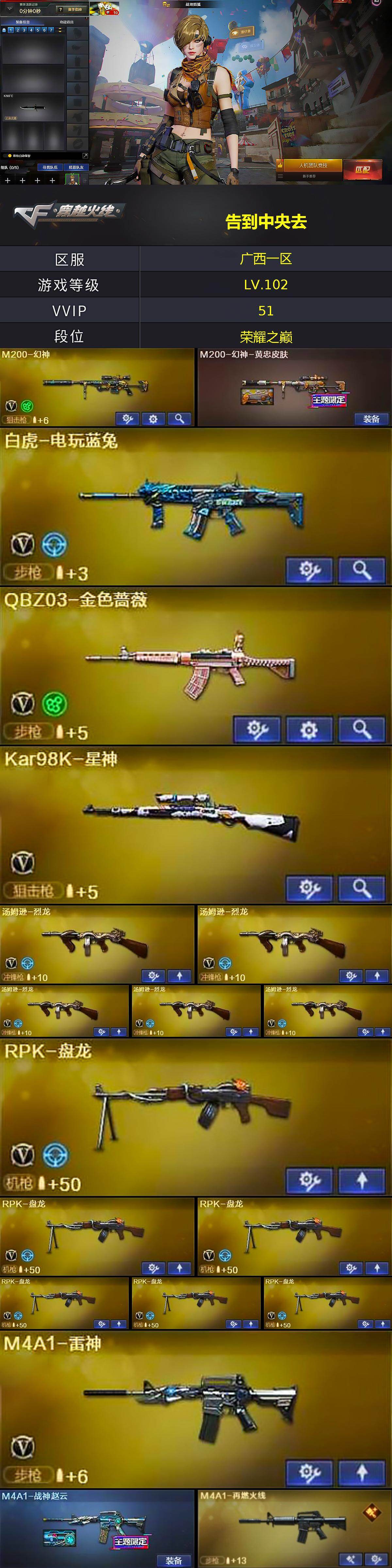 【热门武器】:QBZ03-金色蔷薇,M200-幻神,死亡之眼,白虎-电玩蓝兔,Kar98K-星神,M4A1-黑骑士*2,汤姆逊-烈龙*5,RPK-盘龙*6,加特林-炼狱,沙鹰-修罗*6