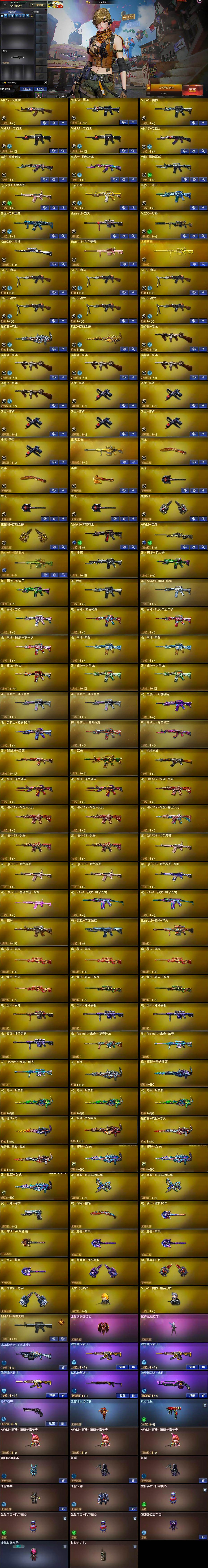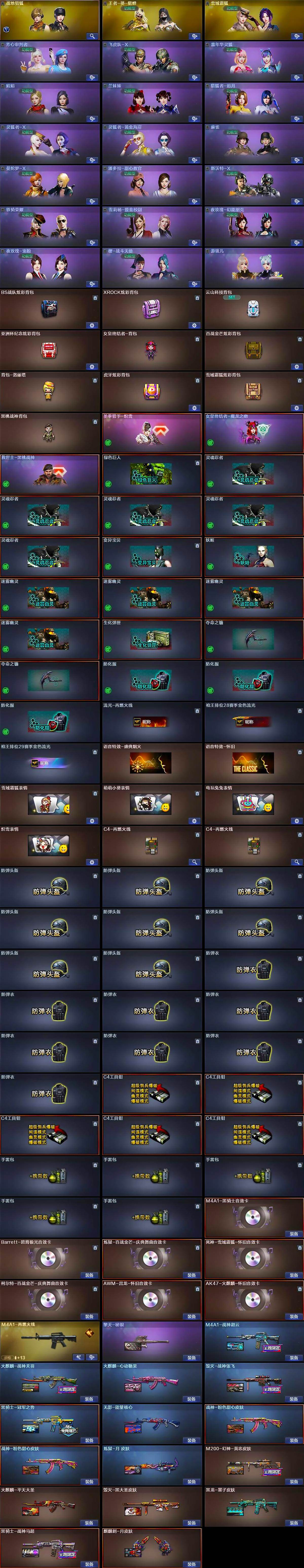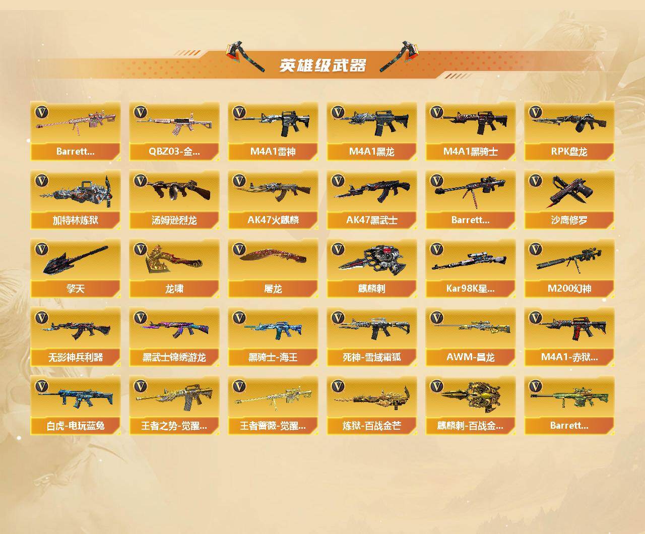 【英雄级武器】:AK47-火麒麟,M4A1-黑龙,M4A1-雷神,M4A1-黑骑士*2,AK47-黑武士,无影-神兵利器,黑武士-锦绣游龙,死神-雪域霜狐,QBZ03-金色蔷薇,王者之势-觉醒版,黑骑士-海王,白虎-电玩蓝兔,Barrett-毁灭,M200-幻神,Kar98K-星神,Barrett-金色蔷薇,王者蔷薇-觉醒版,RPK-盘龙*6,加特林-炼狱,炼狱-百战金芒,汤姆逊-烈龙*5,沙鹰-修罗*6,屠龙*2,龙啸,擎天*3,麒麟刺,麒麟刺-百战金芒,M4A1-赤狱骑士,AWM-昌龙,Ba