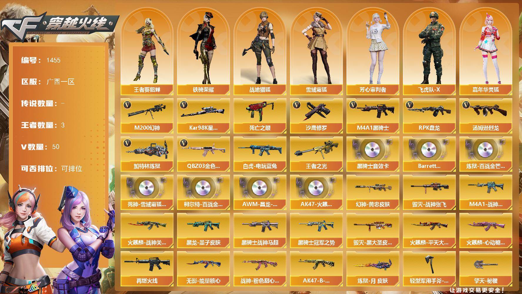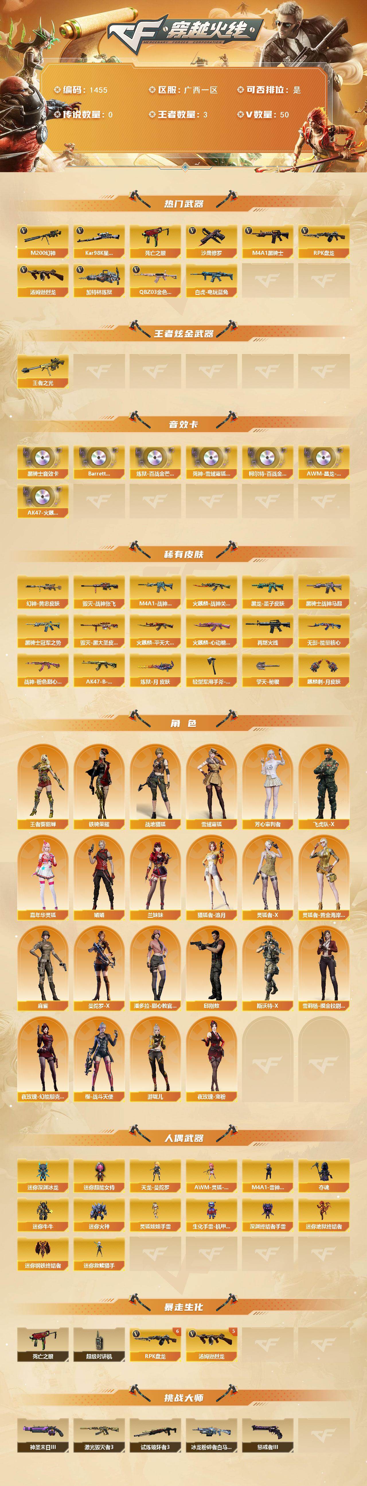 [15448572]广西一区-50V-3王者-0炫金 【热门武器】:QBZ03-金色蔷薇,M200-幻神,死亡之眼,白虎-电玩蓝兔,Kar98K-星神,M4A1-黑骑士*2,汤姆逊-烈龙*5,RPK-盘龙*6,加特林-炼狱,沙鹰-修罗*6 【王者炫金武器】:王者之光 【音效卡】:M4A1-黑骑士音效卡,Barrett-碧霄极光音效卡,炼狱-百战金芒-庆典舞曲音效卡,死神-雪域霜狐-怀旧音效卡,柯尔特-百战金芒-庆典舞曲音效卡,AWM-昌龙-怀旧音效卡,AK47-火麒麟-怀旧音效卡 【皮肤】:M200-幻神-黄忠皮肤,M4A1-战神赵云,M4A1-再燃火线,火麒麟-战神关羽,火麒麟-平天大圣,火麒麟-心动糖果,毁灭-战神张飞,毁灭-黑大圣皮肤,黑龙-墨子皮肤,黑骑士-冠军之势,黑骑士-战神马超,无影-能量核心,战神-粉色甜心皮肤*2,AK47-B-常胜将军-孙权,炼狱-月 皮肤,轻型军用手斧-再燃火线,擎天-秘银,麒麟刺-月皮肤 【角色】:战地猎狐,王者-葵-貂蝉,雪域霜狐,芳心审判者,飞虎队-X,嘉年华灵狐,娟娟,兰妹妹,猎狐者-追月,灵狐者-X,灵狐者-黄金海岸,麻雀,曼陀罗-X,潘多拉-甜心教官,邱刚敖,斯沃特-X,铁骑荣耀,雪莉杨-摸金校尉,夜玫瑰-幻能朋克,夜玫瑰-宠粉,樱-战斗天使,游珑儿 【人偶武器】:天龙-曼陀罗,M4A1-雷神-精英刀锋,迷你钢铁终结者,迷你救赎猎手,迷你地狱终结者,AWM-灵狐-15周年嘉年华*3,迷你深渊冰龙,夺魂*2,迷你牛牛,迷你火种,生化手雷-机甲核心*3,深渊终结者手雷,迷你超能女侍,灵狐娃娃手雷*2 【暴走生化】:死亡之眼,超级对讲机 【挑战大师】:冰龙粉碎者-白马银枪,激光毁灭者III*3,试炼破坏者III,神圣爆裂者-末日III,惩戒者III 【英雄级武器】:AK47-火麒麟,M4A1-黑龙,M4A1-雷神,M4A1-黑骑士*2,AK47-黑武士,无影-神兵利器,黑武士-锦绣游龙,死神-雪域霜狐,QBZ03-金色蔷薇,王者之势-觉醒版,黑骑士-海王,白虎-电玩蓝兔,Barrett-毁灭,M200-幻神,Kar98K-星神,Barrett-金色蔷薇,王者蔷薇-觉醒版,RPK-盘龙*6,加特林-炼狱,炼狱-百战金芒,汤姆逊-烈龙*5,沙鹰-修罗*6,屠龙*2,龙啸,擎天*3,麒麟刺,麒麟刺-百战金芒,M4A1-赤狱骑士,AWM-昌龙,Ba