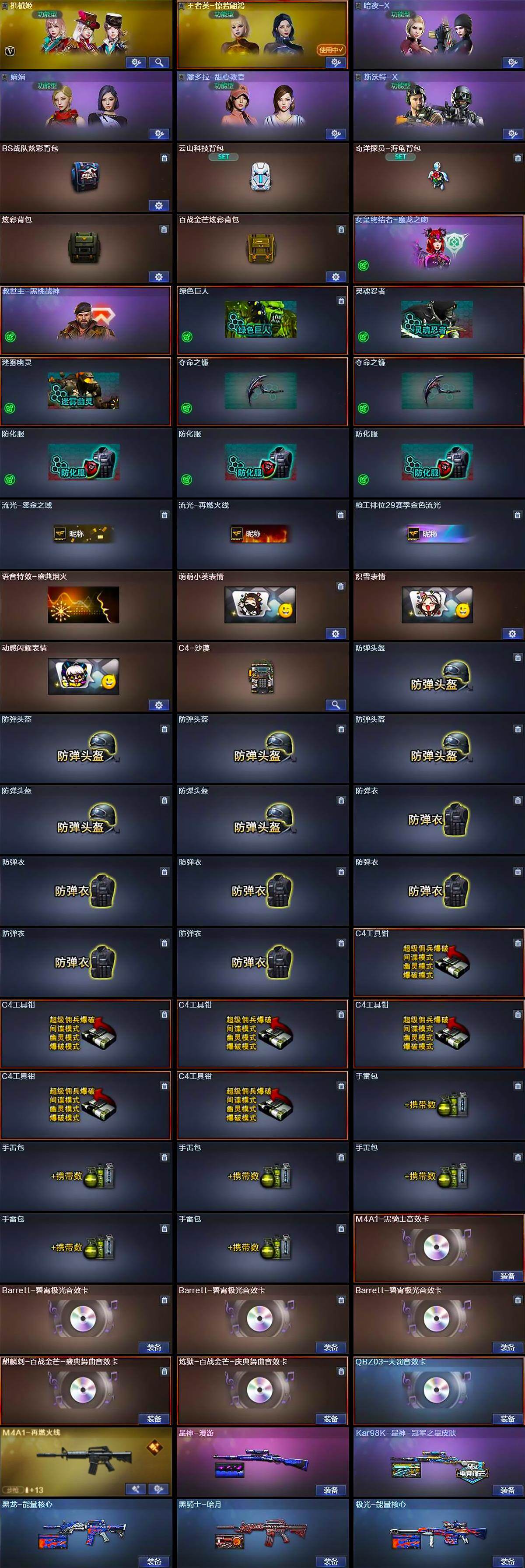 【道具】:BS战队炫彩背包,云山科技背包,奇洋探员-海龟背包,炫彩背包,百战金芒炫彩背包,女皇终结者-魔龙之吻,救世主-黑桃战神,绿色巨人,灵魂忍者,迷雾幽灵,夺命之镰*2,防化服*3,流光-鎏金之域,流光-再燃火线,枪王排位29赛季金色流光,语音特效-盛典烟火,萌萌小葵表情,炽雪表情,动感闪耀表情,C4-沙漠,防弹头盔*6,防弹衣*6,C4工具钳*6,手雷包*6