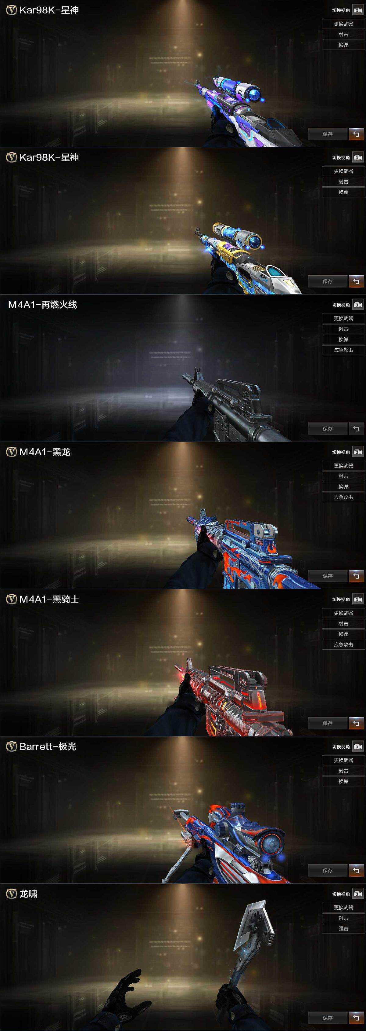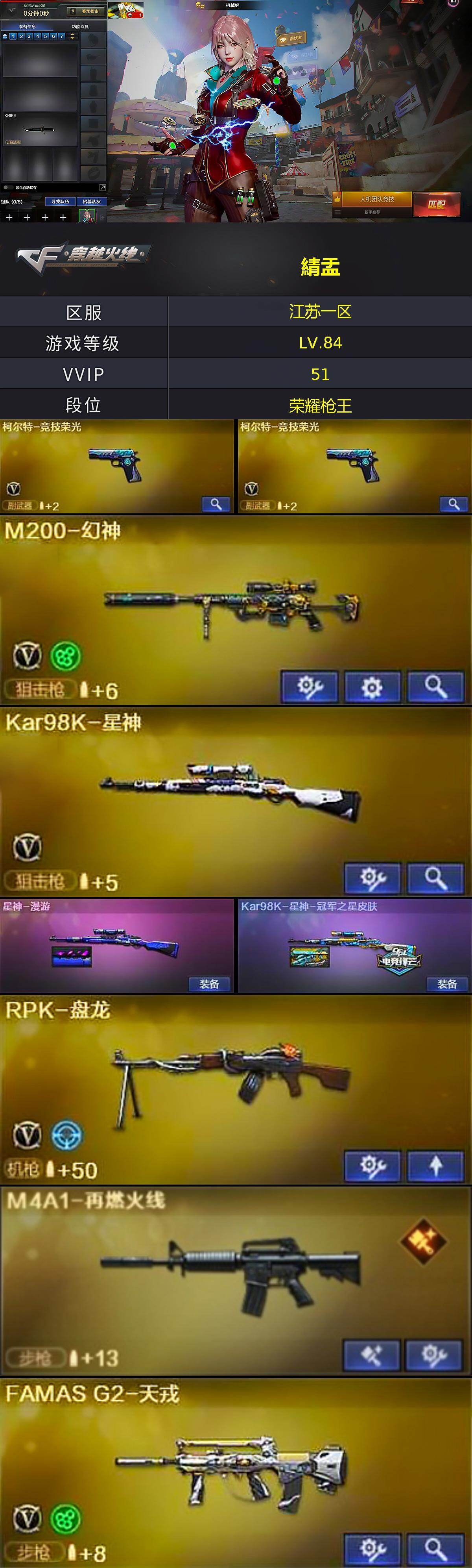 【热门武器】:M200-幻神,死亡之眼,Kar98K-星神,M4A1-黑骑士*2,RPK-盘龙,加特林-炼狱*3,沙鹰-修罗