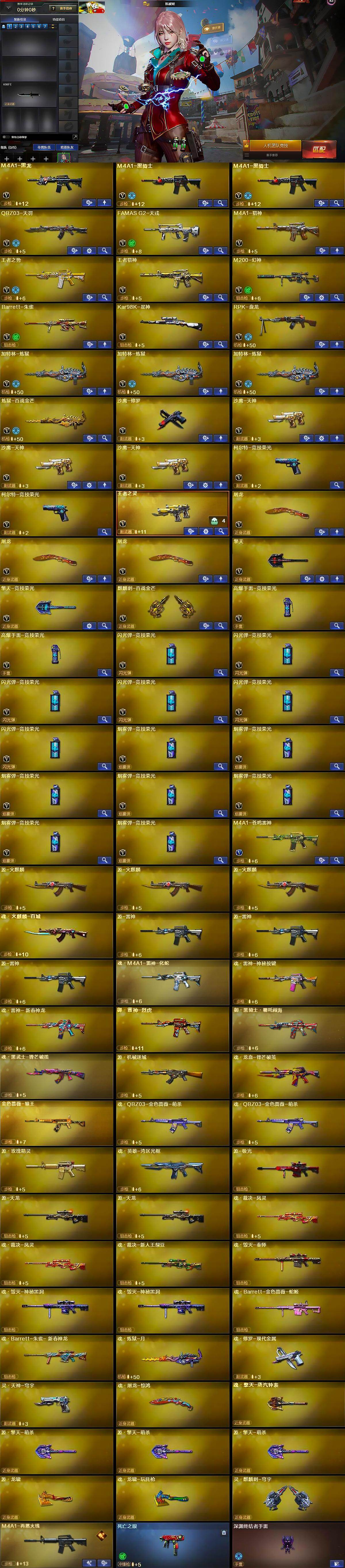 【英雄级武器】:M4A1-黑龙,M4A1-黑骑士*2,QBZ03-天罚,FAMAS G2-天戎,M4A1-猎神,王者之势-觉醒版,王者猎神-觉醒版,M200-幻神,Barrett-朱雀,Kar98K-星神,RPK-盘龙,加特林-炼狱*3,炼狱-百战金芒,沙鹰-修罗,沙鹰-天神*3,柯尔特-竞技荣光*2,王者之灵-觉醒版,屠龙*3,擎天,擎天-竞技荣光,麒麟刺-百战金芒,高爆手雷-竞技荣光*2,闪光弹-竞技荣光*6,烟雾弹-竞技荣光*7,M4A1-苍鸣雷神