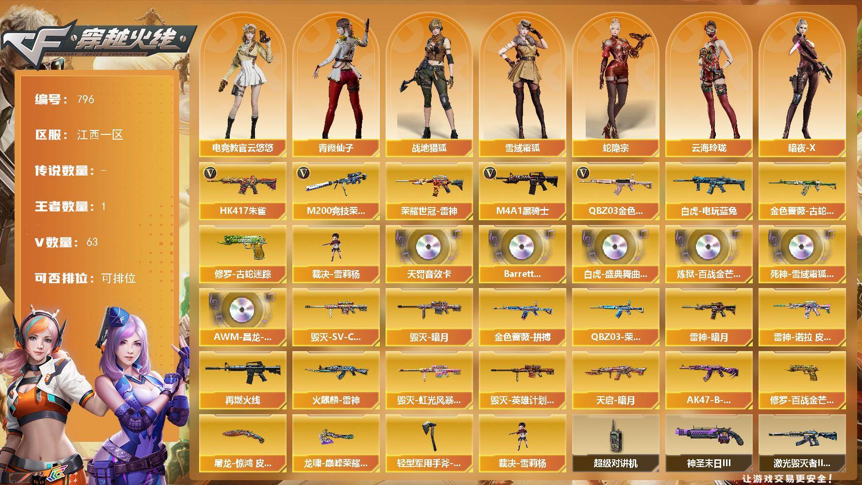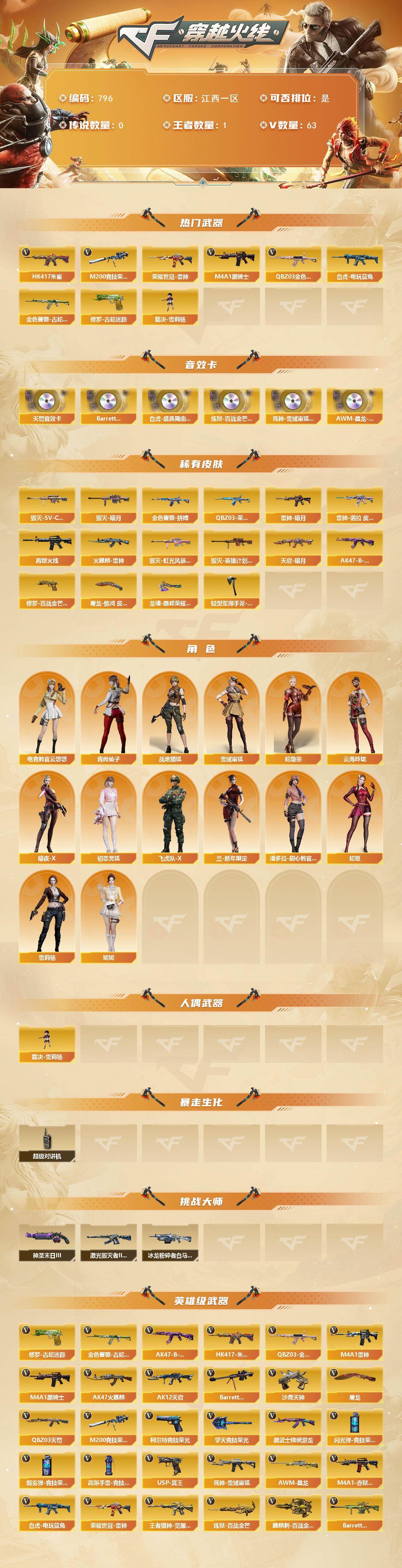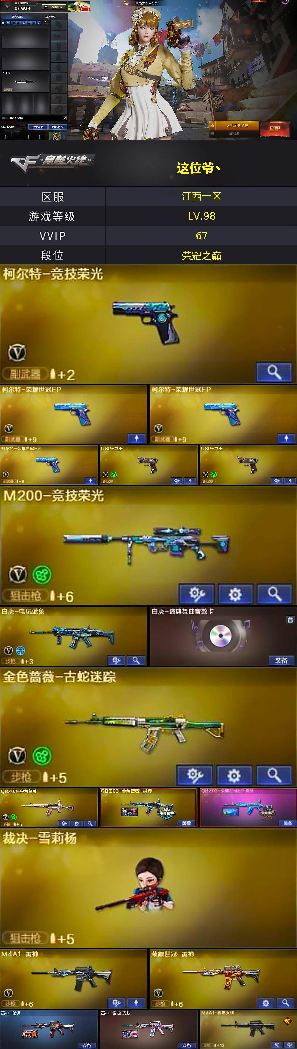 [15523190]江西一区-63V-1王者-0炫金 【热门武器】:QBZ03-金色蔷薇,HK417-朱雀,金色蔷薇-古蛇迷踪,修罗-古蛇迷踪,M200-竞技荣光,荣耀世冠-雷神,白虎-电玩蓝兔,M4A1-黑骑士,裁决-雪莉杨 【音效卡】:QBZ03-天罚音效卡,Barrett-碧霄极光音效卡,白虎-盛典舞曲音效卡,炼狱-百战金芒-庆典舞曲音效卡,死神-雪域霜狐-怀旧音效卡,AWM-昌龙-怀旧音效卡 【皮肤】:QBZ03-金色蔷薇-拼搏,QBZ03-荣耀世冠EP 皮肤,雷神-暗月,雷神-诺拉 皮肤,M4A1-再燃火线,火麒麟-雷神,毁灭-暗月,毁灭-SV-CFPLS16冠军,毁灭-虹光风暴 皮肤,毁灭-英雄计划 皮肤,天启-暗月,AK47-B-常胜将军-曹操,修罗-百战金芒 皮肤,屠龙-惊鸿 皮肤,龙啸-巅峰荣耀 皮肤,轻型军用手斧-再燃火线 【角色】:电竞教官-云悠悠,妮妮,战地猎狐,雪域霜狐,蛇隐宗,云海玲珑,暗夜-X,初恋灵狐,飞虎队-X,兰-新年限定,潘多拉-甜心教官,青霞仙子,蛇姬,雪莉杨 【人偶武器】:裁决-雪莉杨 【暴走生化】:超级对讲机 【挑战大师】:冰龙粉碎者-白马银枪,激光毁灭者III-白马银枪,神圣爆裂者-末日III 【英雄级武器】:AK47-火麒麟,M4A1-雷神,M4A1-黑骑士,AK12-天启,HK417-朱雀,QBZ03-天罚,黑武士-锦绣游龙,金色蔷薇-古蛇迷踪,死神-雪域霜狐,QBZ03-金色蔷薇,AK47-B-常胜将军,白虎-电玩蓝兔,王者猎神-觉醒版,荣耀世冠-雷神,Barrett-毁灭,M200-竞技荣光,炼狱-百战金芒,沙鹰-天神,柯尔特-竞技荣光,柯尔特-荣耀世冠EP*3,USP-冥王*2,修罗-古蛇迷踪,屠龙,擎天-竞技荣光*2,麒麟刺-百战金芒,高爆手雷-竞技荣光*7,高爆手雷-古蛇迷踪,闪光弹-竞技荣光*7,烟雾弹-竞技荣光*8,烟雾弹-古蛇迷踪,烟雾弹-玄豹,烟雾弹-荣耀世冠EP,M4A1-赤狱骑士,AWM-昌龙,Barrett-碧霄极光 【道具】:BS战队炫彩背包,CFS限定背包,亚洲杯纪念炫彩背包,古蛇迷踪炫彩背包,女皇终结者-背包,百战金芒炫彩背包,背包-洛丽塔,超级背包,雪域霜狐炫彩背包,黑桃战神背包,女皇终结者-魔龙之吻,救世主-黑桃战神,绿色巨人,灵魂忍者*2,变异宝贝,迷雾幽灵*2,生化弹匣,夺命之镰,防化服*3,流光