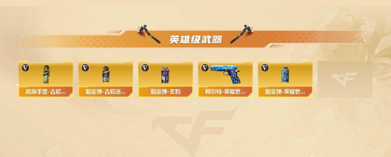【英雄级武器】:AK47-火麒麟,M4A1-雷神,M4A1-黑骑士,AK12-天启,HK417-朱雀,QBZ03-天罚,黑武士-锦绣游龙,金色蔷薇-古蛇迷踪,死神-雪域霜狐,QBZ03-金色蔷薇,AK47-B-常胜将军,白虎-电玩蓝兔,王者猎神-觉醒版,荣耀世冠-雷神,Barrett-毁灭,M200-竞技荣光,炼狱-百战金芒,沙鹰-天神,柯尔特-竞技荣光,柯尔特-荣耀世冠EP*3,USP-冥王*2,修罗-古蛇迷踪,屠龙,擎天-竞技荣光*2,麒麟刺-百战金芒,高爆手雷-竞技荣光*7,高爆手雷-古蛇迷踪,闪光弹-竞技荣光*7,烟雾弹-竞技荣光*8,烟雾弹-古蛇迷踪,烟雾弹-玄豹,烟雾弹-荣耀世冠EP,M4A1-赤狱骑士,AWM-昌龙,Barrett-碧霄极光
