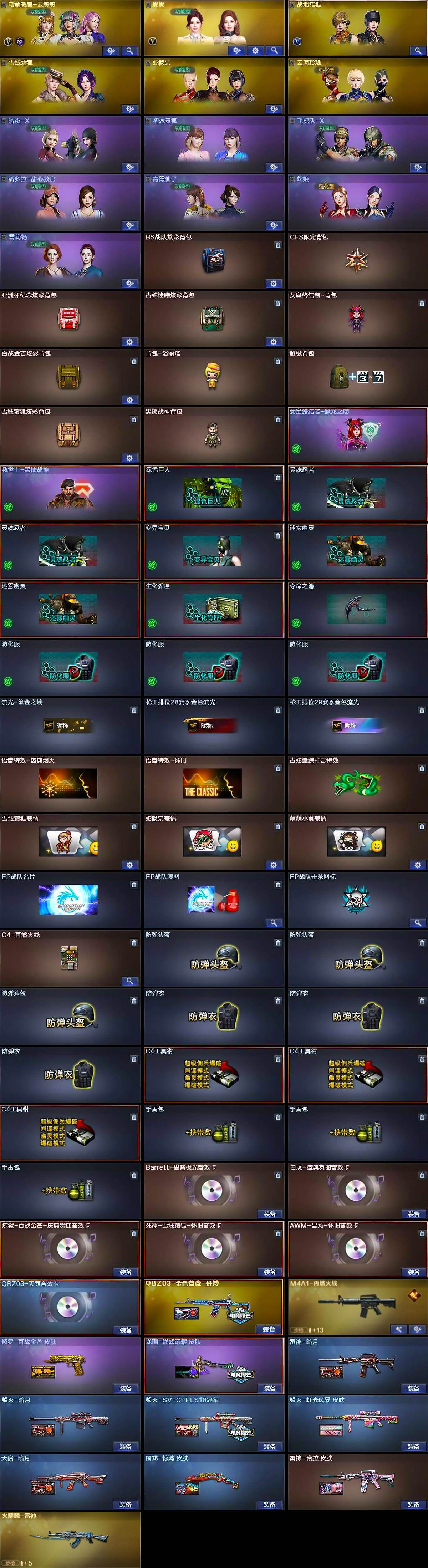 【道具】:BS战队炫彩背包,CFS限定背包,亚洲杯纪念炫彩背包,古蛇迷踪炫彩背包,女皇终结者-背包,百战金芒炫彩背包,背包-洛丽塔,超级背包,雪域霜狐炫彩背包,黑桃战神背包,女皇终结者-魔龙之吻,救世主-黑桃战神,绿色巨人,灵魂忍者*2,变异宝贝,迷雾幽灵*2,生化弹匣,夺命之镰,防化服*3,流光