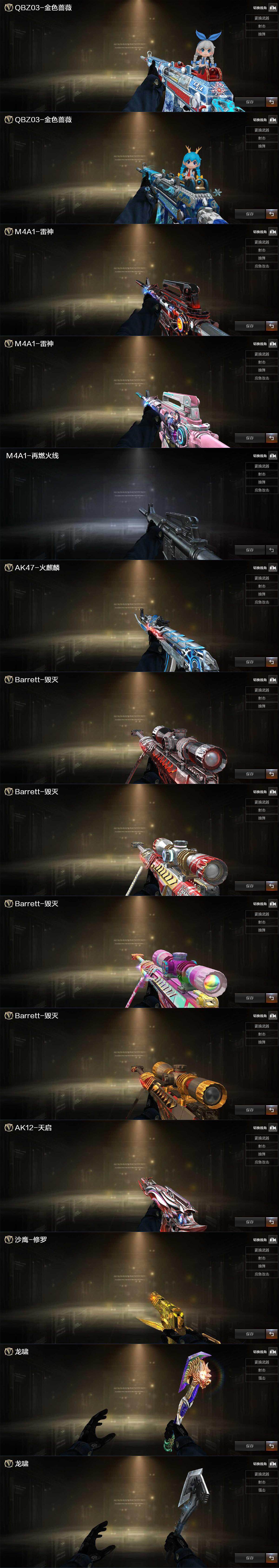 【热门武器】:QBZ03-金色蔷薇,HK417-朱雀,金色蔷薇-古蛇迷踪,修罗-古蛇迷踪,M200-竞技荣光,荣耀世冠-雷神,白虎-电玩蓝兔,M4A1-黑骑士,裁决-雪莉杨