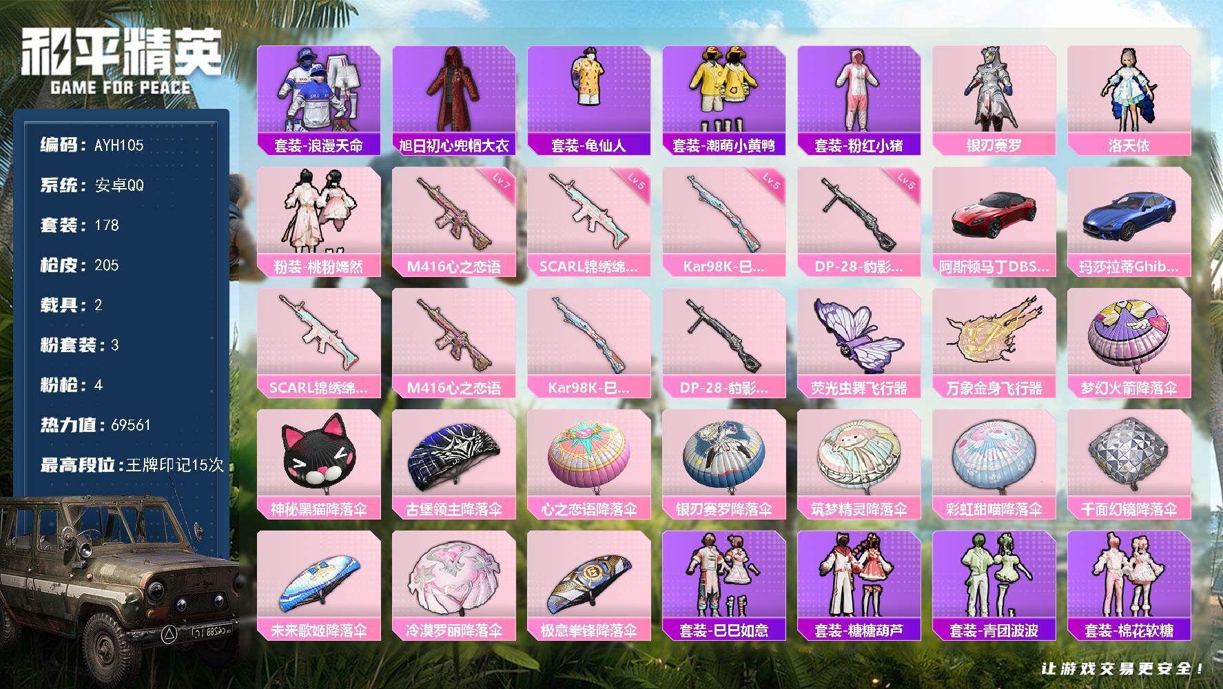 [15606790]地铁满天赋/【店主推荐捡漏号!可直接换绑安卓 手Q-3粉装-4特效枪-2载具-3粉色飞行器-69561热力值-15王牌印记-178套装-205枪皮
