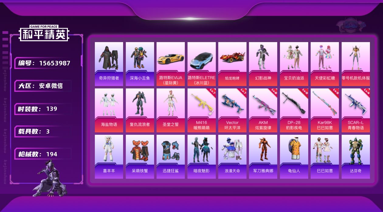 [15653987]【特价出售/店主推荐】 安卓 微信-7粉装-6特效枪-3载具-2粉色飞行器-65511热力值-14王牌印记-139套装-194枪皮 【热门品类】:套装-浪漫天命,套装-深海小丑鱼,套装-奇异狩猎者,角色-军刀雅典娜,套装-龟仙人 【粉色套装】:粉装-幻影战神,粉装-宝贝奶油派,粉装-天使彩虹糖,角色-零号机款机体服,粉装-海盐物语,角色-复仇流浪者,角色-圣堂之誓 【粉色枪皮等级】:AKM-炫紫旋律(六级),SCAR-L-青春物语(四级),M416-暖熊萌萌(七级),Vector-环太平洋(七级),Kar98K-巳巳如意(五级),DP-28-豹影疾电(五级) 【粉色载具】:路特斯EVIJA(星际黄),路特斯ELETRE(冰川蓝),焰龙咆哮 【粉色枪皮】:AKM-炫紫旋律,SCAR-L-青春物语,M416-暖熊萌萌,Vector-环太平洋,Kar98K-巳巳如意,DP-28-豹影疾电 【粉色飞行器】:青春物语飞行器 【粉色降落伞】:幻影战神降落伞,百万伏特降落伞,甜心宝贝降落伞,至尊龙雀降落伞,香水柠檬降落伞,碧影闪光降落伞,青春物语降落伞,橘柚倾心降落伞,筑梦精灵降落伞,环太平洋降落伞,暖熊萌萌降落伞,暗夜鎏金降落伞,临安公主降落伞,月影灵韵降落伞,异瞳寒姬降落伞,炫彩糖果降落伞 【稀有套装】:套装-龟仙人,套装-巳巳如意,角色-达芬奇,角色-许七安,玩偶服-喜羊羊,套装-炫彩糖果 【稀有枪皮】:AKM-夜灯,AKM-奇异狩猎者,AKM-彩虹符号,AKM-灼热熔岩,AKM-环太平洋,AKM-缤纷海域,AKM-虎虎生威,AKM-龙的传人,M16A4-幻世战舞者,M16A4-甜心亚梦,SCAR-L-暗夜玫瑰,SCAR-L-玉兔迎春,SCAR-L-碧影闪光,SCAR-L-红色方程式,M416-月影鸳鸯,M416-糯团青竹,M416-红色方程式,M416-绯红前夜,M416-绿野极光,GROZA-异彩先驱,GROZA-田园牧歌,GROZA-青春物语,AUG-天降萌叽,AUG-幻影战神,AUG-耀粉歌者,QBZ-彩虹符号,QBZ-飞驰魅影,M762-天降萌叽,M762-暖熊萌萌,M762-橘柚倾心,M762-绯红前夜,M762-萌物绒绒,Mk47-妙红点点,G36C-暗夜玫瑰,AC-VAL-天降萌叽,AC-VAL-快闪甜心,AC-VAL-甜心亚梦,蜜獾-天降萌叽,蜜獾-娇憨