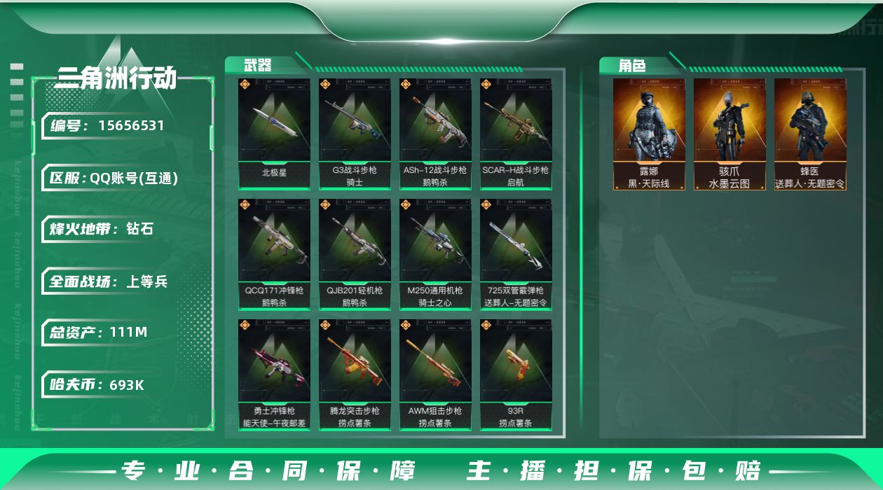 [15656531]【特价出售/店主推荐】 111m总资产-693k哈伏币-60烽火等级-钻石-17战场等级-上等兵 【干员外观】:骇爪-水墨云图,露娜-黑·天际线,蜂医-送葬人·无题密令 【近战皮肤】:近战-北极星,近战-黑鹰 【传说外观】:M4A1突击步枪-阿米娅,ASh-12战斗步枪-鹅鸭杀,AK-12突击步枪-特斯拉线圈,SCAR-H战斗步枪-水墨云图,SCAR-H战斗步枪-启航,G3战斗步枪-骑士,CAR-15突击步枪-阿米娅,腾龙突击步枪-捞点薯条,K437突击步枪-北极星,UZI冲锋枪-特斯拉线圈,SR-3M紧凑突击步枪-特斯拉线圈,勇士冲锋枪-能天使-午夜邮差,QCQ171冲锋枪-北极星,QCQ171冲锋枪-鹅鸭杀,725双管霰弹枪-送葬人-无题密令,M250通用机枪-骑士之心,QJB201轻机枪-鹅鸭杀,AWM狙击步枪-捞点薯条,93R-捞点薯条,复合弓-黑·天际线 【史诗外观】:ASh-12战斗步枪-无极限,M16A4突击步枪-竞赛选手,AS Val突击步枪-典狱官,腾龙突击步枪-无垢,腾龙突击步枪-猎鳄行动,K437突击步枪-守护者,MP5冲锋枪-战术竞备,MP5冲锋枪-竞技风,Vector冲锋枪-猎鳄行动,SR-3M紧凑突击步枪-荒野求生,SR-3M紧凑突击步枪-战术竞备,勇士冲锋枪-工业狂潮,MP7冲锋枪-无垢,MP7冲锋枪-守护者,PKM通用机枪-蝮蛇,PKM通用机枪-荒野求生,M250通用机枪-囚徒,Mini-14射手步枪-守护者,SVD狙击步枪-阿萨拉工艺,SVD狙击步枪-荒野求生,PSG-1射手步枪-无垢,SV-98狙击步枪-林中猎手,AWM狙击步枪-无极限,沙漠之鹰-曙光,复合弓-守护者 【稀有外观】:M1014霰弹枪-花岗岩,SV-98狙击步枪-花岗岩,AS Val突击步枪-地平线,AKM突击步枪-战术演练,AKM突击步枪-肃杀,QBZ95-1突击步枪-医疗协议,QBZ95-1突击步枪-公平竞技,K416突击步枪-虎啸,M7战斗步枪-捣蛋鬼,SCAR-H战斗步枪-荣耀列队,SCAR-H战斗步枪-黄昏,G3战斗步枪-战术演练,G3战斗步枪-主宰,腾龙突击步枪-雪崩,K437突击步枪-天狼星,MP5冲锋枪-弄臣,MP5冲锋枪-虎啸,MP5冲锋枪-哈夫克卫队,P90冲锋枪-黄昏,Vector冲锋枪-先锋,UZI冲锋枪-亚特兰蒂斯,SMG-45-行动开启