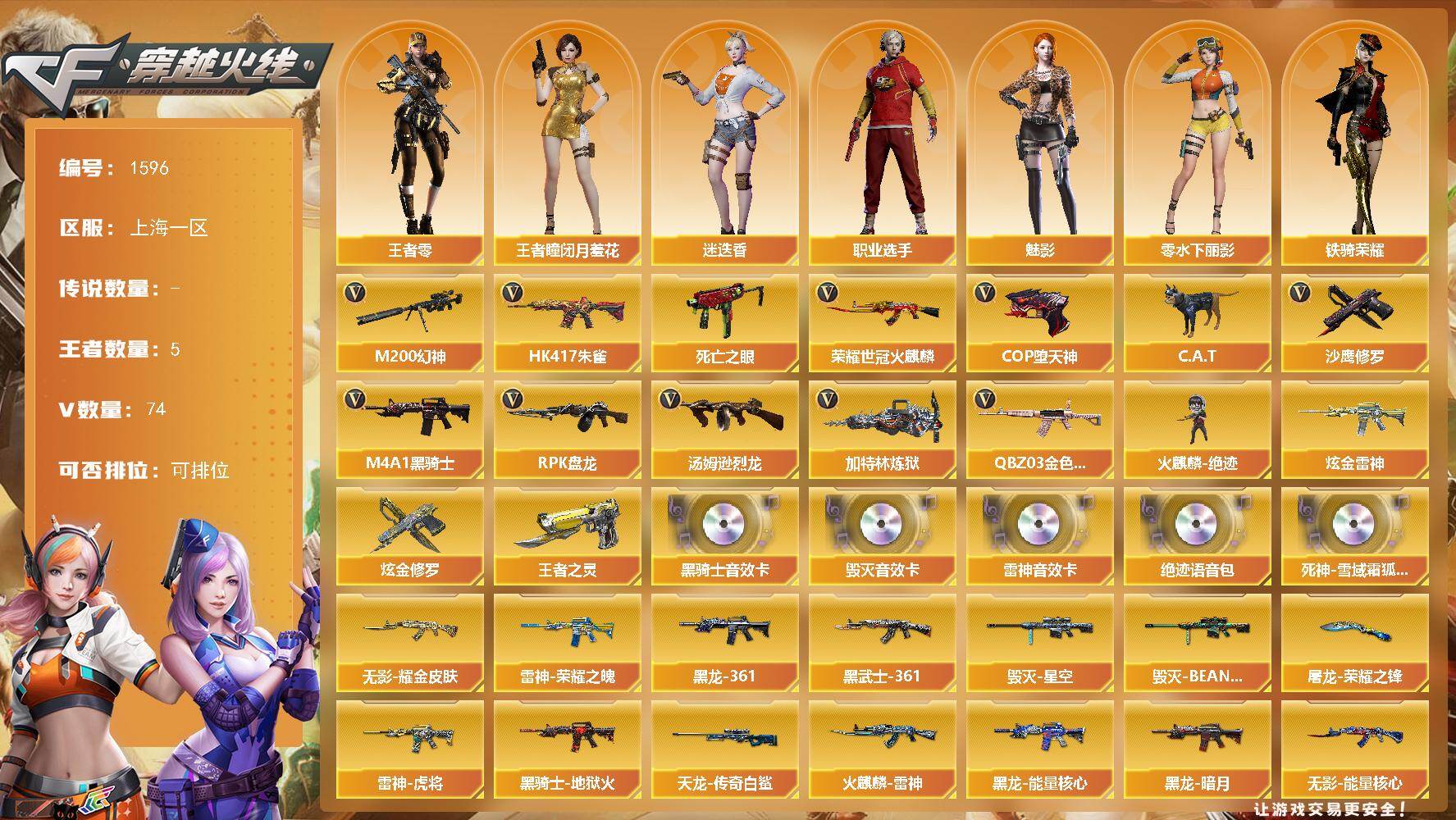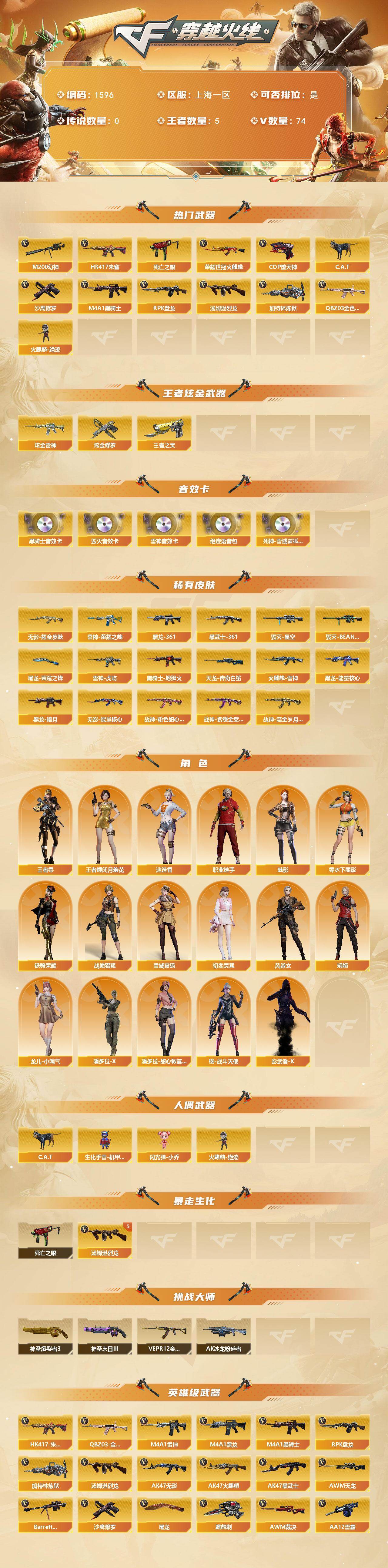 [15656660]上海一区-74V-5王者-2炫金 【热门武器】:QBZ03-金色蔷薇,HK417-朱雀,M200-幻神,死亡之眼,荣耀世冠-火麒麟,C.A.T,M4A1-黑骑士,汤姆逊-烈龙*5,RPK-盘龙*3,加特林-炼狱*2,火麒麟-绝迹,COP-堕天神*2,沙鹰-修罗*4 【王者炫金武器】:王者之灵,炫金雷神,炫金修罗 【音效卡】:M4A1-雷神音效卡,M4A1-黑骑士音效卡,Barrett-毁灭音效卡,绝迹语音包,死神-雪域霜狐-怀旧音效卡 【皮肤】:雷神-荣耀之魄,雷神-虎将*2,火麒麟-雷神,毁灭-星空,毁灭-BEAN-2020MVP,黑龙-能量核心,黑龙-暗月,M4A1-黑龙-361,黑骑士-地狱火,无影-能量核心,无影耀金皮肤*2,AK47-黑武士-361,战神-粉色甜心皮肤,战神-紫绶金章皮肤*3,战神-流金岁月皮肤*2,AWM-天龙-传奇白鲨,屠龙-荣耀之锋 【角色】:魅影,迷迭香,战地猎狐,王者-瞳-闭月羞花,王者-零,雪域霜狐,初恋灵狐,风暴女,娟娟,零-水下丽影,龙儿-小淘气,潘多拉-X,潘多拉-甜心教官,铁骑荣耀,樱-战斗天使,影武者-X,职业选手 【人偶武器】:火麒麟-绝迹,C.A.T,生化手雷-机甲核心,闪光弹-小乔 【暴走生化】:死亡之眼 【挑战大师】:神圣爆裂者III,AK47-冰龙粉碎者,VEPR-12-金魔,神圣爆裂者-末日III 【英雄级武器】:AK47-火麒麟,M4A1-黑龙,M4A1-雷神*2,M4A1-黑骑士,AK47-无影,AK47-黑武士*2,AK47-黑鲨,HK417-朱雀,QBZ03-金色蔷薇,AK-47-猩红传说*4,AK47-B-战神,荣耀世冠-火麒麟,黑武士-CF网剧冠军,AWM-天龙*2,Barrett-毁灭*3,AWM-裁决,M200-幻神,王者之力-觉醒版,RPK-盘龙*3,加特林-炼狱*2,汤姆逊-烈龙*5,烈龙-悦心-觉醒版,AA-12-雷霆,沙鹰-修罗*4,COP-堕天神*2,破空枪刃-夜魔*2,天神-CF网剧冠军,屠龙*3,马来剑-夜魔,麒麟刺,擎天-CF网剧冠军,王者之啸-觉醒版*2,高爆手雷-夜魔*4,闪光弹-夜魔*4,烟雾弹-夜魔*4 【道具】:XROCK炫彩背包,战舰背包,炫彩背包,超级背包,雪域霜狐炫彩背包,黄金魔花研究所背包,救世主-黑桃战神,妩媚妖姬,绿色巨人,灵魂忍者*2,妖姬,迷雾幽灵