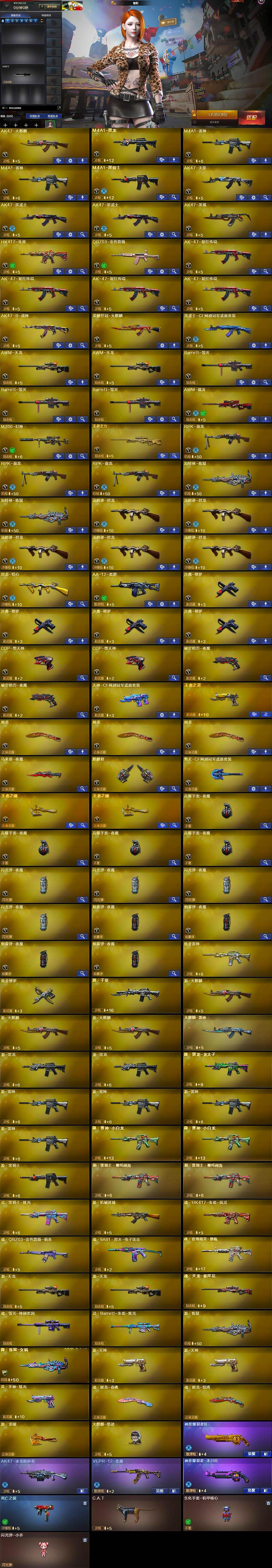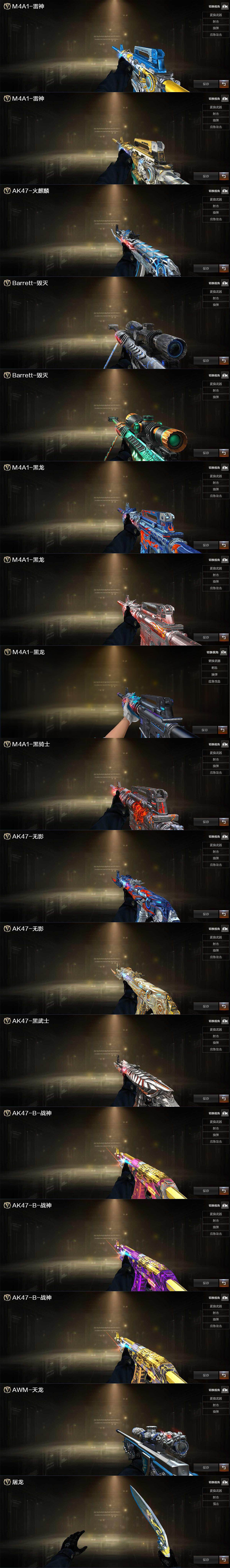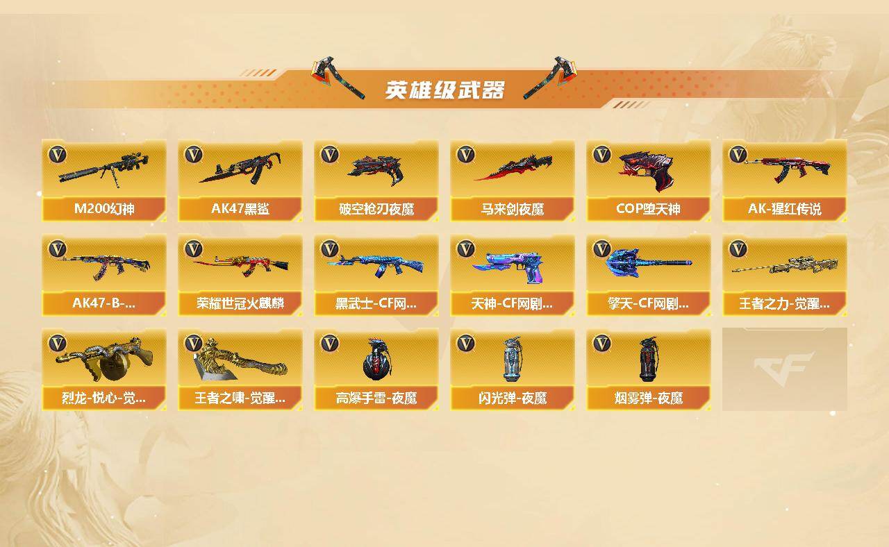 【英雄级武器】:AK47-火麒麟,M4A1-黑龙,M4A1-雷神*2,M4A1-黑骑士,AK47-无影,AK47-黑武士*2,AK47-黑鲨,HK417-朱雀,QBZ03-金色蔷薇,AK-47-猩红传说*4,AK47-B-战神,荣耀世冠-火麒麟,黑武士-CF网剧冠军,AWM-天龙*2,Barrett-毁灭*3,AWM-裁决,M200-幻神,王者之力-觉醒版,RPK-盘龙*3,加特林-炼狱*2,汤姆逊-烈龙*5,烈龙-悦心-觉醒版,AA-12-雷霆,沙鹰-修罗*4,COP-堕天神*2,破空枪刃-夜魔*2,天神-CF网剧冠军,屠龙*3,马来剑-夜魔,麒麟刺,擎天-CF网剧冠军,王者之啸-觉醒版*2,高爆手雷-夜魔*4,闪光弹-夜魔*4,烟雾弹-夜魔*4