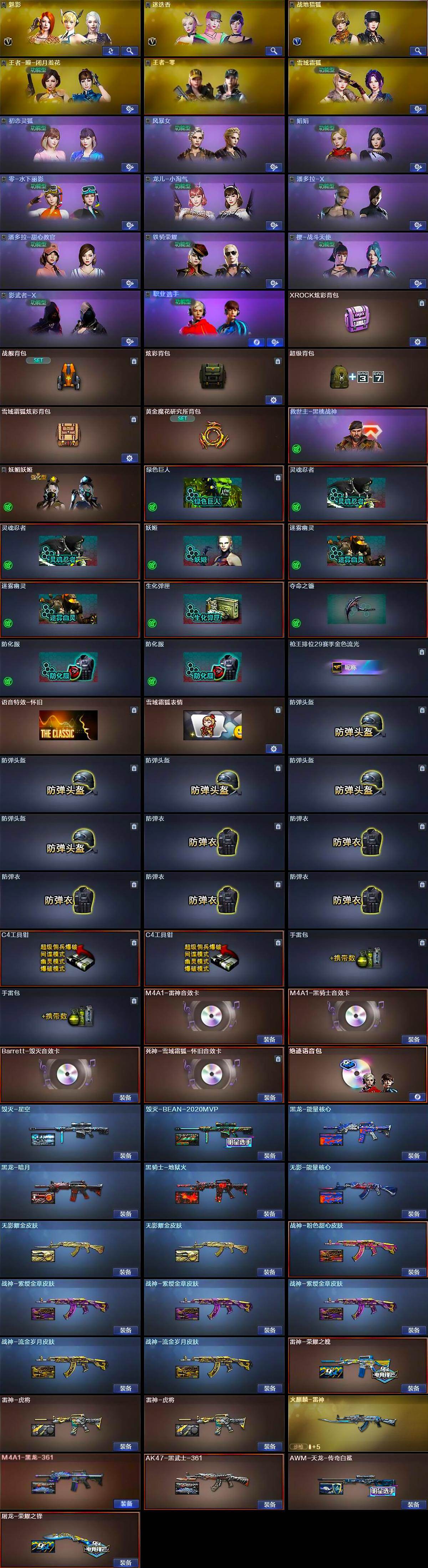 【皮肤】:雷神-荣耀之魄,雷神-虎将*2,火麒麟-雷神,毁灭-星空,毁灭-BEAN-2020MVP,黑龙-能量核心,黑龙-暗月,M4A1-黑龙-361,黑骑士-地狱火,无影-能量核心,无影耀金皮肤*2,AK47-黑武士-361,战神-粉色甜心皮肤,战神-紫绶金章皮肤*3,战神-流金岁月皮肤*2,AWM-天龙-传奇白鲨,屠龙-荣耀之锋