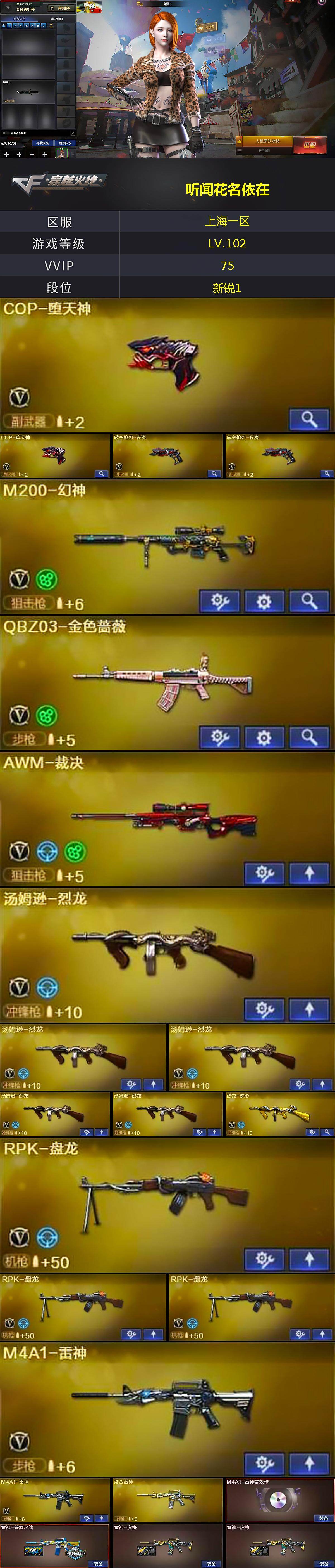 【热门武器】:QBZ03-金色蔷薇,HK417-朱雀,M200-幻神,死亡之眼,荣耀世冠-火麒麟,C.A.T,M4A1-黑骑士,汤姆逊-烈龙*5,RPK-盘龙*3,加特林-炼狱*2,火麒麟-绝迹,COP-堕天神*2,沙鹰-修罗*4