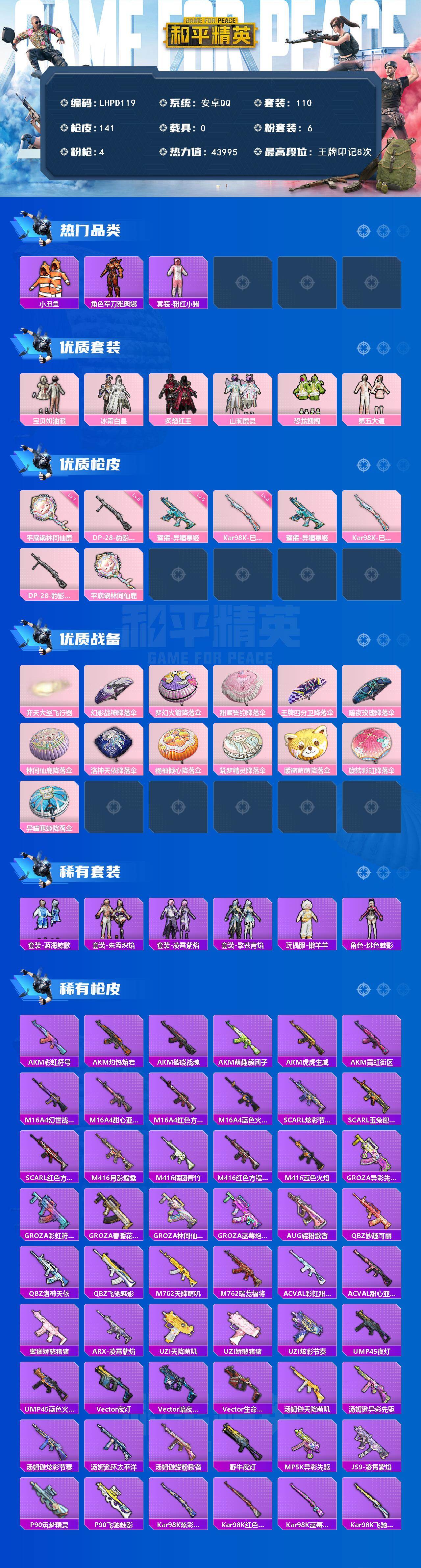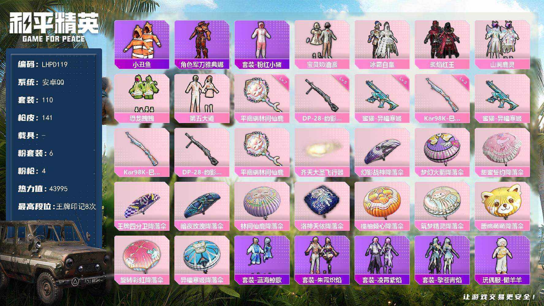 [15657290]【特价出售/店主推荐】安卓 手Q-6粉装-4特效枪-0载具-2粉色飞行器-43995热力值-8王牌印记-110套装-141枪皮【热门品类】:套装-小丑鱼,角色-军刀雅典娜,套装-粉红小猪【粉色套装】:粉装-宝贝奶油派,粉装-冰霜白皇,粉装-炙焰红王,粉装-山涧鹿灵,粉装-恐龙拽拽,粉装-第五大道【粉色枪皮等级】:蜜獾-异瞳寒姬(五级),Kar98K-巳巳如意(三级),DP-28-豹影疾电(五级),平底锅-林间仙鹿(七级)【粉色枪皮】:蜜獾-异瞳寒姬,Kar98K-巳巳如意,DP-28-豹影疾电,平底锅-林间仙鹿【粉色飞行器】:齐天大圣飞行器