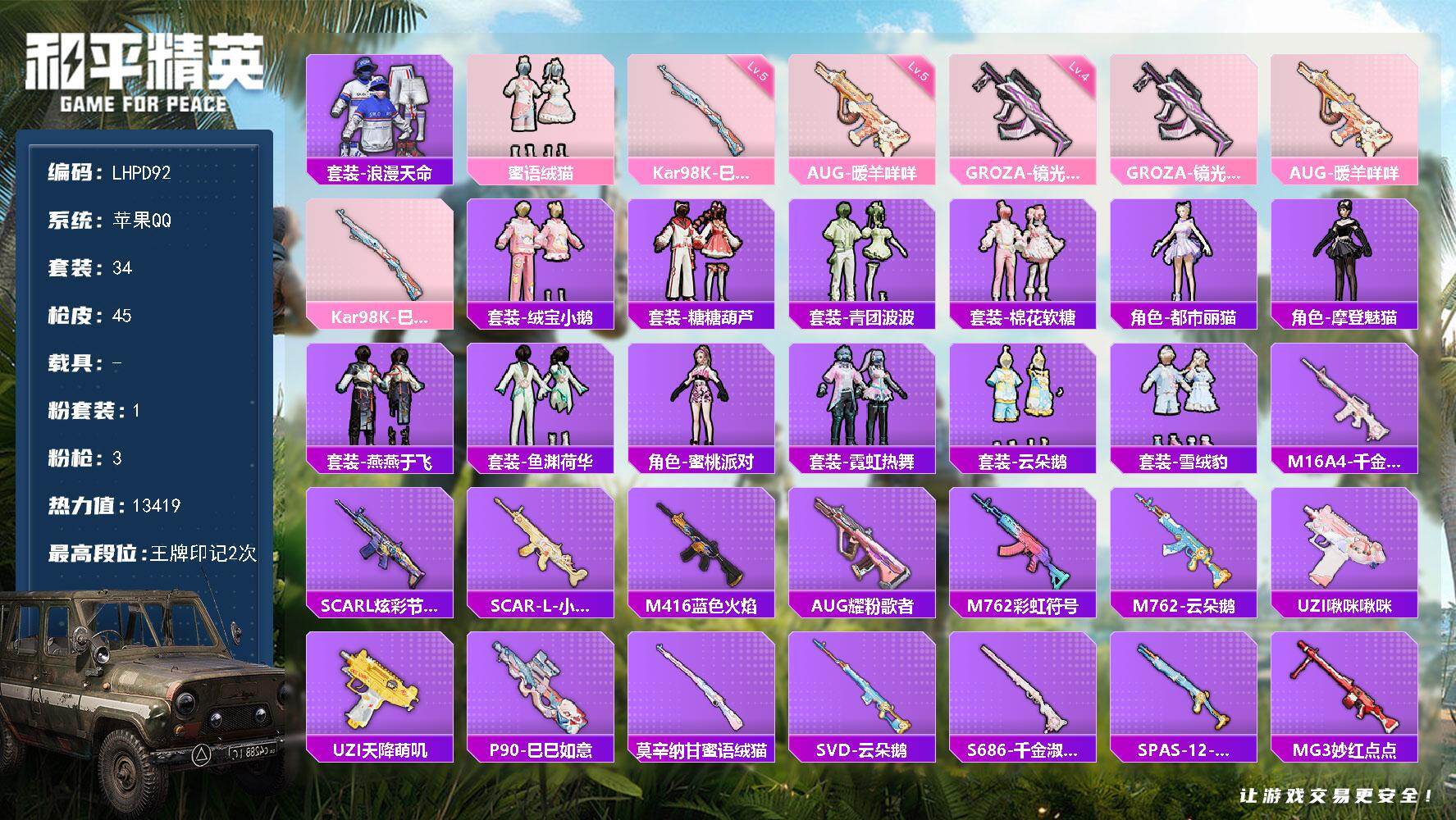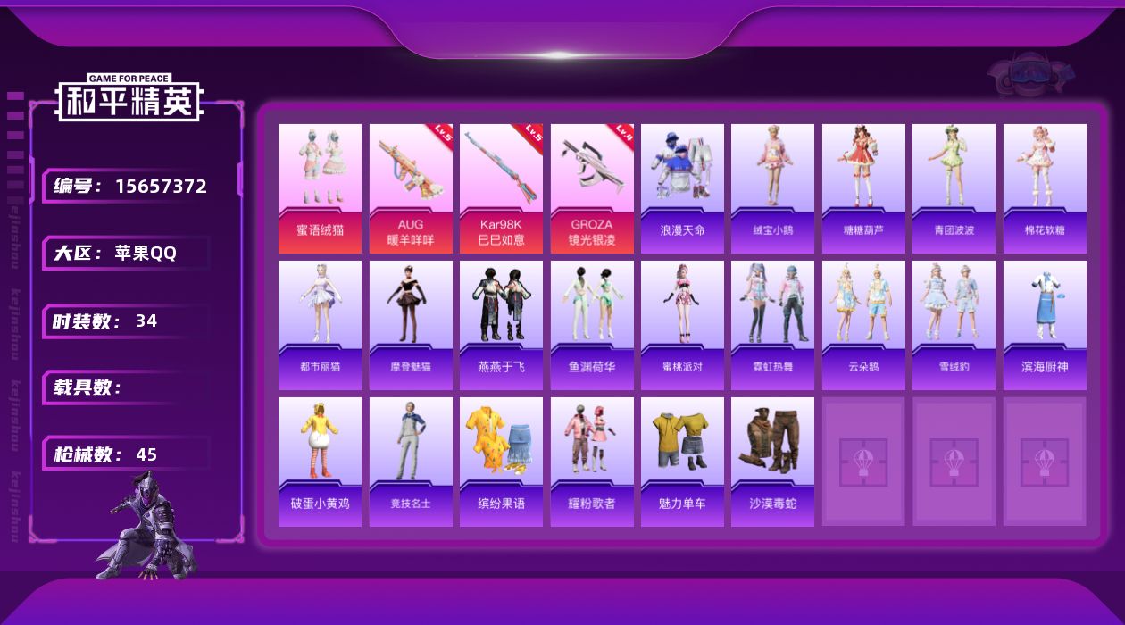 [15657372]【特价出售/店主推荐】苹果 手Q-1粉装-3特效枪-0载具-0粉色飞行器-13419热力值-2王牌印记-34套装-45枪皮【热门品类】:套装-浪漫天命【粉色套装】:粉装-蜜语绒猫【粉色枪皮等级】:GROZA-镜光银凌(四级),AUG-暖羊咩咩(五级),Kar98K-巳巳如意(五级)【粉色枪皮】:GROZA-镜光银凌,AUG-暖羊咩咩,Kar98K-巳巳如意【稀有套装】:套装-绒宝小鹅,套装-糖糖葫芦,套装-青团波波,套装-棉花软糖,角色-都市丽猫,角色-摩登魅猫,套装-燕燕于飞,套装-鱼渊荷华,角色-蜜桃派对,套装-霓虹热舞,套装-云朵鹅,套装-雪绒豹