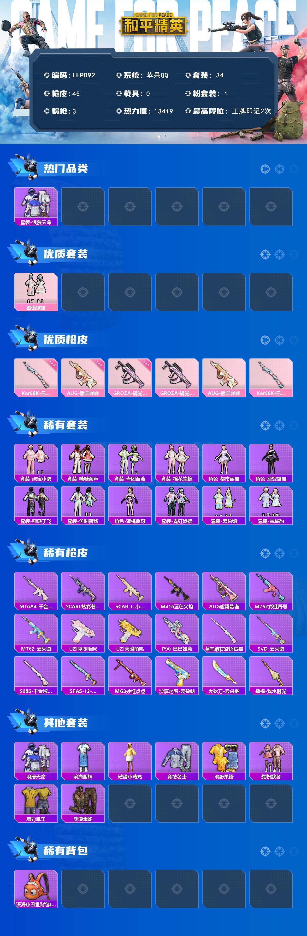 - [15447254]【特价出售/店主推荐】苹果 手Q-0粉装-3特效枪-1载具-1粉色飞行器-21664热力值-7王牌印记-63套装-67枪皮 【粉色枪皮等级】:SCAR-L-锦绣绵绵(五级),AUG-暖羊咩咩(五级),Kar98K-巳巳如意(五级) 【粉色载具】:合金龙骨(绿) 【粉色枪皮】:SCAR-L-锦绣绵绵,AUG-暖羊咩咩,Kar98K-巳巳如意 【粉色飞行器】:梦幻火箭飞行器 【粉色降落伞】:第五大道降落伞 【稀有套装】:套装-燕燕于飞,套装-鱼渊荷华,角色-蜜桃派对,套装-紫幽梦,套装-蓝冰羽 【稀有枪皮】:AKM-彩虹符号,AKM-霓虹街区,AKM-龙的传人,M16A4-幻世战舞者,SCAR-L-红色方程式,M416-夜灯,M416-糯团青竹,GROZA-异彩先驱,GROZA-恐龙拽拽,AUG-天降萌叽,AUG-耀粉歌者,QBZ-彩虹符号,QBZ-飞驰魅影,M762-天降萌叽,AC-VAL-天降萌叽,蜜獾-娇憨猪猪,UZI-天降萌叽,UZI-娇憨猪猪,汤姆逊-异彩先驱,MP5K-异彩先驱,P90-飞驰魅影,Kar98K-彩虹符号,Kar98K-炫彩节奏,Kar98K-飞驰魅影,AWM-恐龙拽拽,Mini14-异彩先驱,Mini14-梦幻火箭,SLR-娇憨猪猪,S1897-炫彩节奏,S1897-神秘黑猫,S1897-飞驰魅影,S12K-玩趣呆呆,S12K-娇憨猪猪,S12K-幻世战舞者,DBS-第五大道,DBS-荧海星豚,MG3-幻世战舞者 【其他套装】:套装-SS18特训,套装-SS19特训,套装-SS20特训,套装-SS21特训,套装-SS22特训,套装-SS23特训,套装-SS24特训,套装-SS25特训,套装-SS28特训,套装-夏日音浪,套装-幻世战舞者,套装-幻影武者,套装-探宝勇士,套装-春日漫步,套装-极速红龙,套装-柠萌假日,套装-湖蓝色名流,套装-灼焰舞者,套装-炫蓝之夏,套装-特殊使命,套装-特训学院,套装-狂战萌兔,套装-玉兔迎春,套装-白熊同盟,套装-白色伏地魔,套装-破蛋小黄鸡,套装-空投萌叽,套装-竞技名士,套装-红色运动,套装-绮丽涂鸦,套装-绯格组合,套装-缤纷果语,套装-萌黄之夏,套装-都市漫游者,套装-长空猛禽,套装-霓虹街区,套装-青年教官,套装-魅力单车,套装-鹤鸣,套装-麻辣教官,套装-黄色伏地魔,套装-龙的传人,套装-雪山