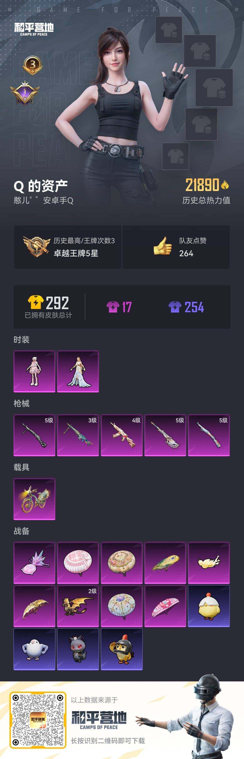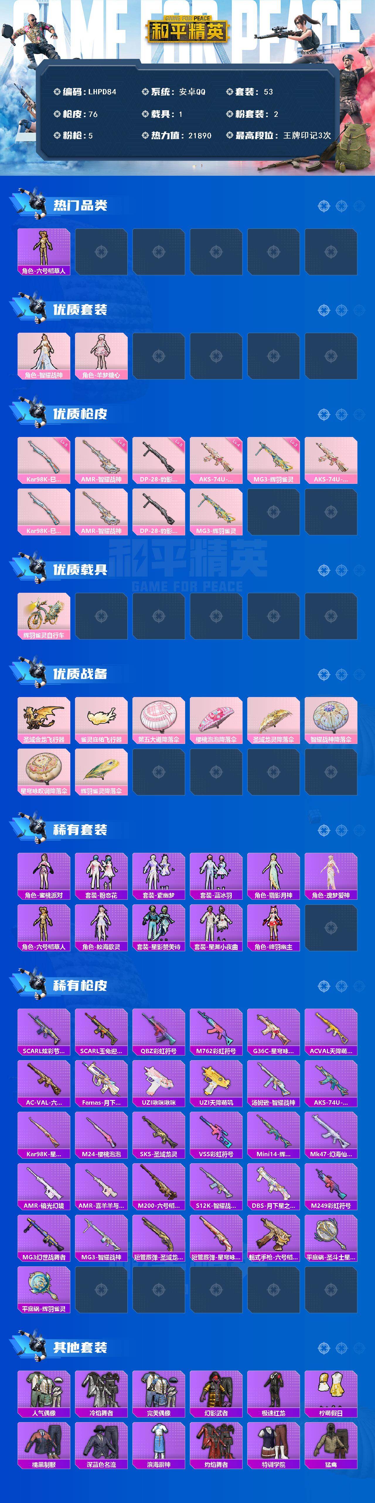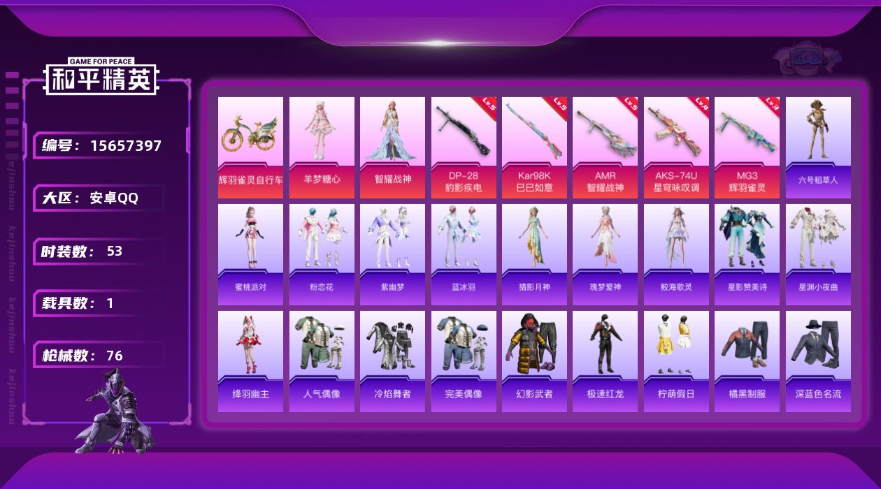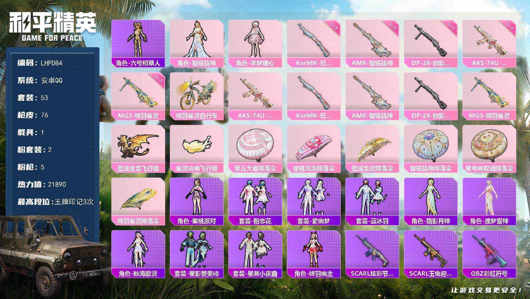 [15657397]【特价出售/店主推荐】安卓 手Q-2粉装-5特效枪-1载具-3粉色飞行器-21890热力值-3王牌印记-53套装-76枪皮【热门品类】:角色-六号稻草人【粉色套装】:角色-智耀战神,角色-羊梦糖心【粉色枪皮等级】:AKS-74U-星穹咏叹调(四级),Kar98K-巳巳如意(五级),AMR-智耀战神(五级),DP-28-豹影疾电(五级),MG3-辉羽雀灵(三级)【粉色载具】:辉羽雀灵自行车【粉色枪皮】:AKS-74U-星穹咏叹调,Kar98K-巳巳如意,AMR-智耀战神,DP-28-豹影疾电,MG3-辉羽雀灵【粉色飞行器】:圣域金龙飞行器,雀灵庇佑飞行器