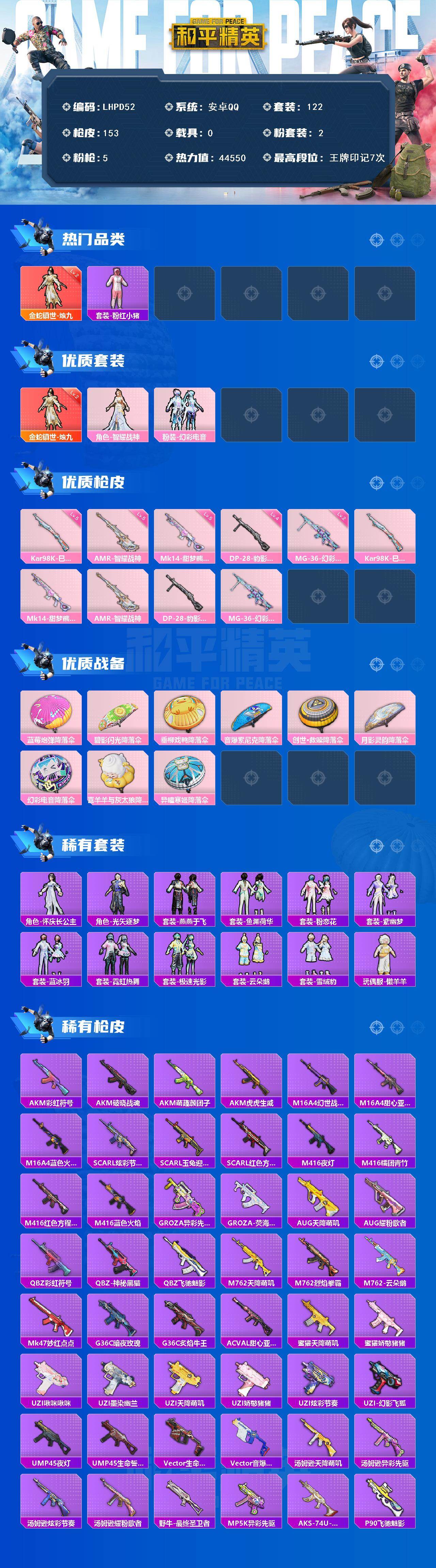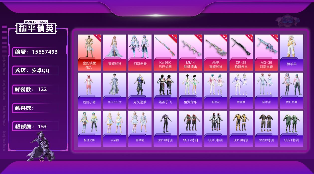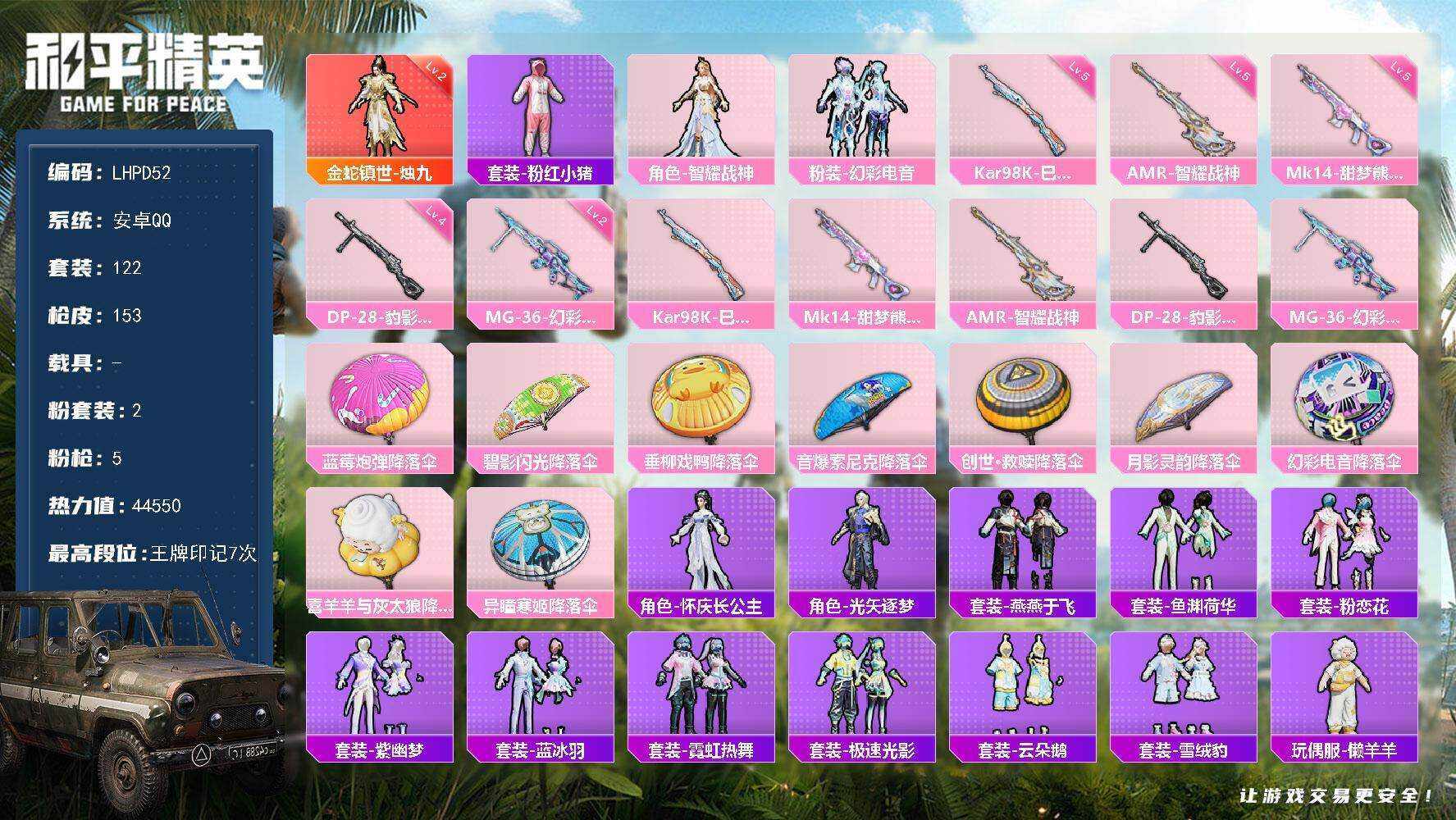 [15657493]【特价出售/店主推荐】安卓 手Q-1神装-2粉装-5特效枪-0载具-1粉色飞行器-44550热力值-7王牌印记-122套装-153枪皮【红色神装等级】:金蛇镇世-烛九(二级)【红色角色神装】:金蛇镇世-烛九【热门品类】:套装-粉红小猪【粉色套装】:角色-智耀战神,粉装-幻彩电音【粉色枪皮等级】:Kar98K-巳巳如意(五级),Mk14-甜梦熊击(五级),AMR-智耀战神(五级),DP-28-豹影疾电(四级),MG-36-幻彩电音(二级)【粉色枪皮】:Kar98K-巳巳如意,Mk14-甜梦熊击,AMR-智耀战神,DP-28-豹影疾电,MG-36-幻彩电音