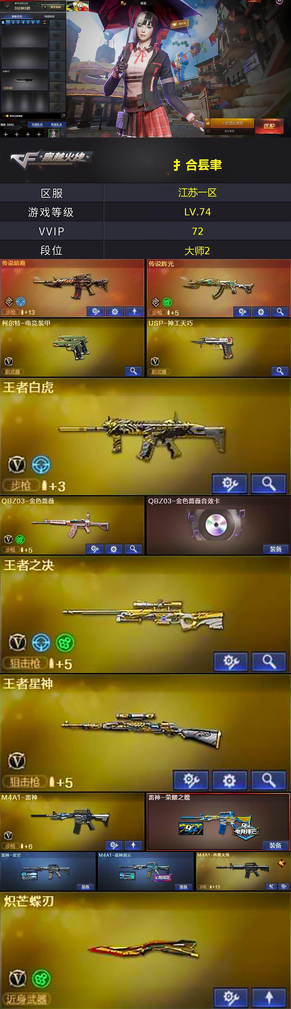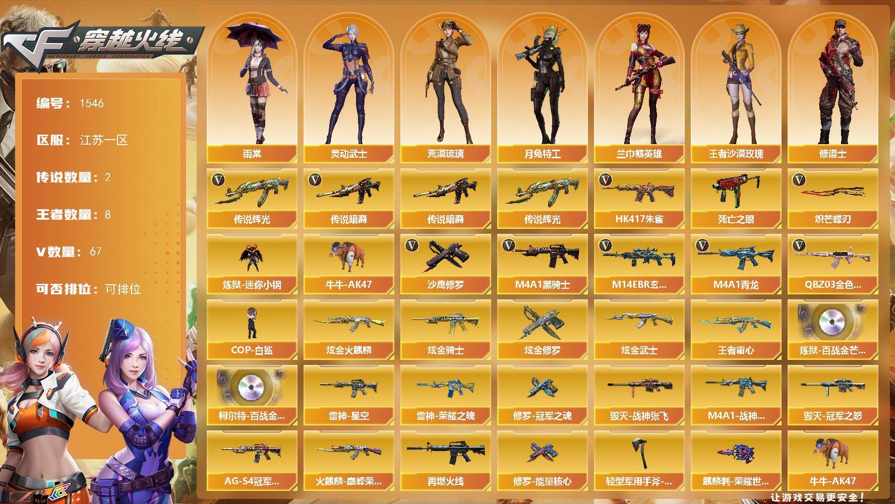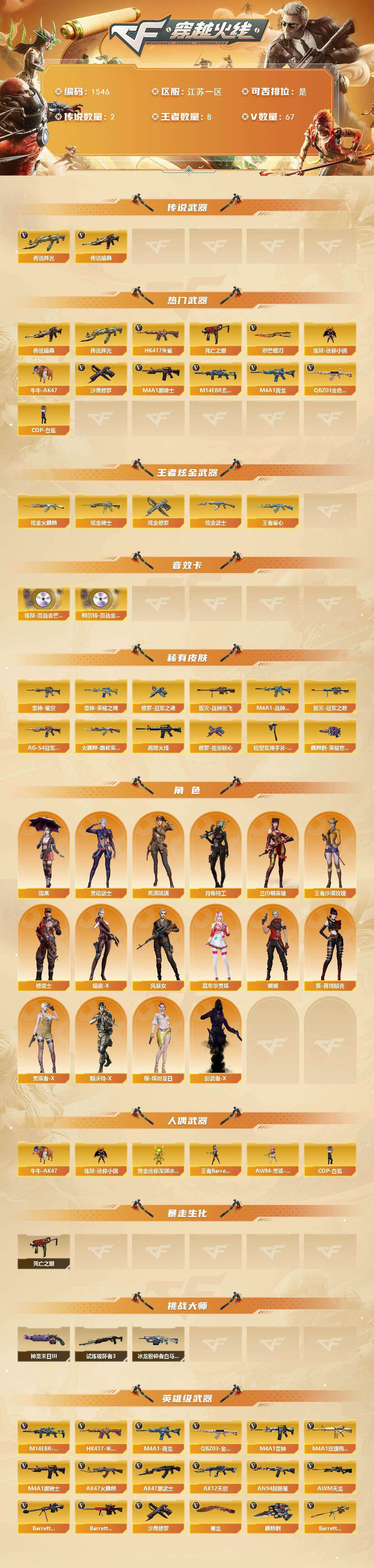 [15657837]江苏一区-67V-8王者-4炫金 【传说武器】:传说暗裔,传说辉光 【热门武器】:传说暗裔,传说辉光,QBZ03-金色蔷薇,M14EBR-玄武,HK417-朱雀,M4A1-青龙,死亡之眼,炼狱-迷你小钢,牛牛-AK47,M4A1-黑骑士,COP-白鲨*2,沙鹰-修罗,炽芒蝶刃 【王者炫金武器】:王者霜心*2,炫金火麒麟,炫金骑士,炫金武士,炫金修罗 【音效卡】:炼狱-百战金芒-庆典舞曲音效卡,柯尔特-百战金芒-庆典舞曲音效卡 【皮肤】:雷神-荣耀之魄,雷神-星空,M4A1-战神赵云,M4A1-再燃火线,火麒麟-巅峰荣耀,毁灭-冠军之怒,毁灭-战神张飞,黑骑士-AG-S4冠军典藏,修罗-能量核心,修罗-冠军之魂*2,轻型军用手斧-再燃火线,麒麟刺-荣耀世冠白鲨 【角色】:雨棠,月兔特工,荒漠琉璃,兰-巾帼英雄,王者沙漠玫瑰,修道士,暗夜-X,风暴女,嘉年华灵狐,娟娟,葵-赛博朋克,灵动武士,灵狐者-X,斯沃特-X,樱-缤纷夏日,影武者-X 【人偶武器】:COP-白鲨*2,王者Barrett-英勇金戈,炼狱-迷你小钢,AWM-灵狐-15周年嘉年华,牛牛-AK47,黄金迷你深渊冰龙 【暴走生化】:死亡之眼 【挑战大师】:冰龙粉碎者-白马银枪,试炼破坏者III,神圣爆裂者-末日III 【英雄级武器】:M4A1-千变,AK47-火麒麟,M4A1-雷神,M4A1-黑骑士,AK47-黑武士,AK12-天启,AN94-超新星,M4A1-青龙,HK417-朱雀,M14EBR-玄武,M4A1-神工天巧,无影-神兵利器,M4A1-玫瑰精灵,QBZ03-金色蔷薇,超新星-悦享-觉醒版,王者白虎-觉醒版,王者龙血-觉醒版,AWM-天龙,Barrett-毁灭,Barrett-极光,Barrett-朱雀,王者之光-觉醒版,王者之决-觉醒版,王者星神-觉醒版,炼狱-百战金芒,沙鹰-修罗,柯尔特-电竞装甲,USP-神工天巧,屠龙*2,麒麟刺*2,炽芒蝶刃,唐刀-神工天巧*2,麒麟刺-百战金芒,高爆手雷-神工天巧*10,闪光弹-神工天巧*8,烟雾弹-神工天巧*9 【道具】:EP战队炫彩背包,百战金芒炫彩背包,女皇终结者-魔龙之吻,绿色巨人,灵魂忍者*2,迷雾幽灵,夺命之镰,防化服*2,金色流光-枪王排位,星辰流光-枪王排位,语音特效-盛典烟火,萌萌小葵表情,防弹头盔,防弹衣,C4工具钳,手雷包*4