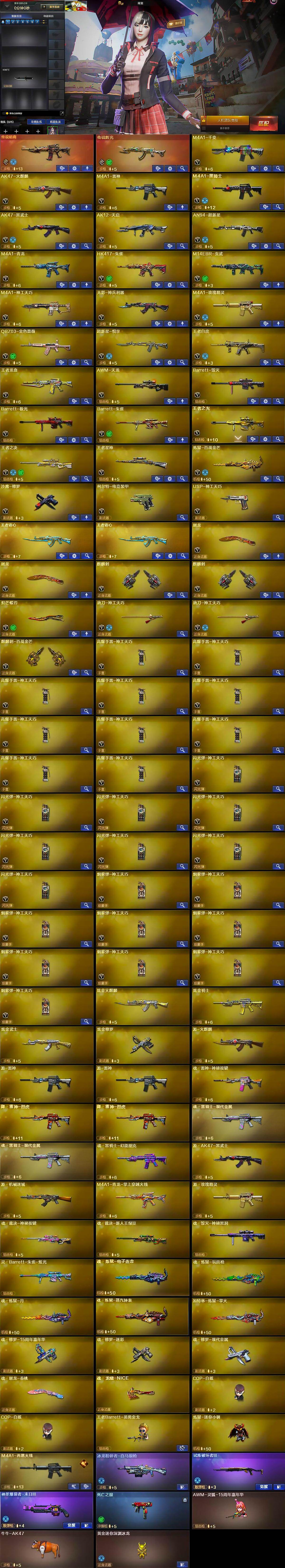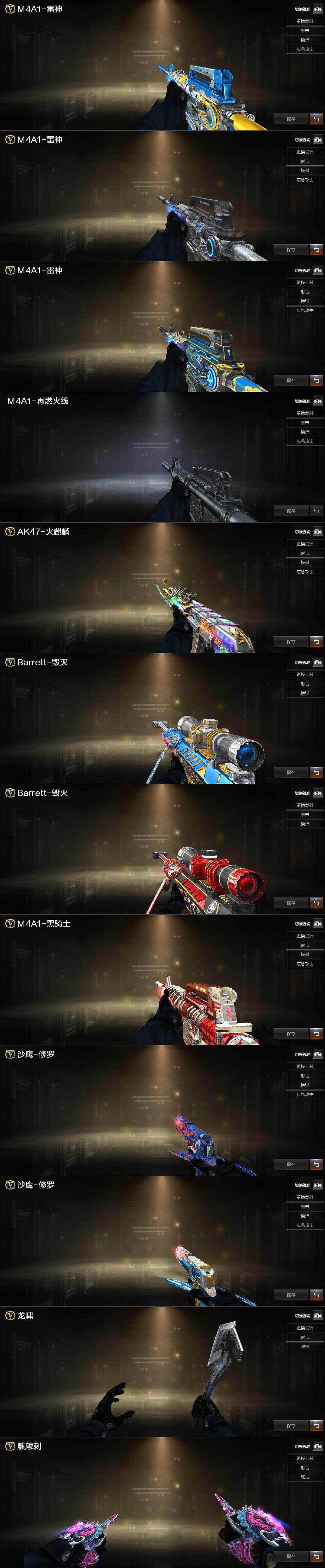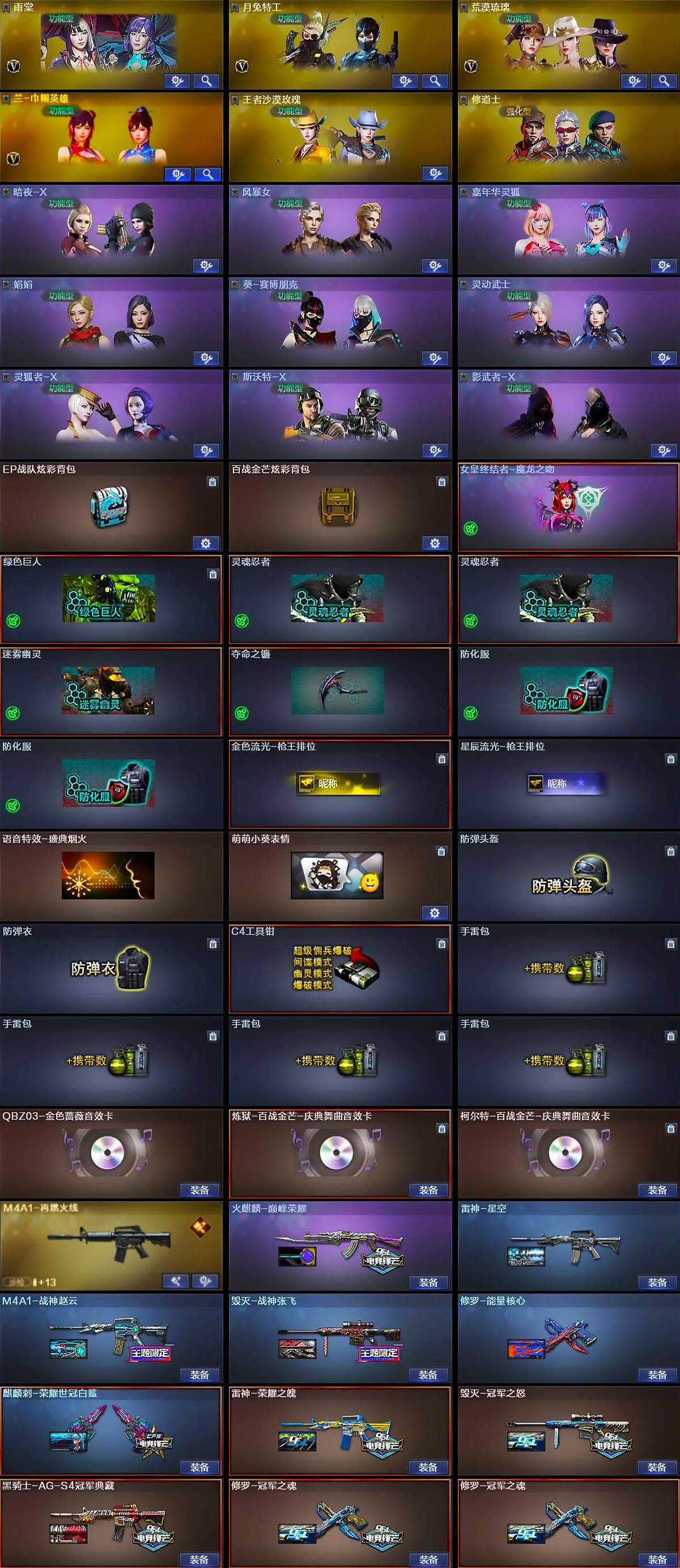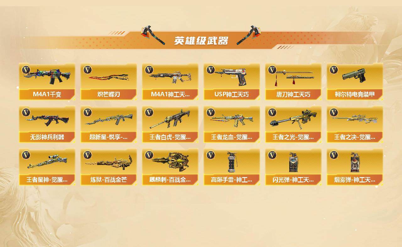 【英雄级武器】:M4A1-千变,AK47-火麒麟,M4A1-雷神,M4A1-黑骑士,AK47-黑武士,AK12-天启,AN94-超新星,M4A1-青龙,HK417-朱雀,M14EBR-玄武,M4A1-神工天巧,无影-神兵利器,M4A1-玫瑰精灵,QBZ03-金色蔷薇,超新星-悦享-觉醒版,王者白虎-觉醒版,王者龙血-觉醒版,AWM-天龙,Barrett-毁灭,Barrett-极光,Barrett-朱雀,王者之光-觉醒版,王者之决-觉醒版,王者星神-觉醒版,炼狱-百战金芒,沙鹰-修罗,柯尔特-电竞装甲,USP-神工天巧,屠龙*2,麒麟刺*2,炽芒蝶刃,唐刀-神工天巧*2,麒麟刺-百战金芒,高爆手雷-神工天巧*10,闪光弹-神工天巧*8,烟雾弹-神工天巧*9