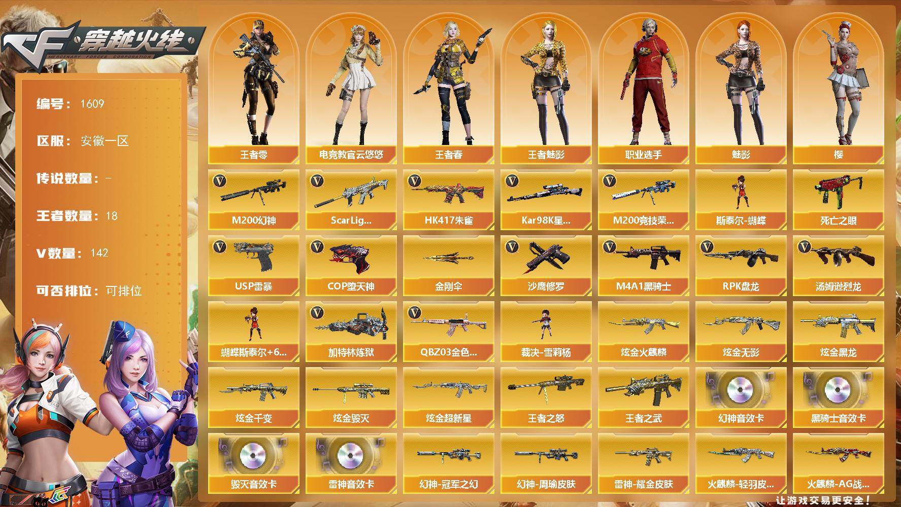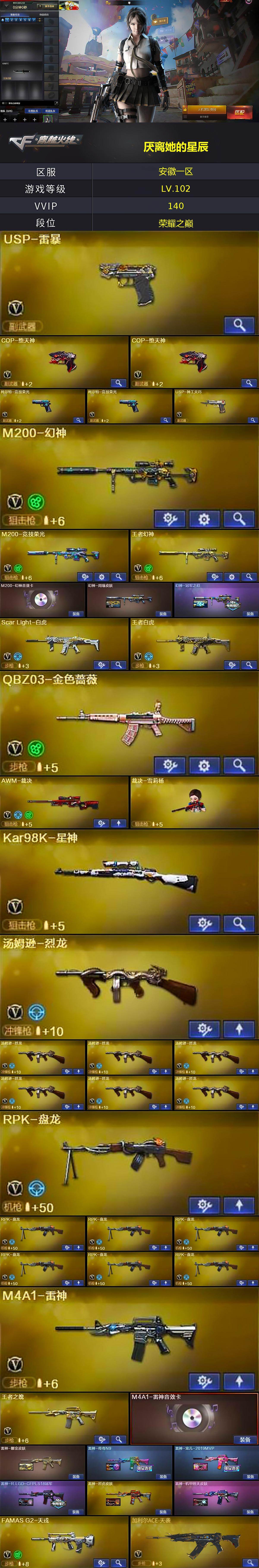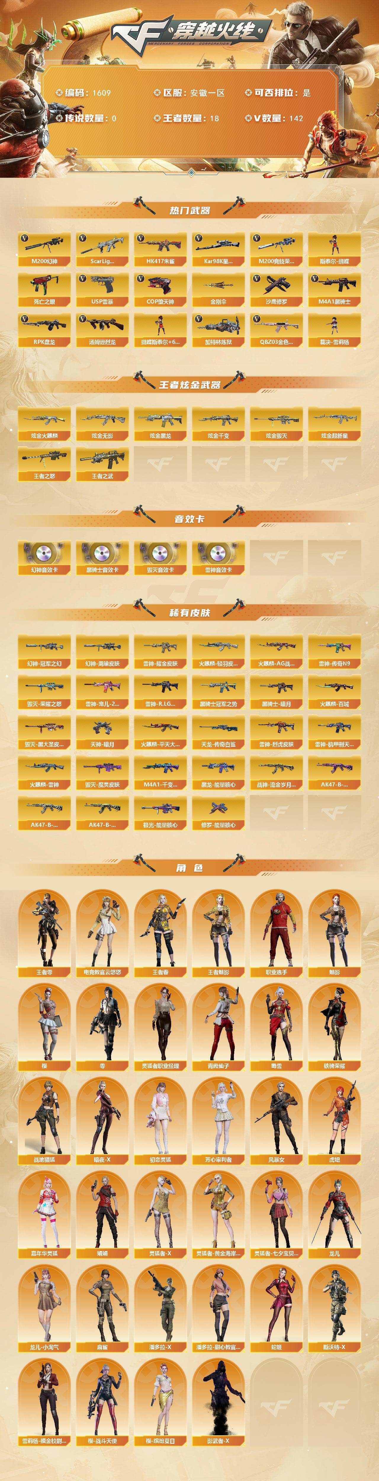 [15659805]安徽一区-142V-18王者-7炫金 【热门武器】:QBZ03-金色蔷薇,Scar Light-白虎,HK417-朱雀,M200-幻神,M200-竞技荣光,死亡之眼,Kar98K-星神,M4A1-黑骑士*5,汤姆逊-烈龙*7,RPK-盘龙*7,加特林-炼狱,斯泰尔-蝴蝶,裁决-雪莉杨,USP-雷暴,COP-堕天神*2,沙鹰-修罗*4,金刚伞 【王者炫金武器】:王者之武,王者之怒,炫金火麒麟,炫金无影,炫金黑龙*2,炫金千变,炫金超新星,炫金毁灭 【音效卡】:M200-幻神音效卡,M4A1-雷神音效卡,M4A1-黑骑士音效卡,Barrett-毁灭音效卡 【皮肤】:幻神-周瑜皮肤,幻神-冠军之幻,雷神-耀金皮肤,雷神-传奇N9,雷神-宠儿-2019MVP,雷神-R.LGD-CFPLS18冠军,雷神-烈虎皮肤,雷神-机甲刑天皮肤,火麒麟-AG战队皮肤,火麒麟-雷神,火麒麟-轻羽皮肤,火麒麟-平天大圣*2,火麒麟-百城*2,毁灭-荣耀之怒,毁灭-黑大圣皮肤,毁灭-魔灵皮肤,M4A1-千变-孔明皮肤,黑龙-能量核心,黑骑士-暗月,黑骑士-冠军之势,战神-流金岁月皮肤,AK47-B-常胜将军-曹操,AK47-B-常胜将军-刘备*2,AK47-B-常胜将军-孙权,AWM-天龙-传奇白鲨,极光-能量核心,修罗-能量核心*2,天神-暗月 【角色】:零,樱,魅影,电竞教官-云悠悠,战地猎狐,王者-零,王者春,王者-魅影,暗夜-X,初恋灵狐,芳心审判者,风暴女*2,虎妞,嘉年华灵狐,娟娟,灵狐者-X,灵狐者-黄金海岸,灵狐者-七夕宝贝,灵狐者-职业经理,龙儿,龙儿-小淘气,麻雀,潘多拉-X,潘多拉-甜心教官,青霞仙子,蛇姬,斯沃特-X,蜀雪,铁骑荣耀,雪莉杨-摸金校尉,樱-战斗天使,樱-缤纷夏日,影武者-X,职业选手 【人偶武器】:裁决-雪莉杨,M4A1-雷神-精英刀锋,斯泰尔-蝴蝶,AWM-灵狐-15周年嘉年华,M37-葵,迷你深渊冰龙,迷你裂空之翼,迷你波特博士,迷你牛牛,迷你生化手雷,生化手雷-机甲核心,深渊终结者手雷,闪光弹-貂蝉,高爆手雷-大乔,迷你艾比,迷你巨石泰坦-魔花研究所,灵狐娃娃手雷 【暴走生化】:黑龙吞噬者,死亡之眼,超级对讲机 【挑战大师】:致命乱世-超越Max,AK47-冰龙粉碎者,冰龙粉碎者-白马银枪,激光毁灭者III-白马银枪,激光毁灭者III,机甲撕裂者